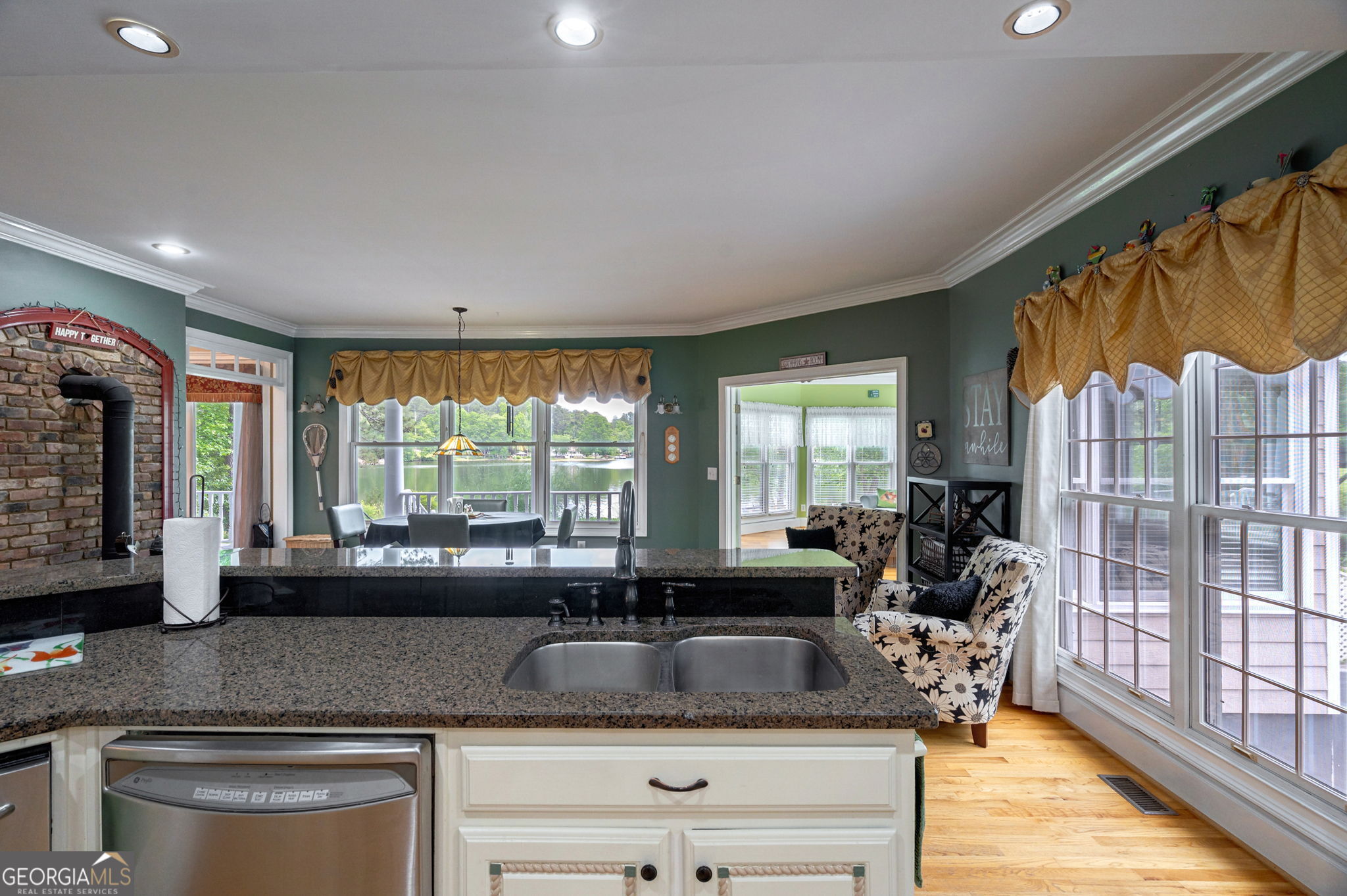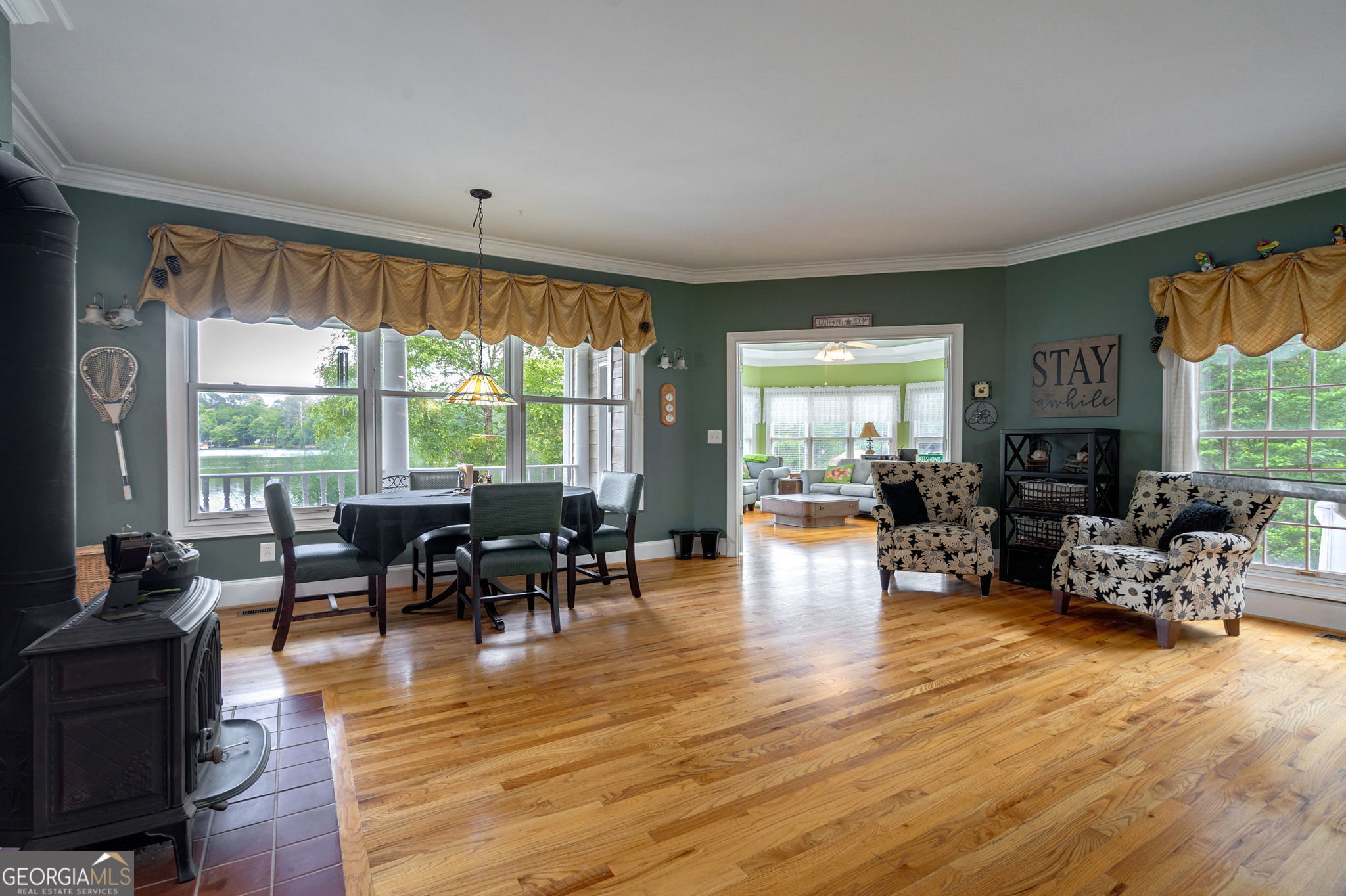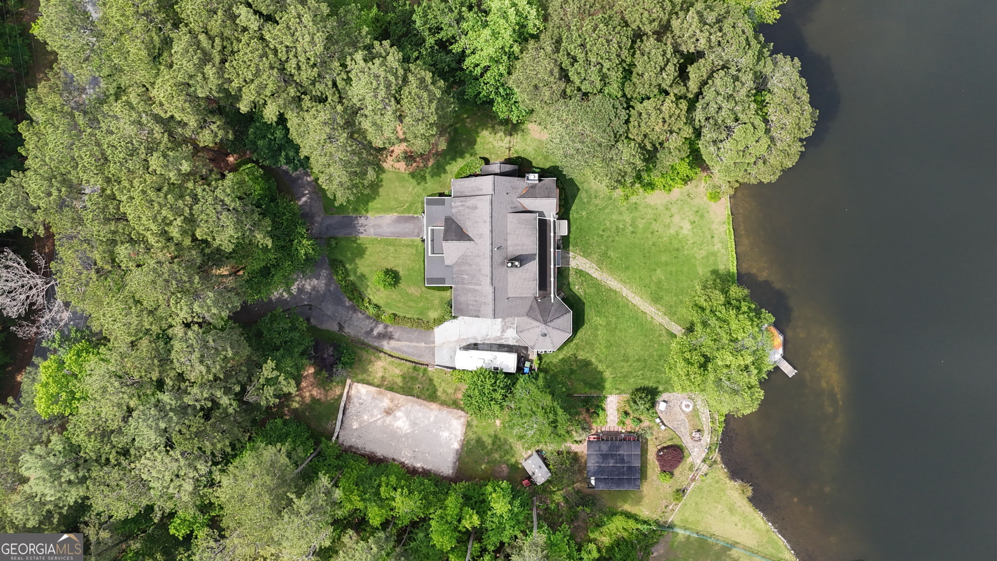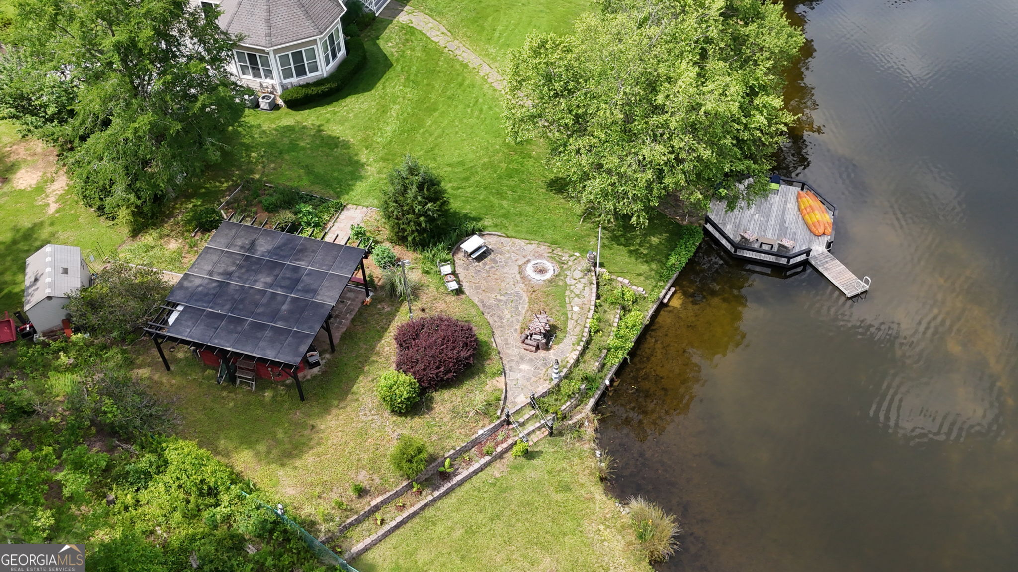 Entertainer's dream Southern Living floorplan on a private lakefront lot with breathtaking views! Almost every room in this home has a view across the water. The lake is spring fed and clear, with a private dock to jump off of for a swim, fish from, or put your kayak in from. The perfect layout inside for effortless entertaining includes a large dining room; a kitchen made for modern entertaining with a cozy wood burning stove; a 2-story living room with a wall of glass to take in the lake view, a fireplace, and access to the expansive back yard; a guest 1/2 bath; and a huge sunroom; all separate, but with flow to each one. The private primary suite on the main has an incredible view of the water from the bay windows. Along with the view this room has an ensuite bath, a multi-purpose room that can be the closet of your dreams, a nursery, a private office, a workout room, whatever your heart desires. A virtual closet has been created to showcase what it could look like with a custom system installed. The laundry room is also connected to this room for easy laundry duty. In addition to the multipurpose room, there is also a walk-in closet with double French doors that would make a fabulous shoe/accessory closet. The additional bedrooms are upstairs, each with their own ensuite bath, and separated by a large loft area with a Juliet balcony overlooking the front of the home. The finished basement area has a 1/2 bath, an interior room that is currently a game room with a ping pong table but would also make an incredible home theater, and heated and cooled area with a kitchenette perfect for keeping snacks and drinks close by for the game room or popcorn for a theater. In addition to the lake outdoors there is also a hot tub (that will remain with the home) to relax in after a long day of playing volleyball on your own sand volleyball court. The 2 1/2 car drive under garage has plenty of room for 2 vehicles and a workshop area or storage. There are solar panels installed on the pergola over the outdoor kitchen (not on the home's roof) and are paid for, so no lease hassle, and all the benefits of little to no electric bill (in a home this size it saves the homeowners hundreds per month especially in our hot Georgia summers). This home really has it all!