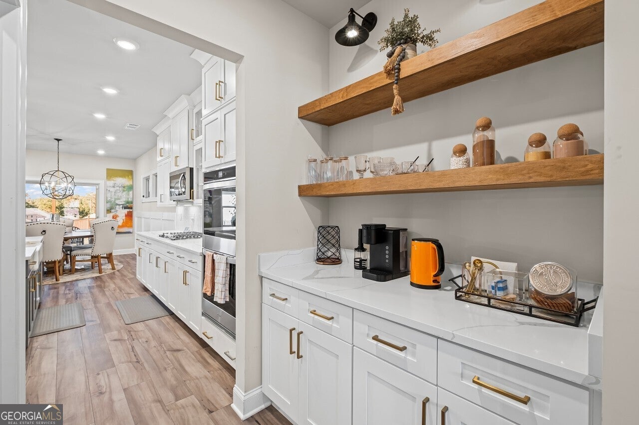 Welcome to modern elegance in the heart of Woodstock's sought-after Riverside Estates neighborhood. This beautifully crafted home showcases timeless hardwood floors and an open, thoughtfully designed floorplan that blends sophistication with everyday comfort. The family room is bright and inviting, featuring a classic brick fireplace framed by custom hardwood floating shelves and abundant natural light. The open layout connects seamlessly to the kitchen and breakfast area, creating a spacious and welcoming environment perfect for both daily living and entertaining. The chef's kitchen is a showpiece with quartz countertops, stainless steel appliances, an expansive island, and a walk-in pantry. A newly added coffee bar enhances both style and convenience, offering the perfect spot to start your day or entertain guests. The adjoining breakfast area opens directly to the patio and fenced backyard, ideal for outdoor dining and relaxation. A separate dining room provides an elegant setting for hosting dinners and special occasions, blending formal charm with the home's modern design. A striking accent wall along the staircase adds architectural interest and connects the main and upper levels with thoughtful detail. Upstairs, a versatile open area provides flexible space for a second living room, playroom, or home office. The primary suite offers a serene retreat with a luxurious ensuite bath and spacious walk-in closet. Set within the friendly Riverside Estates community, this home offers the perfect balance of tranquility and convenience. Enjoy close proximity to top-rated schools, parks, shopping, and dining in vibrant downtown Woodstock. 490 Payne Rd blends contemporary finishes, open-concept living, and designer touches throughout, creating a home that feels both refined and welcoming.