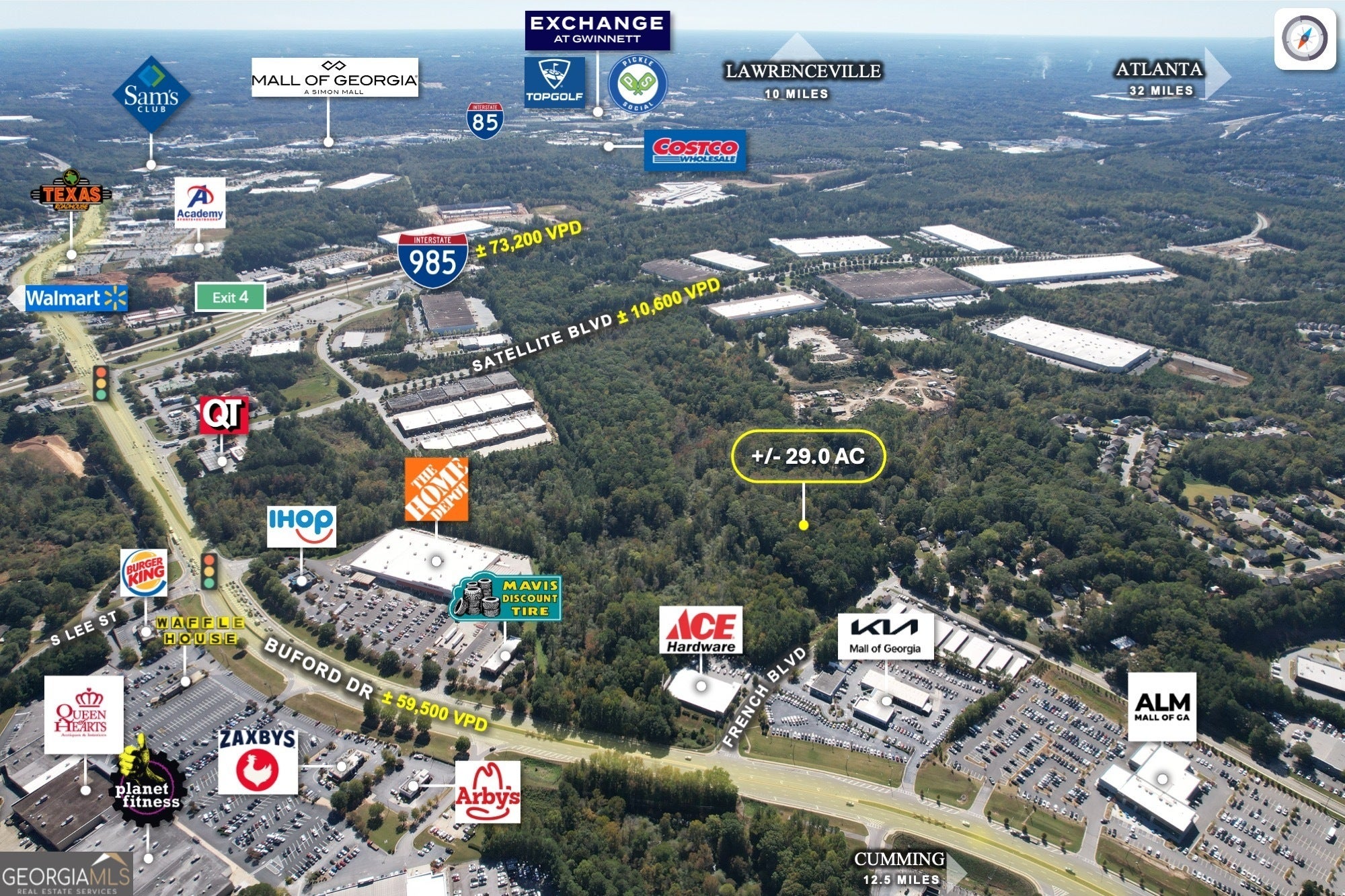 PROPERTY OVERVIEW Norton Commercial is proud to present a +/- 29.0-acre land opportunity located off French Blvd, just south of Buford Drive (GA Hwy 20 in the Mall of Georgia corridor. The property features C-2 & R-100 zoning, providing exibility for a wide range of potential uses, including commercial, residential, or light industrial development. An abandoned road (Mason Mill Rd runs through the property, and all utilities are available including sewer with multiple man holes on site. Approximately 13 acres are upland, with the remaining 16 acres within oodplain or stream-setback areas, offering a balanced mix of usable acreage and natural buffers. The site's size, access, and zoning diversity make it a highly adaptable opportunity in one of Gwinnett County's most active growth corridors. LOCATION OVERVIEW Located just 2.5 miles from the Mall of Georgia and near The Exchange at Gwinnett, the property benets from exceptional regional connectivity and access to major retail, dining, and employment centers. French Blvd connects directly to Buford Drive, a primary commercial corridor, and the site is positioned just off I-985 Exit 4, ensuring convenient access throughout North GA and Metro Atlanta. The property is within the Buford City School District, ranked #1 in Georgia for overall excellence. This award-winning district is recognized for its academic rigor, championship athletics, and strong community culture, making it one of the state's most desirable. Buford Academy, Buford MS, and Buford HS continue the district's tradition of excellence and community pride.Surrounded by strong residential and commercial growth, this location presents an outstanding opportunity for future mixed-use, investment or redevelopment projects.