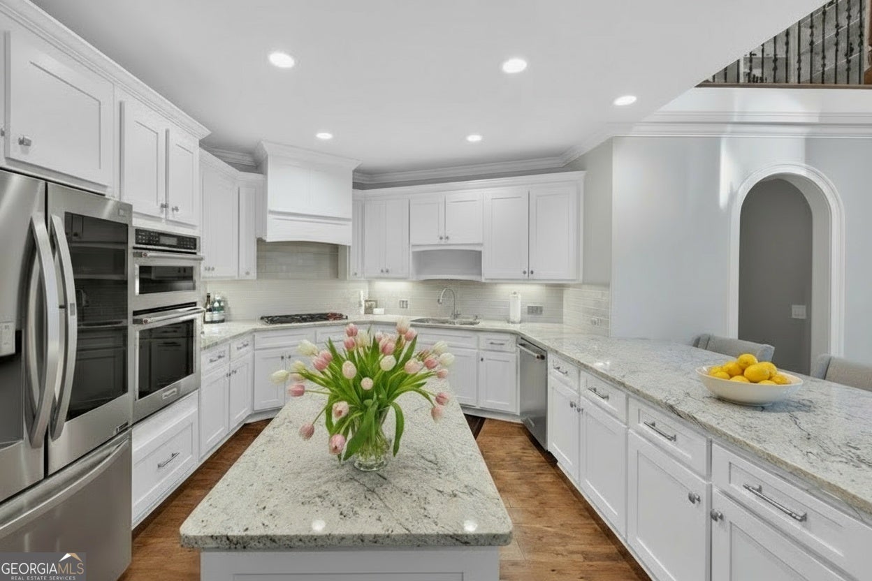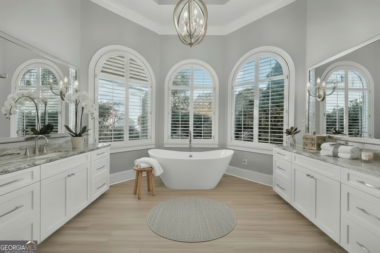 Welcome to your dream home on a quiet cul-de-sac, backing up to the 8th hole of The Golf Club of Georgia. Privately tucked within Greatwood Glen, one of Windward's most exclusive gated communities, this home has been beautifully updated with over $200K in luxury upgrades. The grand entry opens to a bright, open-concept living and dining area that flows effortlessly to a peaceful patio - perfect for relaxing or entertaining. The owner's suite on the main level offers a double-sided fireplace, French doors, and a spa-inspired bath with a soaking tub and designer finishes. The gourmet kitchen features top-of-the-line stainless steel appliances and overlooks the two-story family room. Upstairs are three spacious bedrooms and two fully renovated baths with elegant finishes. Greatwood Glen is known for its park-like setting and golf course lots. Residents enjoy optional memberships to the Windward Lake Club with tennis, pools, and marina access, or to the Golf Club of Georgia nearby. All this, just under five miles from Avalon and close to major employers, luxury shopping, and dining - in one of North Fulton's top-rated school districts. This home offers the best of luxury, location, and lifestyle.