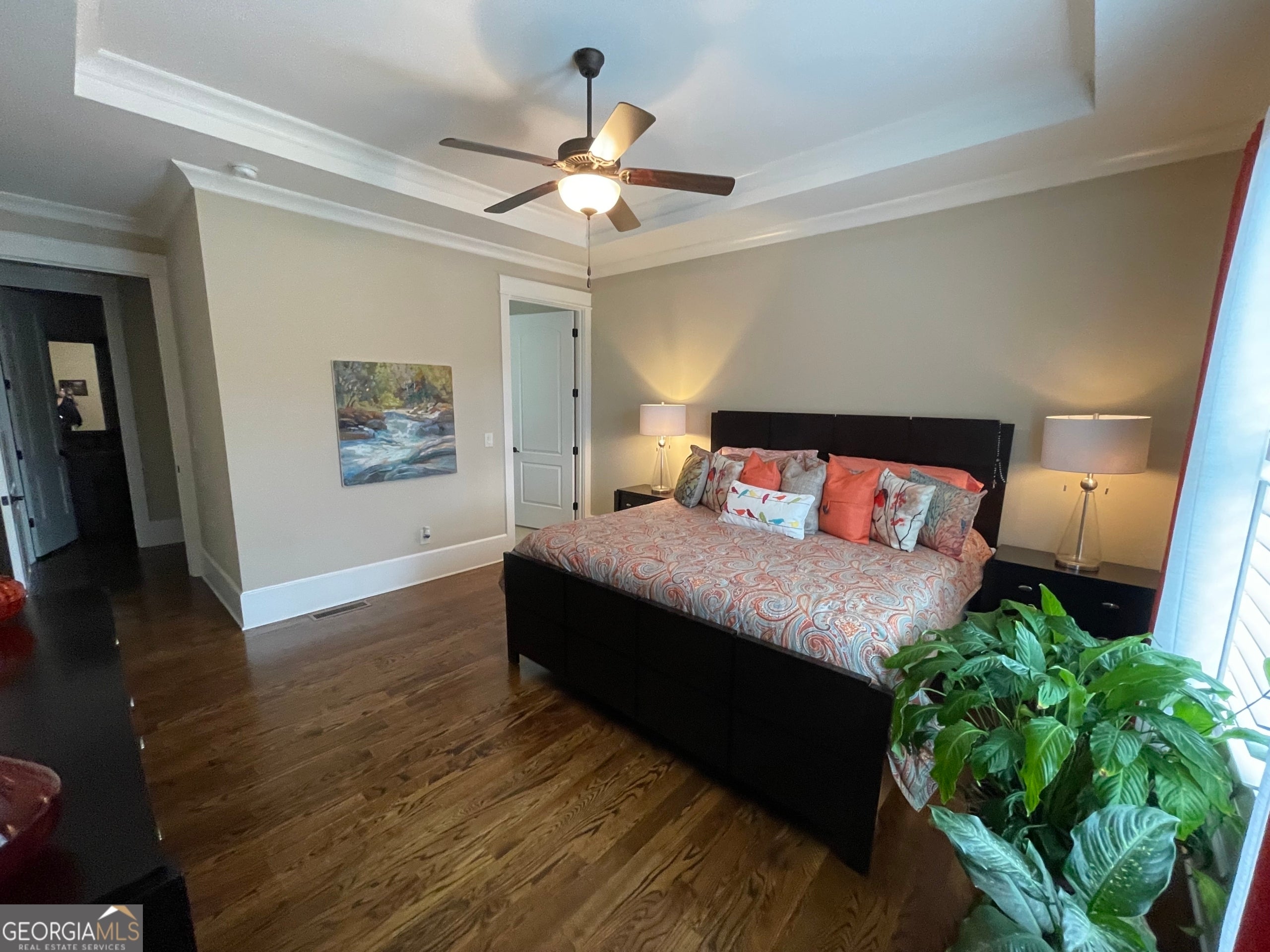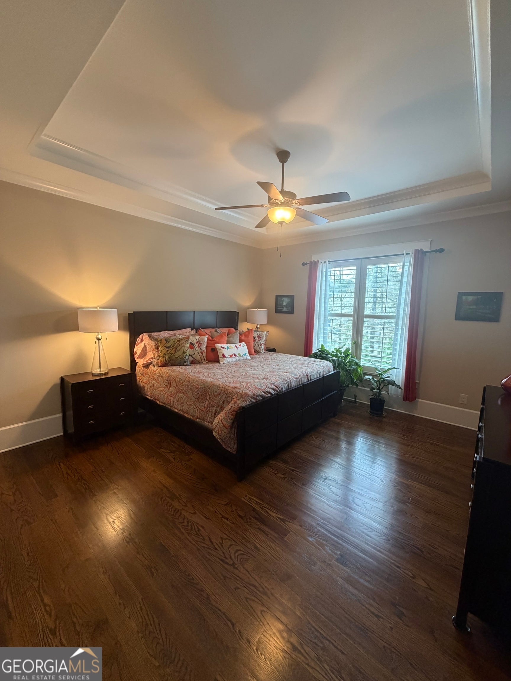 - Interior FeaturesBeamed Ceilings, High Ceilings, Pulldown Attic Stairs, Tray Ceiling(s), Walk-In Closet(s)