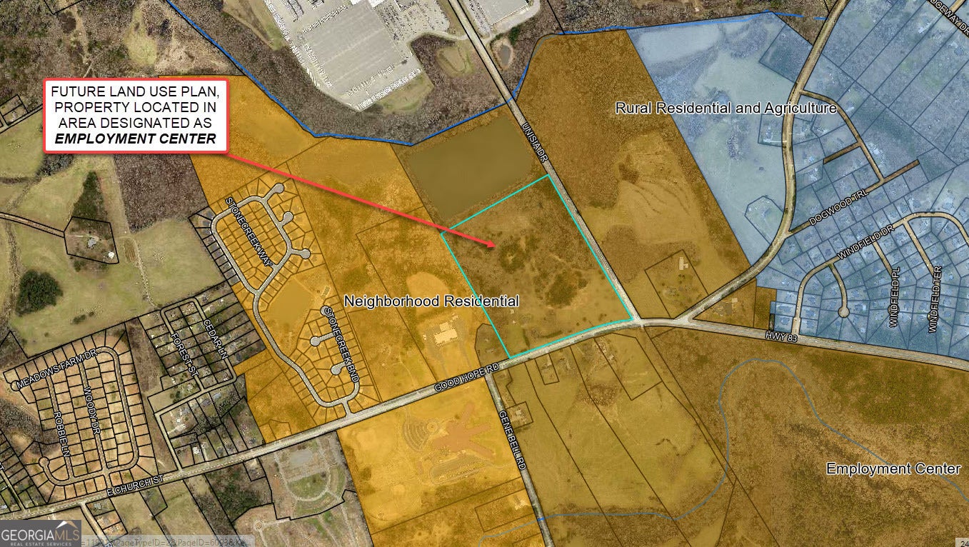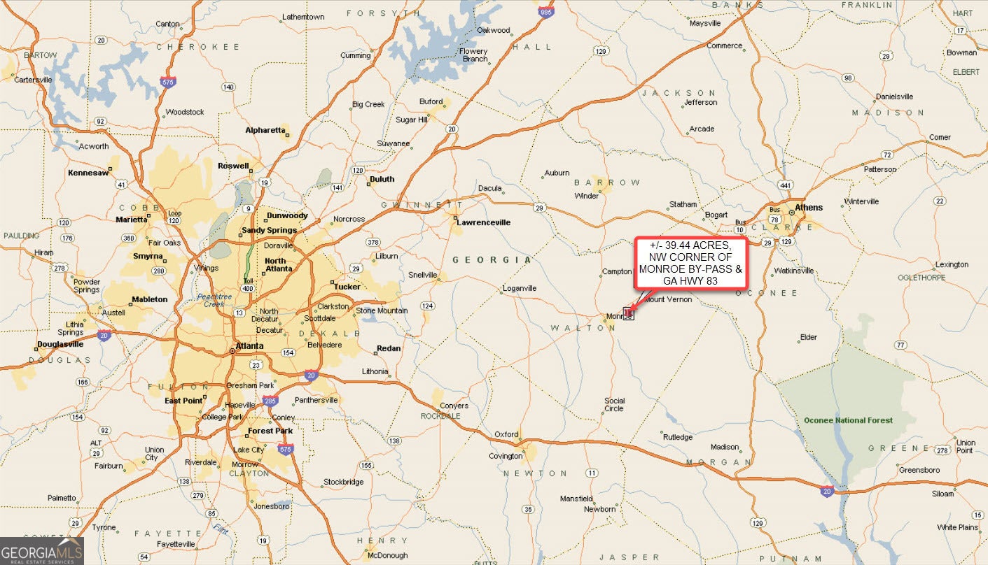 POTENTIAL INDUSTRIAL OR COMMERCIAL. This listing consists of a (+/-) 39.44-acre tract of land located on the northwest corner of a 4-way intersection of Georgia Highway 83 (also known as Good Hope Road) and Unisia Drive. The recently constructed Monroe By-Pass connects into Unisia Drive along the subject site at the adjoining 4-way intersection which is controlled by a traffic signal. The recently constructed adjoining Monroe By-Pass provides an alternate route around the downtown historic district of the city of Monroe and connects Georgia Highway 11, Georgia Highway 83, and U.S. Highway 78. The site contains (+/-) 1,159-linear feet of frontage along the north side of Georgia Highway 83 (also known as Good Hope Road) and has (+/-) 1,583-linear feet frontage along the west side of Unisia Drive. The (+/-) 1,583-linear foot section of Unisia Drive connects the Monroe-Bypass at the adjoining 4-way intersection. The Walton County future use plan designates the area surrounding the Monroe-Bypass, including the property, as Employment Center. The future use plan designation of Employment Center includes industrial and commercial uses. The site is currently zoned for A-2, rural estate, and R-1, single-family residential, use. The property is on the south boundary of an existing industrial district that contains several major industrial employers including a Walmart distribution center, a Hitachi manufacturing facility, a Tucker Door & Trim manufacturing facility, a Novolex-Doro Bag manufacturing facility, and a commercial greenhouse facility. The Georgia Department of Transportation reports that the average daily traffic count along the section of Georgia Highway 83 (Good Hope Road) adjoining the property is 5,600 vehicles per day, and the average daily traffic count along the section of Unisia Drive adjacent to the property is 9,230 vehicles per day; the property has good visibility from all adjacent lanes of traffic. The property is located (+/-) 2.25 miles east of the historic central business district in the city of Monroe, (+/-) 41 miles east of downtown Atlanta, and (+/-) 21 miles southwest of Athens, Georgia. The site has easy access to U.S. Highway 78 via Unisia Drive which intersects U.S. Highway 78 (+/-) 1.1 miles north of the subject site (intersection controlled by a traffic signal). U.S. Highway 78 provides Walton County and the property with access to Atlanta and Athens, Georgia. The recently constructed Monroe By-Pass also provides the site with easy access to Georgia Highway 11. The property contains an older (+/-) 2,014-square-foot single-family dwelling unit, a detached garage with a second-level apartment, a utility building, and a barn. The property is shown by appointment only.