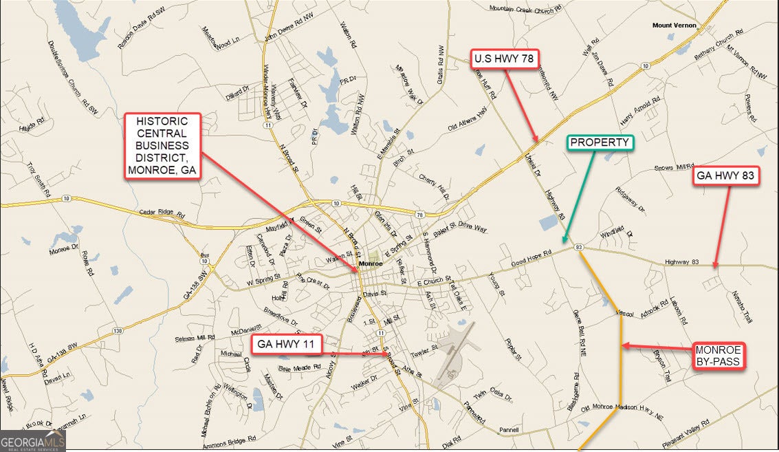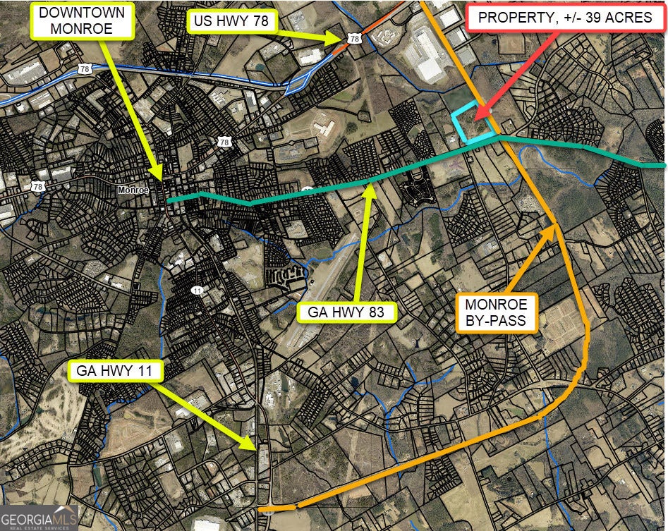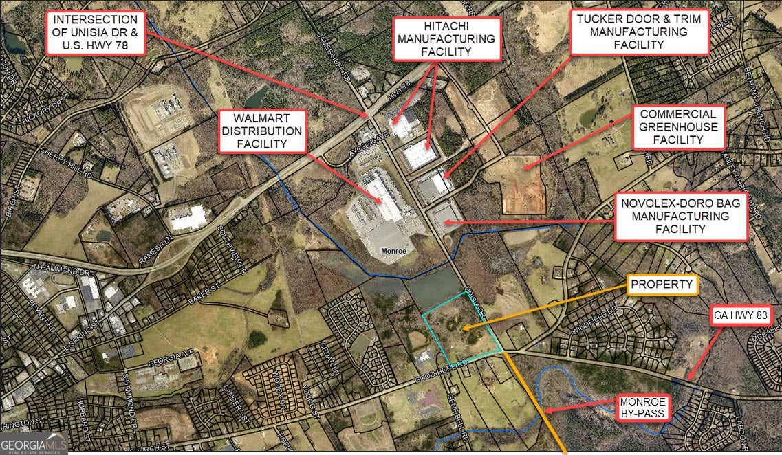 POTENTIAL INDUSTRIAL OR COMMERCIAL. This listing consists of a (+/-) 39.44-acre tract of land located on the northwest corner of a 4-way intersection of Georgia Highway 83 (also known as Good Hope Road) and Unisia Drive. The recently constructed Monroe By-Pass connects into Unisia Drive along the subject site at the adjoining 4-way intersection which is controlled by a traffic signal. The recently constructed adjoining Monroe By-Pass provides an alternate route around the downtown historic district of the city of Monroe and connects Georgia Highway 11, Georgia Highway 83, and U.S. Highway 78. The site contains (+/-) 1,159-linear feet of frontage along the north side of Georgia Highway 83 (also known as Good Hope Road) and has (+/-) 1,583-linear feet frontage along the west side of Unisia Drive. The (+/-) 1,583-linear foot section of Unisia Drive connects the Monroe-Bypass at the adjoining 4-way intersection. The Walton County future use plan designates the area surrounding the Monroe-Bypass, including the property, as Employment Center. The future use plan designation of Employment Center includes industrial and commercial uses. The site is currently zoned for A-2, rural estate, and R-1, single-family residential, use. The property is on the south boundary of an existing industrial district that contains several major industrial employers including a Walmart distribution center, a Hitachi manufacturing facility, a Tucker Door & Trim manufacturing facility, a Novolex-Doro Bag manufacturing facility, and a commercial greenhouse facility. The Georgia Department of Transportation reports that the average daily traffic count along the section of Georgia Highway 83 (Good Hope Road) adjoining the property is 5,600 vehicles per day, and the average daily traffic count along the section of Unisia Drive adjacent to the property is 9,230 vehicles per day; the property has good visibility from all adjacent lanes of traffic. The property is located (+/-) 2.25 miles east of the historic central business district in the city of Monroe, (+/-) 41 miles east of downtown Atlanta, and (+/-) 21 miles southwest of Athens, Georgia. The site has easy access to U.S. Highway 78 via Unisia Drive which intersects U.S. Highway 78 (+/-) 1.1 miles north of the subject site (intersection controlled by a traffic signal). U.S. Highway 78 provides Walton County and the property with access to Atlanta and Athens, Georgia. The recently constructed Monroe By-Pass also provides the site with easy access to Georgia Highway 11. The property contains an older (+/-) 2,014-square-foot single-family dwelling unit, a detached garage with a second-level apartment, a utility building, and a barn. The property is shown by appointment only.