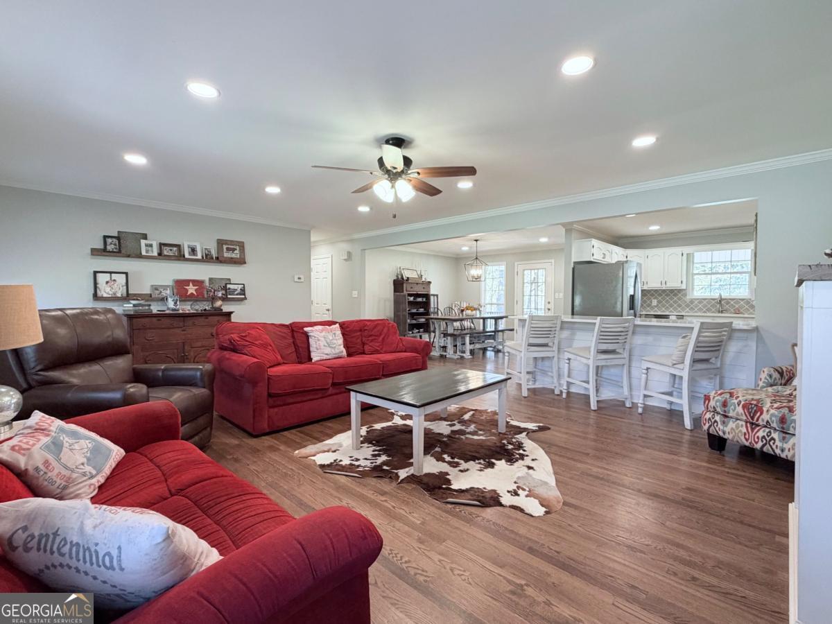 Enjoy peaceful country living in this four-sided brick ranch situated on approximately 7 acres with creek frontage in the back! Featuring a relaxing front porch and an expansive back porch overlooking beautiful farm views. Inside, the open floor plan connects the kitchen, dining, and living areas-enhanced by recessed lighting, hardwood flooring in the main living areas and master bedroom, and abundant natural light. The kitchen offers a large island, stainless steel appliances, and white quartz countertops. The spacious master suite includes a large bath footprint and walk-in closet. Additional features include a half bath located in the oversized laundry room with extra cabinetry and storage, plus a two-car garage. Outside, you'll find an outbuilding with power-perfect for a small workshop or storage for lawn equipment. Move-in ready and designed for comfortable, easy living. This home is approximately 10 minutes from Downtown Cave Spring.