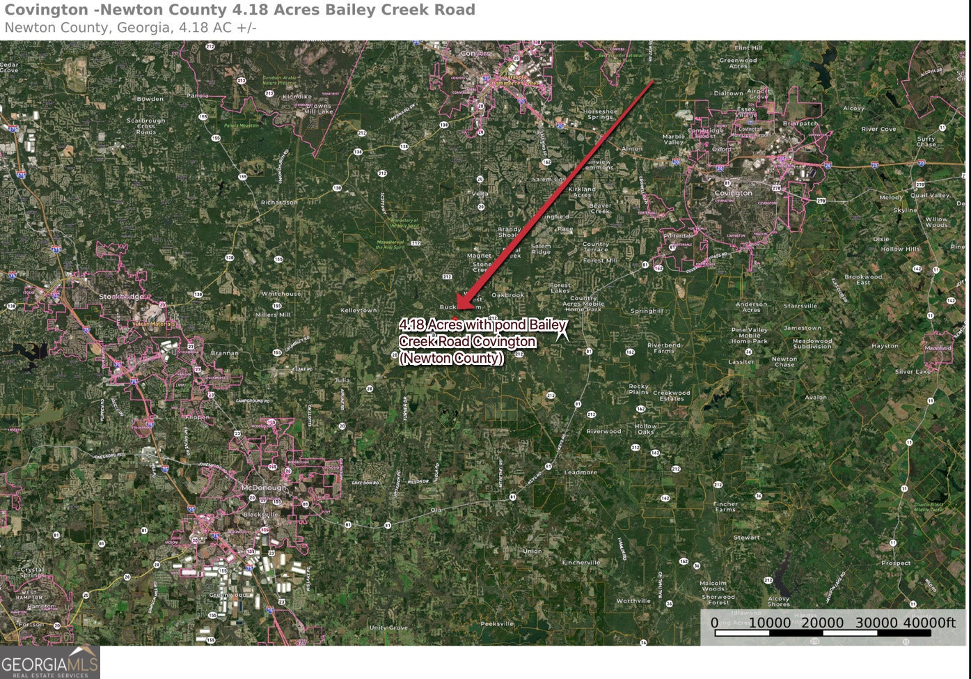 Welcome to 4.18 acres along Bailey Creek Road in Covington, Newton County. This beautiful property features approximately 415 feet of paved road frontage and a picturesque 0.70-acre pond, creating an ideal setting for a homesite or private retreat. Conveniently located near Covington, it offers the perfect blend of suburban comfort and easy access to metro Atlanta-just 10-15 minutes to Conyers for everyday shopping and dining, 15-20 minutes to Monroe and Loganville for additional retail and small-town charm, and 30-35 minutes to downtown Atlanta. Residents enjoy both tranquility and connectivity, with nearby attractions such as Covington's historic square, scenic parks, and local lakes for outdoor recreation. This area of the county requires septic and well. For navigation, use the neighboring residence at 2006 Bailey Creek Rd, Covington, GA 30016 or coordinates 33.53299, -84.02987. Contact the listing agent for an interactive property map.