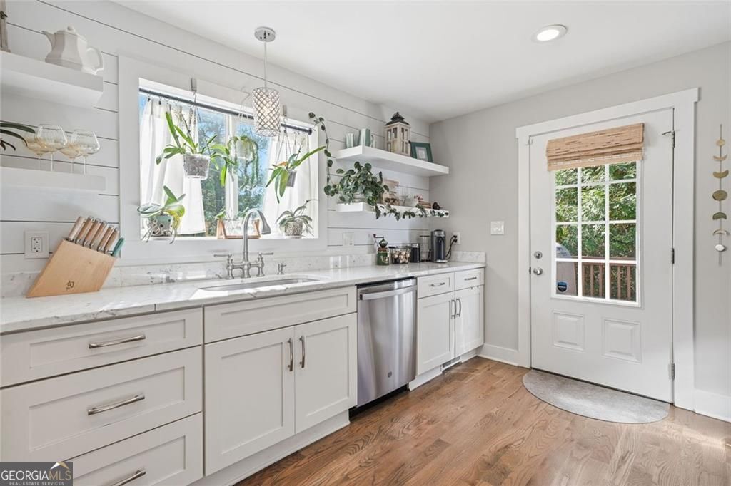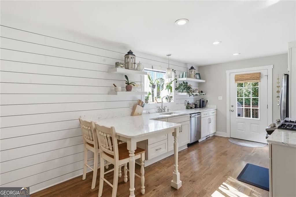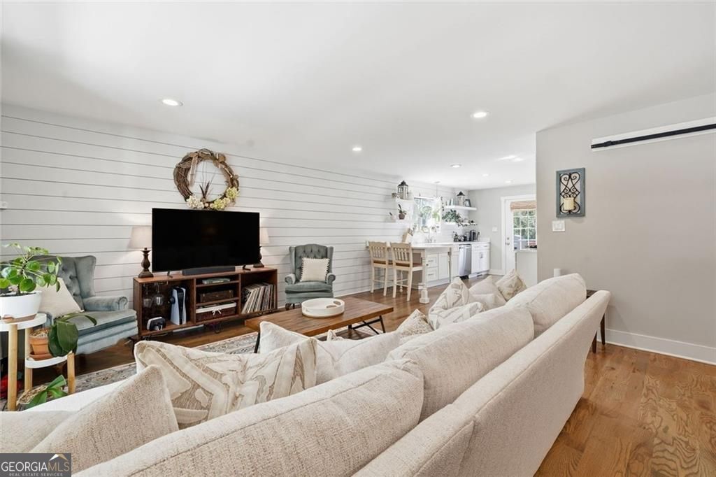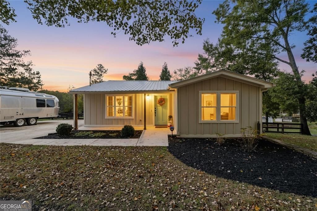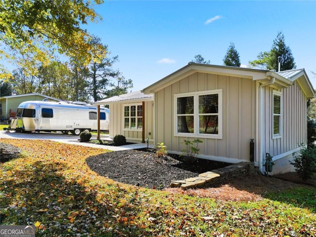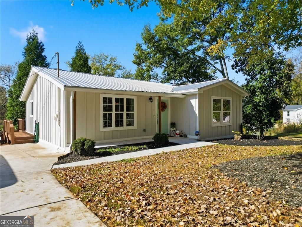Step inside this thoughtfully rebuilt ranch and enjoy single-level living with smart, stylish finishes throughout, all set on a spacious half-acre lot with a metal roof and modern curb appeal. At the heart of the home, the open-concept living area is bright and welcoming, centered around a custom kitchen designed for both ease and style. Premium white Carrera marble countertops (with lifetime warranty), open shelving, tile backsplash, and soft-close cabinetry frame stainless steel GE appliances. A deep pantry, farmhouse light fixtures, and a breakfast bar create space to prep, gather, and unwind. Real hardwood floors run throughout, while recessed LED lighting and Lutron dimmer switches in the main living areas and bedrooms give you full control over the ambiance. The primary bedroom feels like a private retreat with its shiplap accent wall and French doors leading to the oversized back deck, recently stained with IR-reflective stain and now with added stairs for easy backyard access. The en suite bathroom features a walk-in shower with new glass enclosure, marble counters, dual sinks, and a sliding barn door. The second bedroom is light-filled and close to a hall bath with a full tub and sleek tile finishes. Out back, the large fenced yard offers privacy and plenty of room to garden, host, or recharge. A new stone retaining wall adds structure near the end of the driveway, and the walk-in crawlspace gives you dry, covered storage. There's also a large shed, and room to park an RV. Additional features include a 2021 water heater and septic tank cap, SimpliSafe home security system with doorbell cam and keypad lock, spray foam attic insulation, and a termite plan with Sentricon bait stations. Trees and debris have been cleared for cleaner lines and better use of space. Taken down to the studs and fully rebuilt in 2020, this home is move-in ready and made for living.