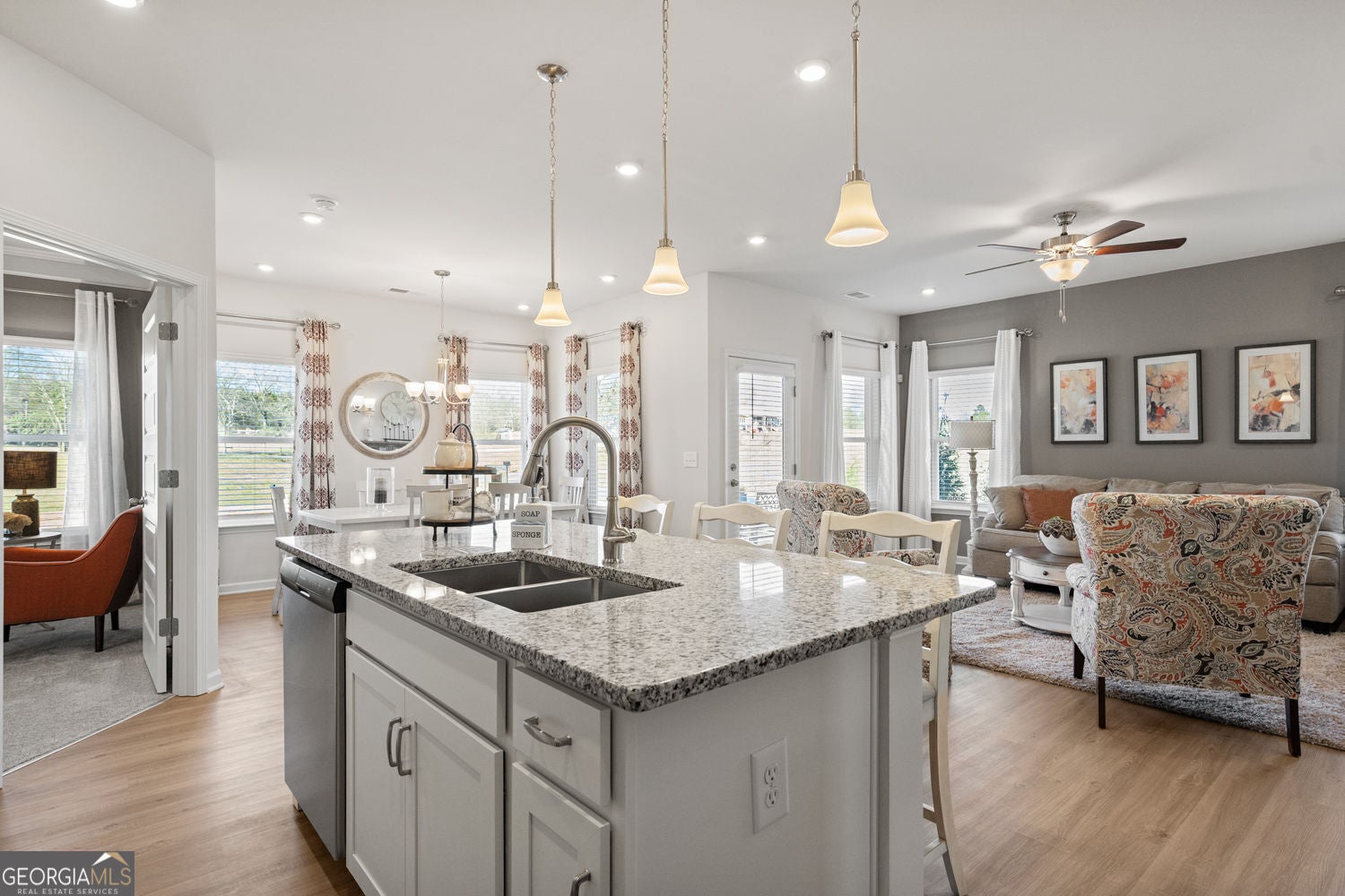 Move-in Ready! The Langford ranch plan by Smith Douglas Homes, located in the charming community of Laurel Ridge. Discover the ease of single-level living in this beautifully designed new construction home that combines comfort, style, and functionality. Step into a light-filled open-concept layout where everyday living feels effortless. The spacious family room with an electric fireplace creates a warm and welcoming atmosphere, ideal for relaxing evenings or entertaining guests. The open island kitchen features granite countertops, and abundant cabinet space, seamlessly connecting to the bright dining area overlooking the back yard. The covered porch is perfect for outdoor dining or morning coffee. The tray-ceiling primary suite offers a luxurious retreat with a spa-inspired tiled shower, dual vanities, and a walk-in closet that provides direct access to the oversized laundry room for added convenience. LVP flooring flows throughout the main living areas, providing easy maintenance. Experience a lifestyle where comfort meets convenience-where open spaces, designer finishes, and quality craftsmanship come together in a home built for the way you live today. Nestled in the desirable Rock Springs area, this home offers proximity to local parks, shopping, and dining while maintaining a peaceful, small-town feel. Enjoy low-maintenance new construction living. Nine ft ceiling heights throughout the home. Special incentives with the use of our preferred lender. Primary photo of home secondary photos representative of plan not of actual home.