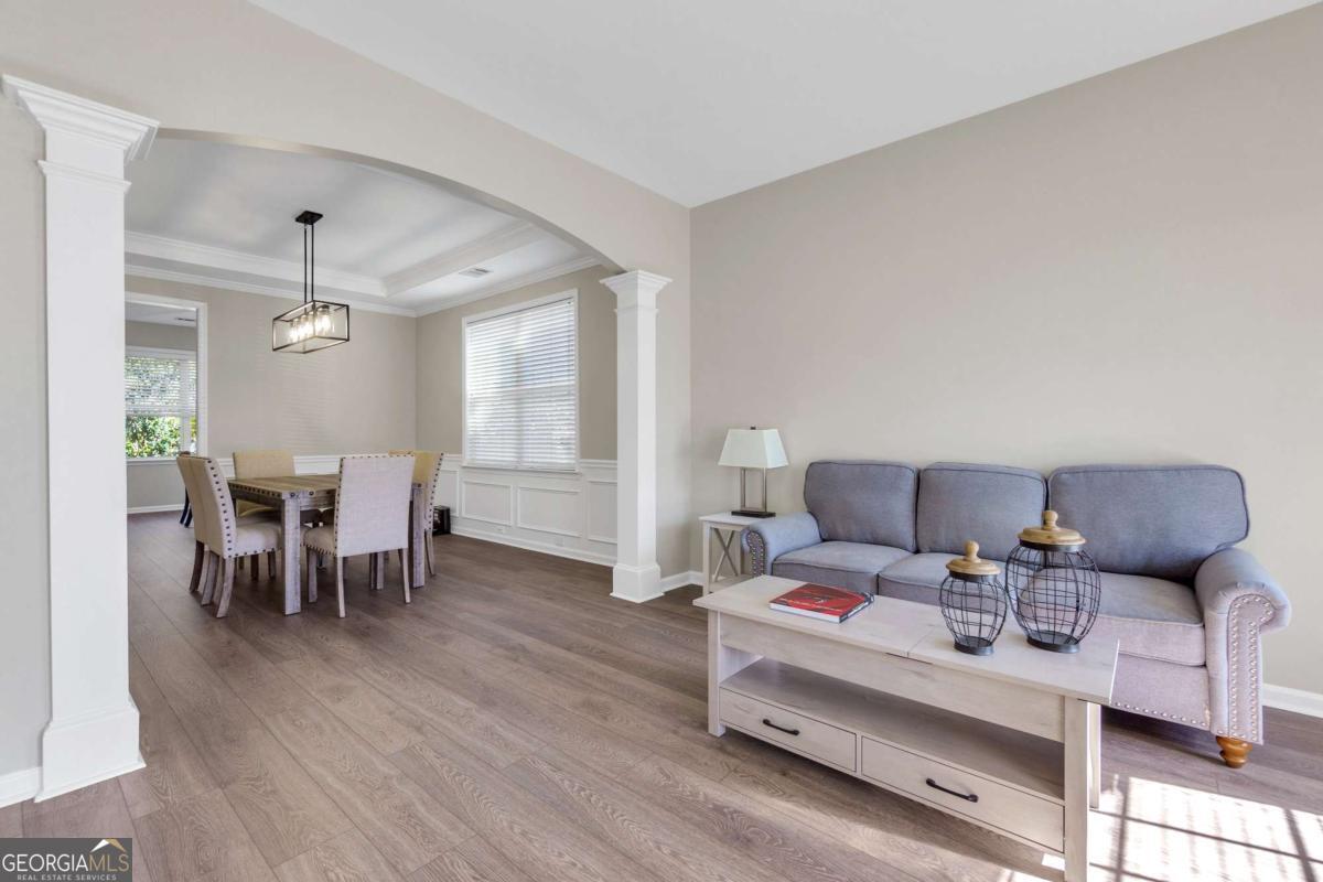 Welcome home to this spacious and sun-filled 4 bedroom retreat, where charm and comfort blend effortlessly. A beautiful wraparound front porch invites you to slow down, sip your morning coffee, and enjoy the serenity of the level, fenced yard. Step through the grand two-story foyer, where wrought iron stair railings lead the eye upward and set the tone for the elegant details throughout. The heart of the home is the inviting great room with a cozy fireplace, perfect for family gatherings and quiet evenings alike. Just beyond, the expansive kitchen shines with a large island, breakfast bar, and a walk-in pantry that makes organization a breeze. Even the chic half bath offers a touch of personality with its striking wood accent wall. Graceful arches frame the formal living and dining rooms, complete with columns and wainscoting that add timeless character. Upstairs, the luxurious master suite is a true retreat, featuring a trey ceiling, private sitting room or office, and an impressive walk-in closet. Three additional bedrooms and a spacious loft provide plenty of room for family, guests, or hobbies. With award winning schools and outstanding community amenities, this home offers the perfect setting to create lasting memories.