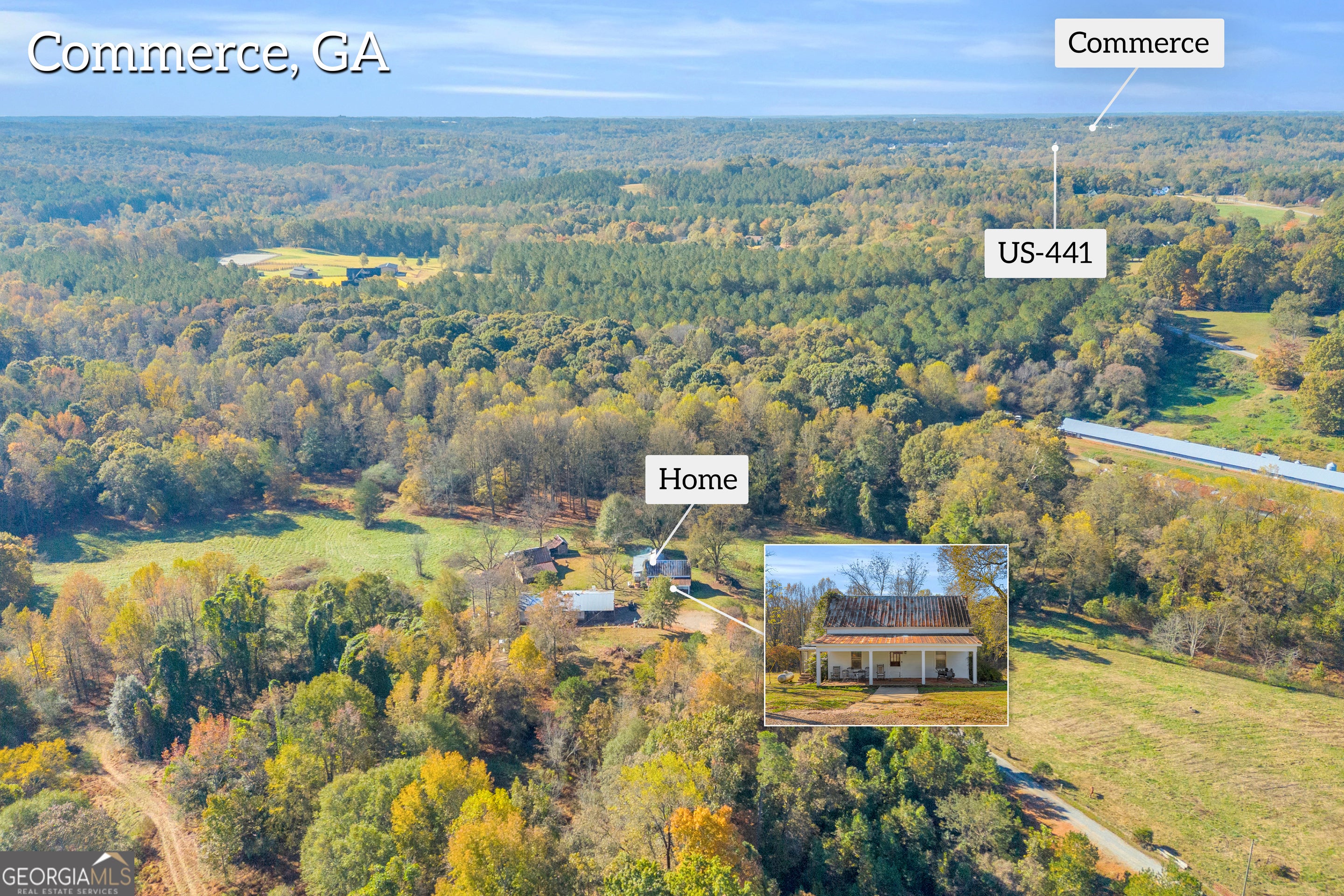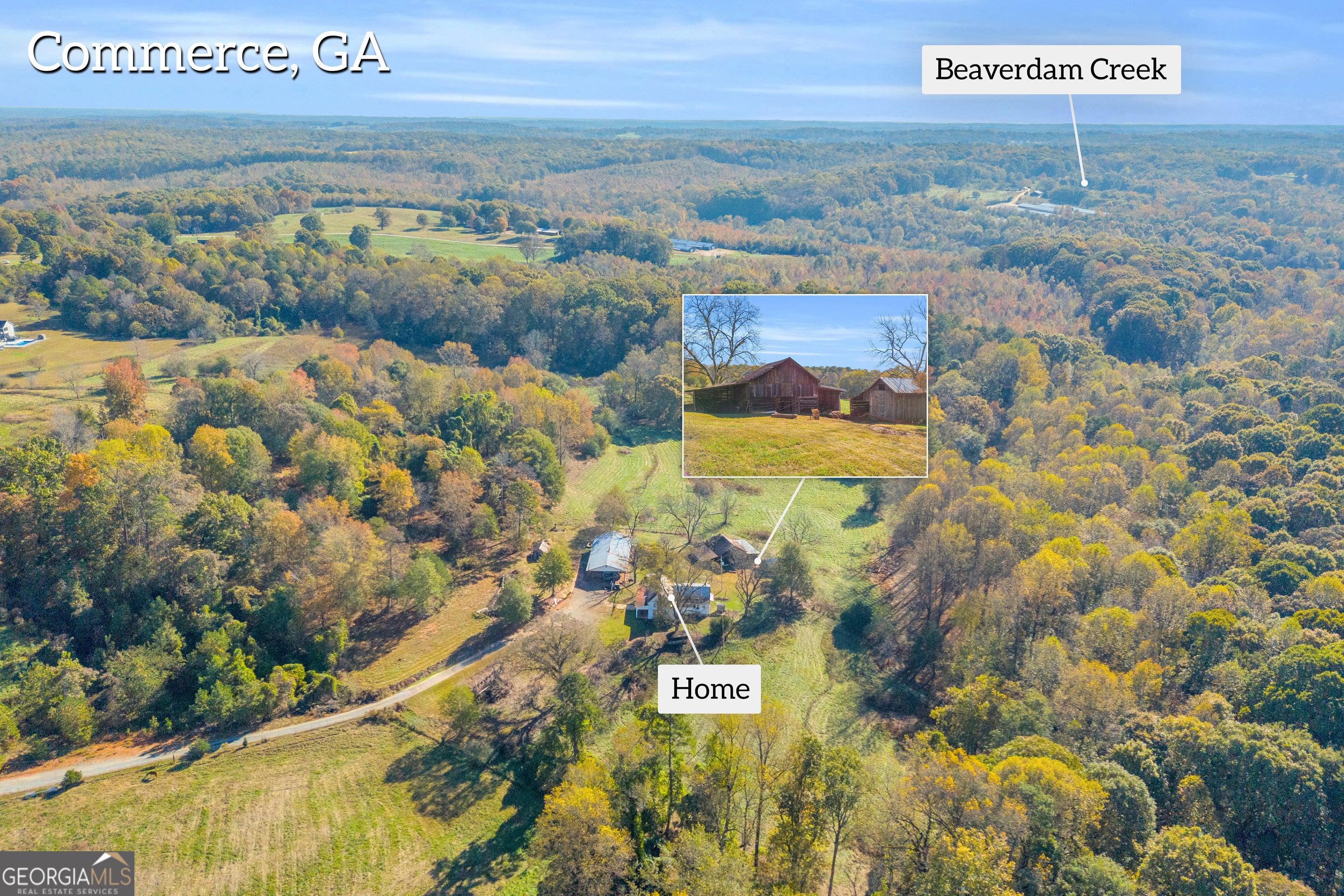 Bring your vision and make this remarkable property your own! Situated on 41.65 acres just outside Commerce, this farm features a 2,323 sq ft home ready for renovation, a 52x32 shop building, 30x60 barn, 6x20 shed, and an additional storage structure. The land is a beautiful mix of open pasture, hardwoods, and mature Poplar, Black Walnut, Pecan, and Oak trees. You'll also find muscadines, a large scuppernong vineyard, and a peaceful creek that winds through the property. Granite-top picnic tables make the perfect spot for outdoor gatherings and cookouts. With established infrastructure, natural beauty, and usable acreage, this property offers endless opportunities for farming, livestock, or creating your dream homestead-all just minutes from I-85 and downtown Commerce.