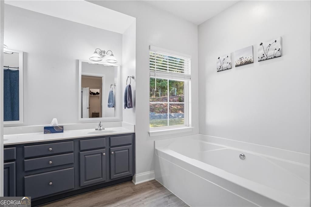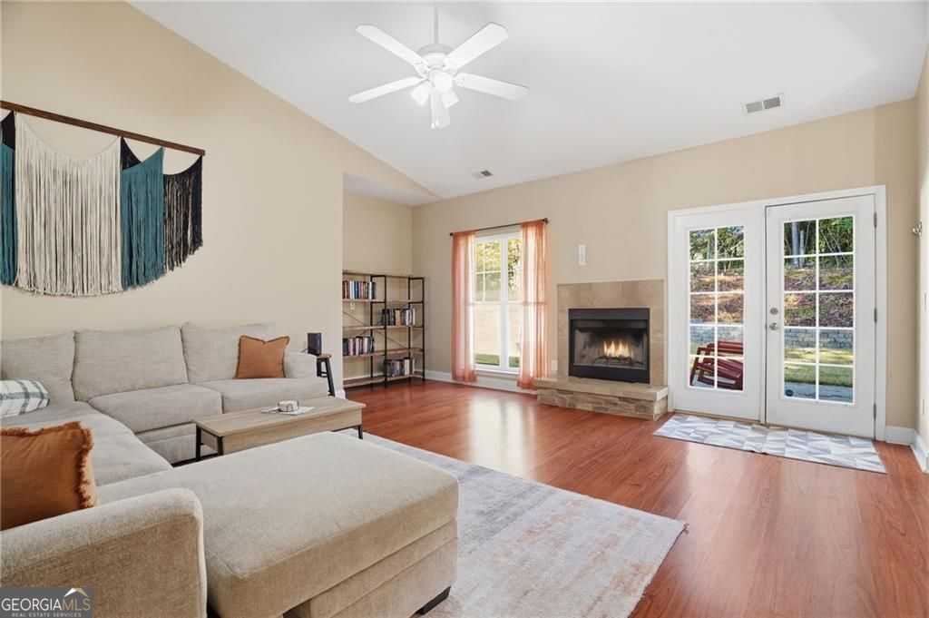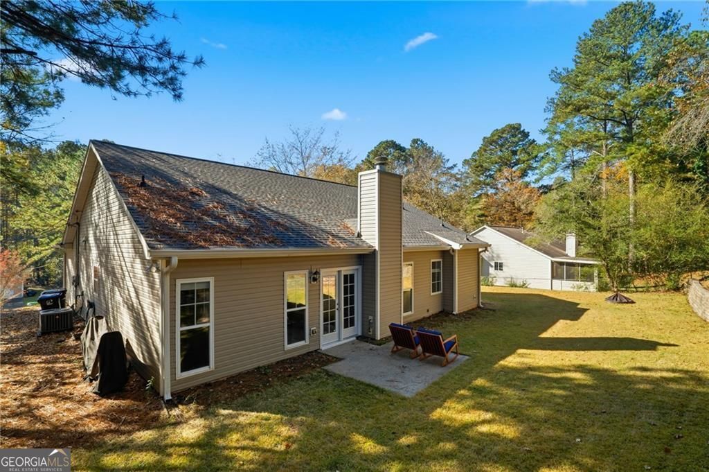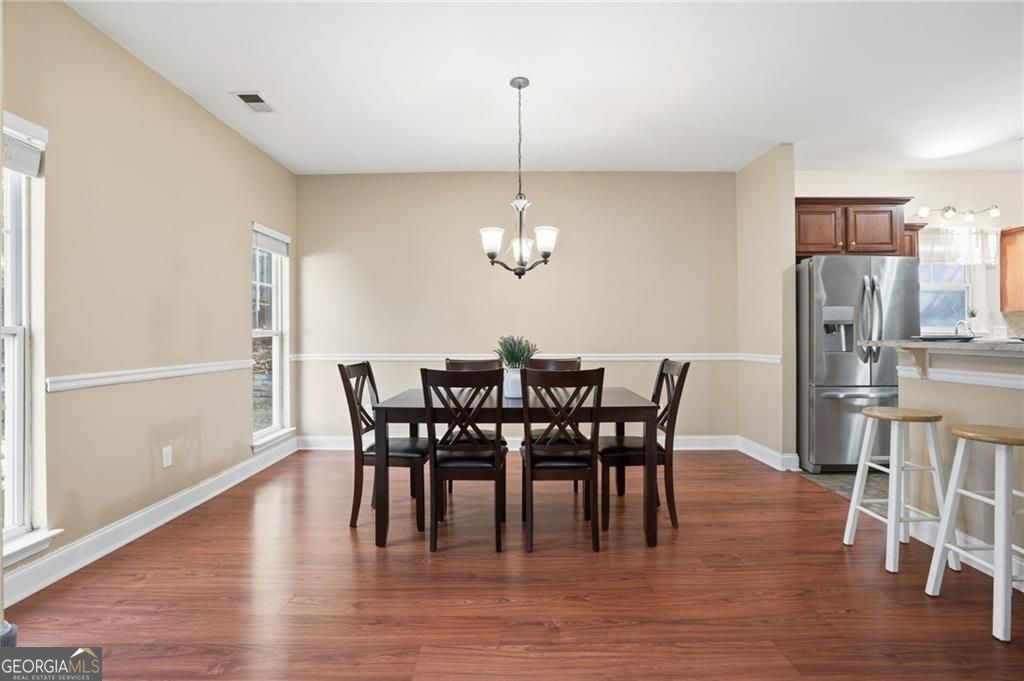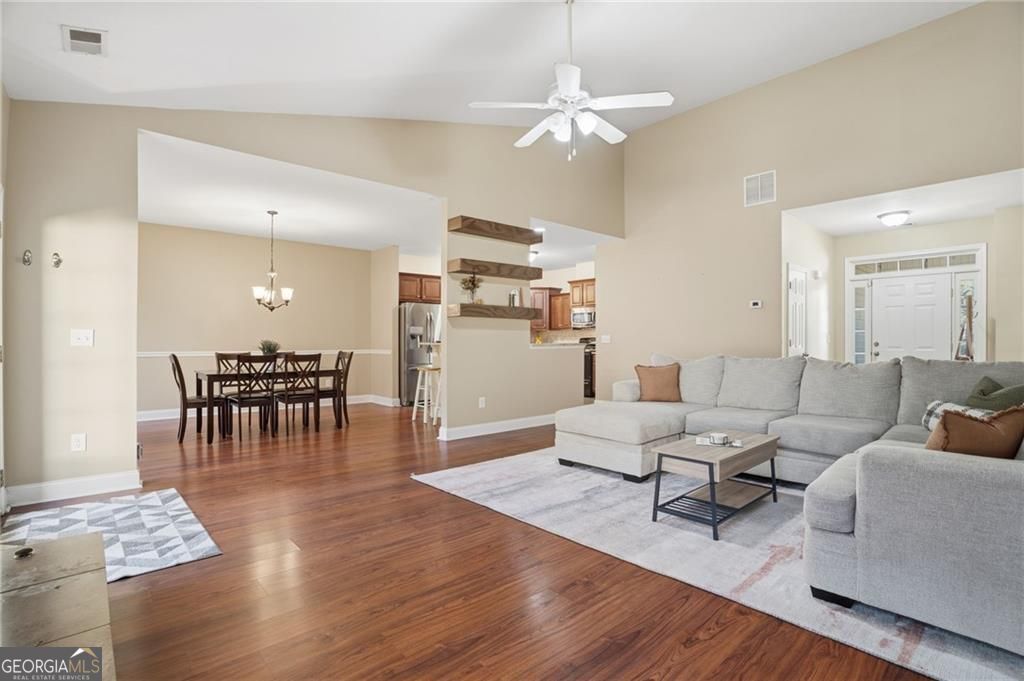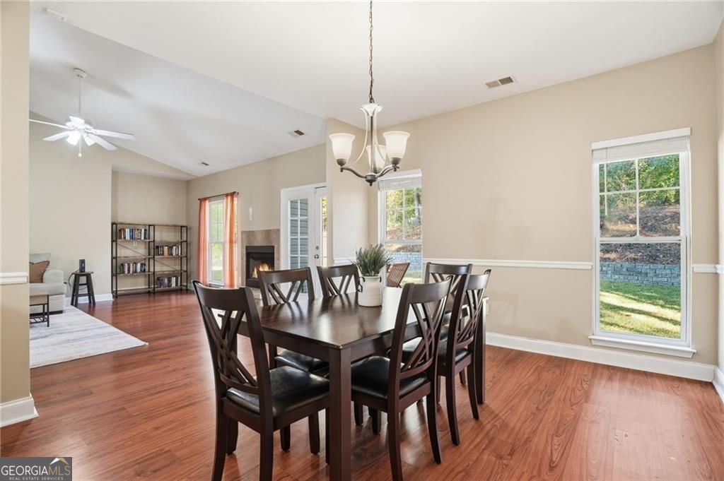 Welcome to your beautifully maintained, move-in ready ranch home - perfectly situated with easy access to I-575, GA-400, and the vibrant downtowns of Woodstock and Roswell. Step inside and be greeted by a spacious, light-filled fireside living room featuring vaulted ceilings that create an airy, open atmosphere. The generous kitchen offers abundant cabinetry, sleek granite countertops, and flows seamlessly into a large dining area - ideal for everyday meals or entertaining guests. Down the hall, you'll find three comfortable bedrooms. Two share a well-appointed full bath, while the oversized primary suite is a true retreat, complete with a tray ceiling, walk-in closet, and an en-suite bathroom featuring a garden tub, dual vanities, a private water closet, and a separate shower. Your private, flat backyard borders an open pasture and you can enjoy spotting wildlife grazing through. This lovingly cared-for home includes thoughtful updates such as a new roof, newer HVAC and water heater (2019), stylish flooring throughout, and plush carpet in the bedrooms - all ready for you to move in and enjoy.