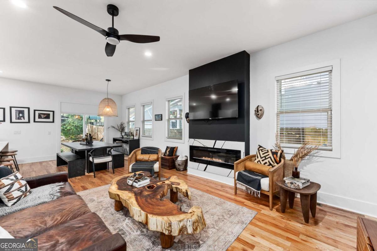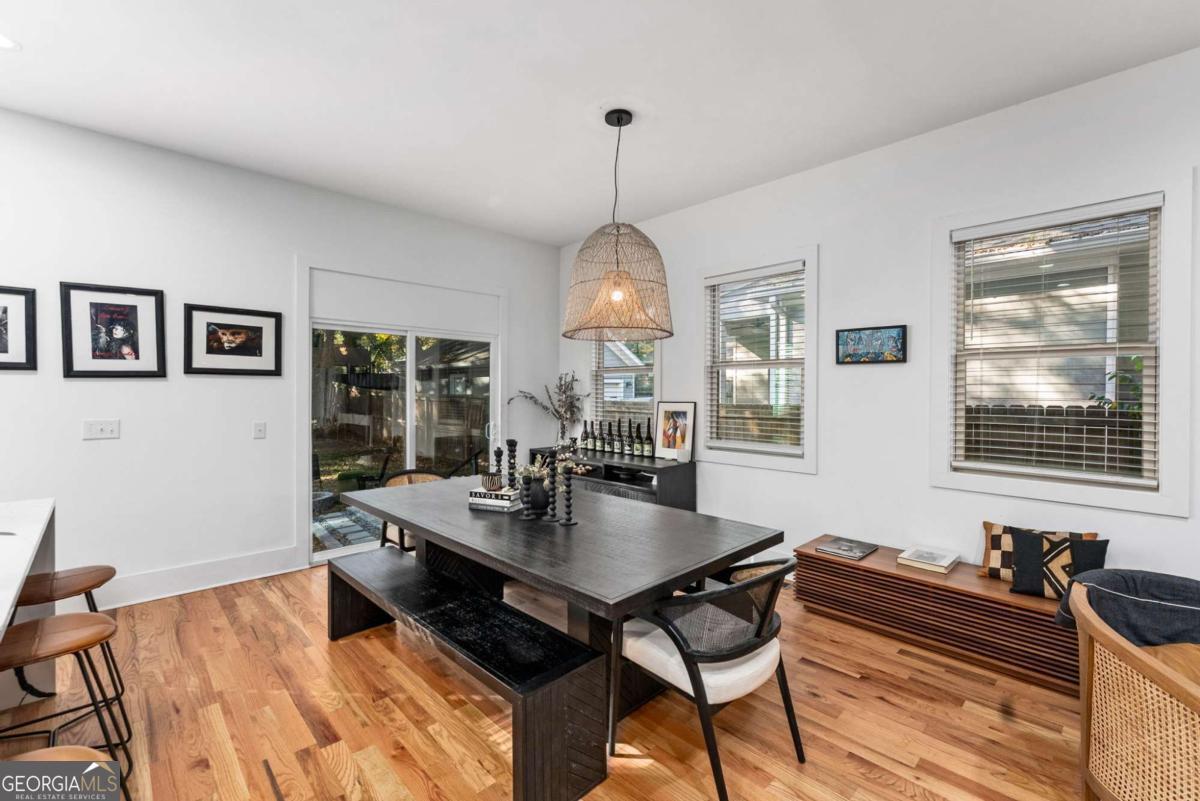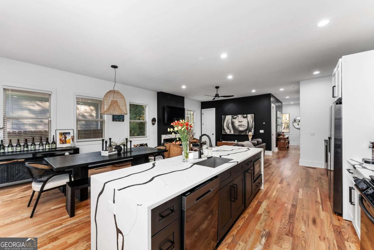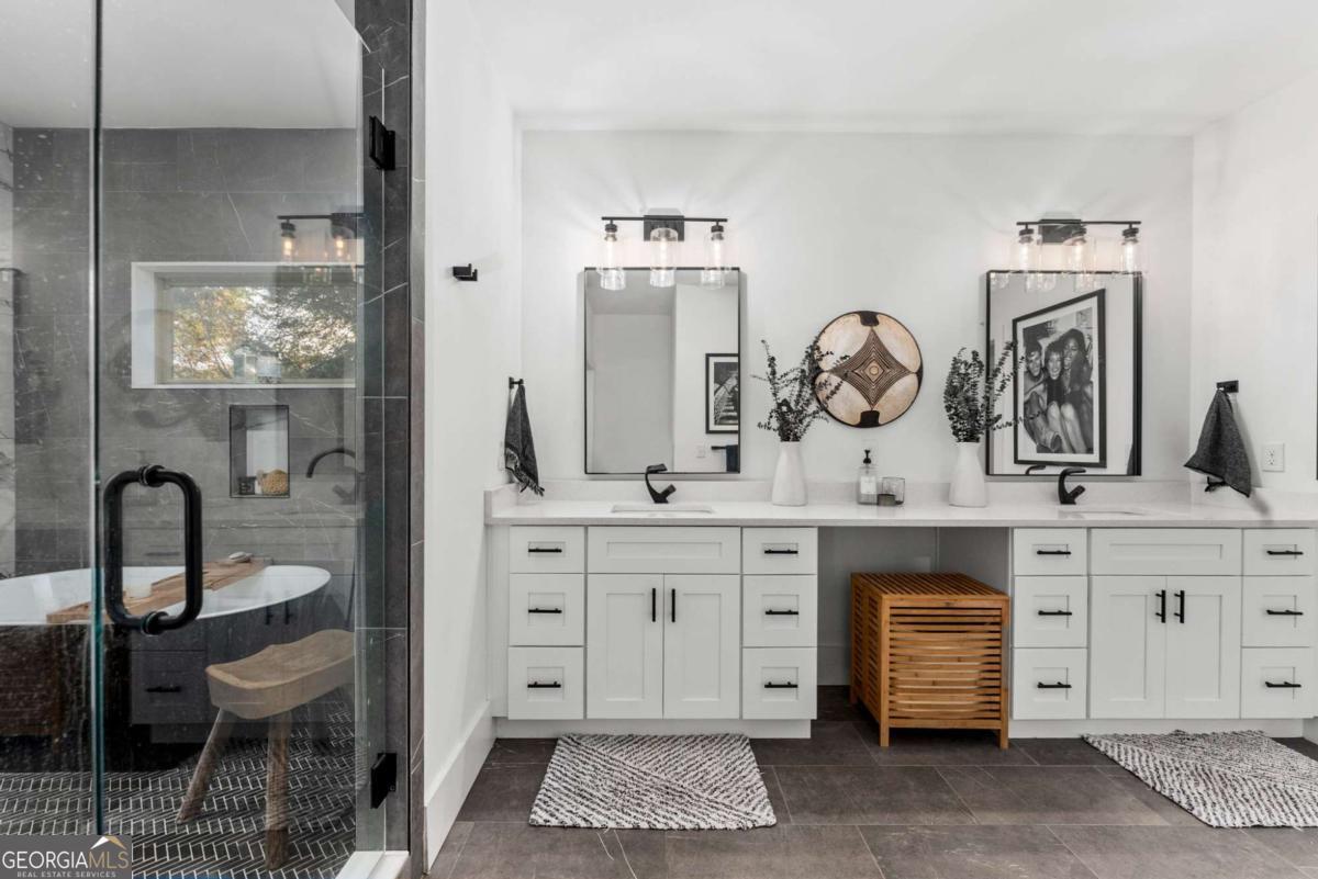 Nestled near the end of one of Kirkwood's most desired cul-de-sacs, this modern residence combines elevated finishes with a superb floor plan on a lot that makes the every day more meaningful. A gated driveway and fully fenced level backyard set the stage for entertaining inside and out. And if outside is what you like, you'll love the near-immediate access to the Pullman Trail a few doors down, connecting you within minutes to Pullman Yard's ever evolving restaurants and revolving exhibits - close enough to enjoy, yet comfortably removed for quiet evenings at home. The covered front porch with a prow leads you into a modern oasis, showcasing 10-foot ceilings and hardwood floors throughout. The envious kitchen features quartz counters, an oversized waterfall island with seating for four open to the dining room overlooking the backyard. The living room fireplace anchors the space and a custom bar wall with wine chiller is ideal when entertaining. A full guest suite on the main is well-placed for the in-laws and a full bath on main showcases the most current designer selections. Upstairs, the primary suite offers a calming retreat - a custom walk-in closet, dual vanities, water closet and a wet room punctuated by a sculptural vessel soaking tub. Three additional bedrooms including one ensuite and two secondary bedrooms that can flex for office, gym, studio or play. Downstairs, the full unfinished basement offers great overflow storage and ease of access to the mechanical systems and a natural opportunity to showcase wine collections or a future cellar buildout for the aspiring oenophile. Outside, the backyard is private and usable. Easily extend the driveway to support a future two-car garage or ADU - a meaningful value add in this submarket. EV charging is already in place. The rear covered back porch offers an enchanting tea lit entertaining space in any kind of weather. Better than new, this home blends modern architecture with warm designer finishes in a location that that offers a thoughtful sense of place within this coveted community. The ultimate Kirkwood flex.