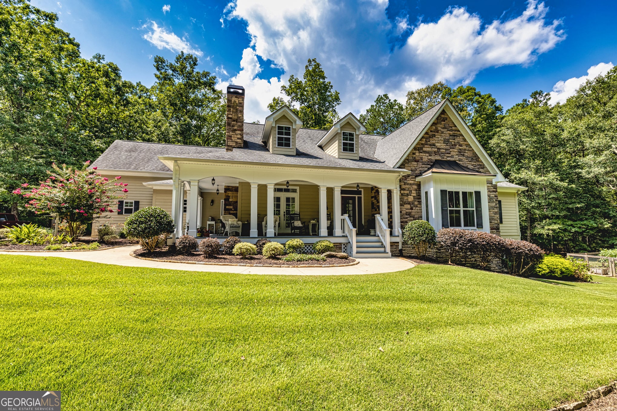 Welcome home to this stunning 5,000+ square foot custom Southern Living plan, The Moore's Creek, beautifully set on 27 picturesque acres. Tucked away at the end of a private driveway, the property immediately evokes a sense of peace and belonging. Classic Southern architecture meets modern comfort, highlighted by a welcoming wraparound porch-ideal for quiet mornings or gracious evenings of hospitality. Inside, the open floor plan features a family-style dining room with fireplace, a flexible office or optional bedroom, and a dramatic family room with vaulted ceilings, exposed beams, rich trim work, and a striking stone-front wood-burning fireplace. The custom kitchen is designed for both beauty and function, offering a large island, breakfast area, and elegant cabinetry, with nearby laundry and powder rooms for added convenience. Easy access to the porch and garage enhances everyday living, while the garage's finished bonus space is perfect for a craft room, home classroom, or studio. The main level includes three bedrooms (one currently used as an office) and multiple baths, along with an unfinished walk-up attic providing ample storage or future expansion opportunities. The fully finished terrace level expands the home's versatility with two additional bedrooms, two baths, a kitchenette, family room, workshop, and safe room-ideal for guests or multigenerational living. Outdoors, the property shines with a barn, wood shed, scenic walking trails, fenced raised-bed vegetable garden, and acres of peaceful countryside. Offering rare privacy, charm, and elegance, this exceptional estate delivers true Southern living, just six miles from Senoia's shopping and dining, six miles from Coweta Charter Academy (K-8), and 23 miles from Flint River Academy.