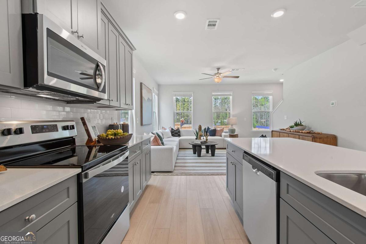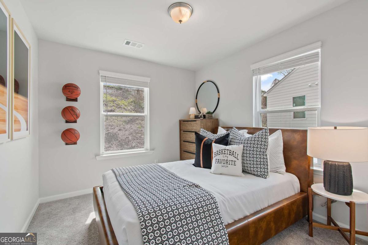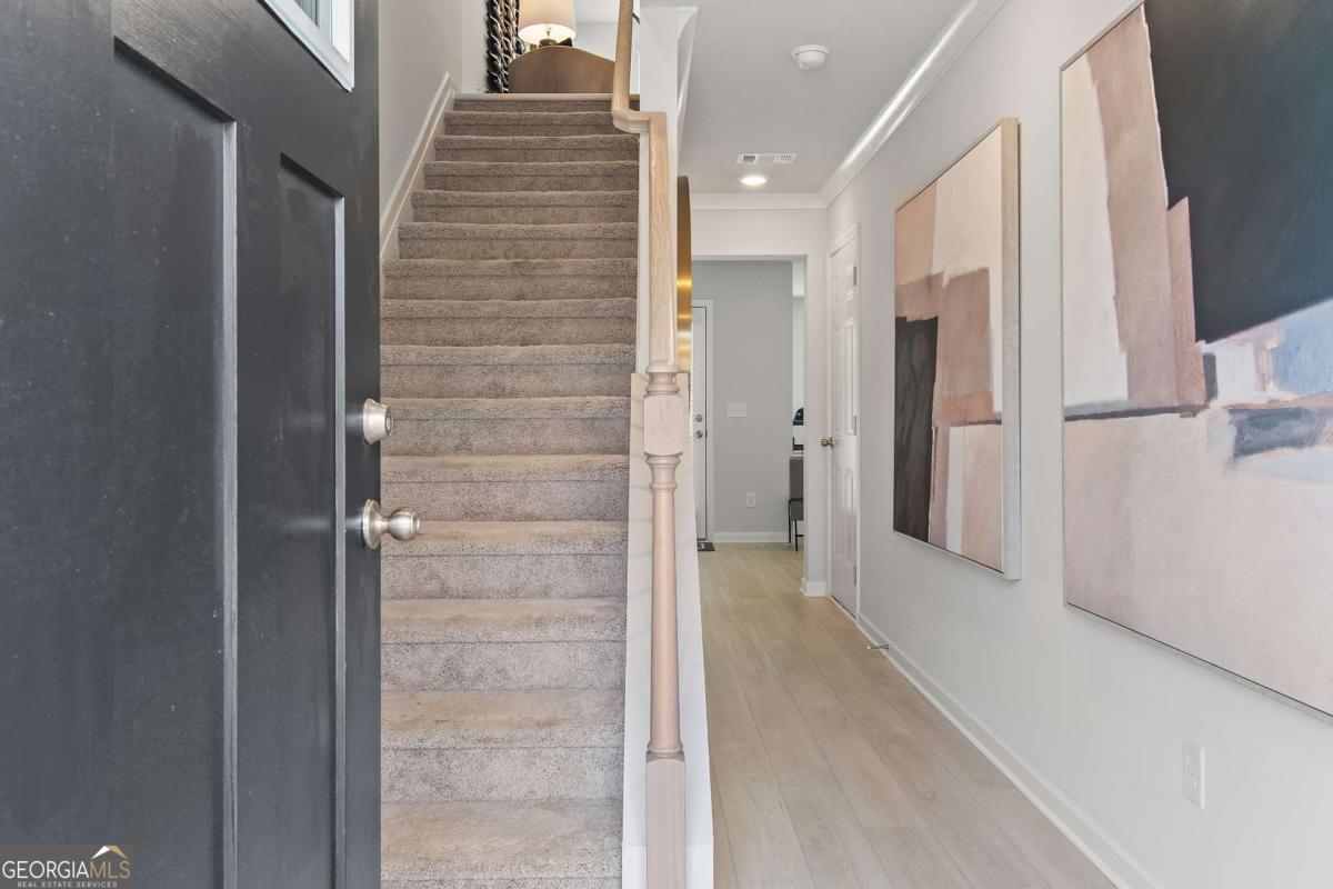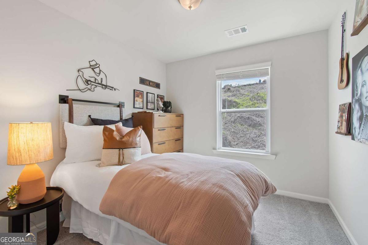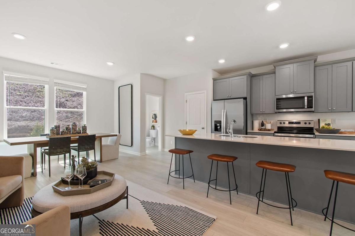 Discover this impressive three-story townhome featuring 3 bedrooms and 3.5 baths, plus a spacious game room perfect for entertaining. The ground level includes a large game room, a half bath, and access to a covered back patio. On the second level, enjoy a beautifully designed kitchen with ample cabinetry, a large island, Quartz countertops, a tile backsplash, and a full suite of stainless-steel appliances. The kitchen overlooks the breakfast and family rooms, making it ideal for gatherings, and there's a convenient powder room on this level. The third floor is your private retreat, with a roomy Owner's Suite featuring tray ceilings, dual walk-in closets, and a luxurious spa-like bathroom with a double vanity. Two additional spacious bedrooms, pre-wired for ceiling fans, and a full bathroom are also on this level. The laundry area includes a washer and dryer. Additional features include a one-car garage with an opener, a one-car parking pad, and window screens and blinds throughout. Conveniently located just 2.5 miles from the airport, 9 minutes from downtown Atlanta, and 12 minutes from the College Strip and Mercedes-Benz Stadium. You'll also be close to the future Aerotropolis and Airport City, with excellent access to major highways, Marta, and the Atlanta Beltline Eastside Trail. Monticello offers luxury townhome living with a low-maintenance lifestyle. *Photos are representative and may not reflect the actual townhome being built.* Please note: If the buyer is represented by a broker/agent, DRB REQUIRES the buyer's broker/agent to be present during the initial meeting with DRB's sales personnel to ensure proper representation.