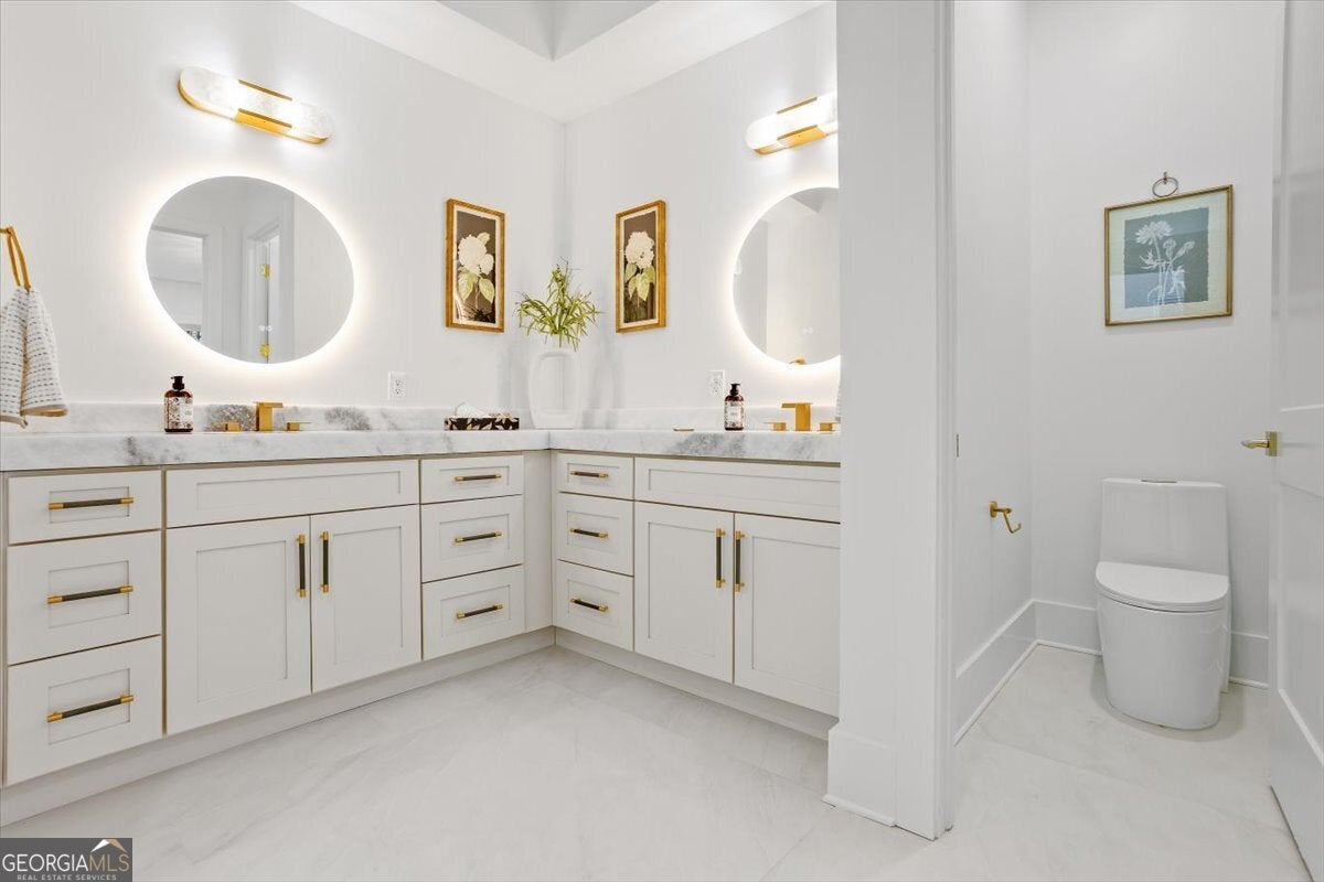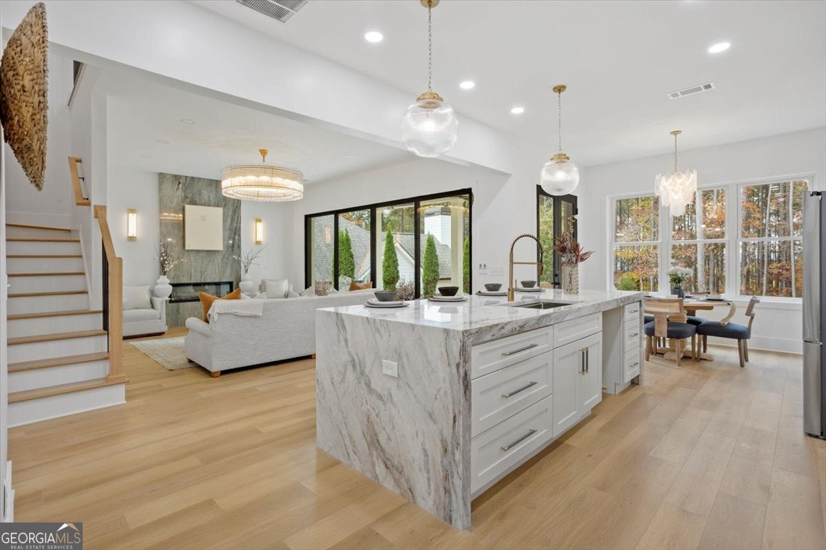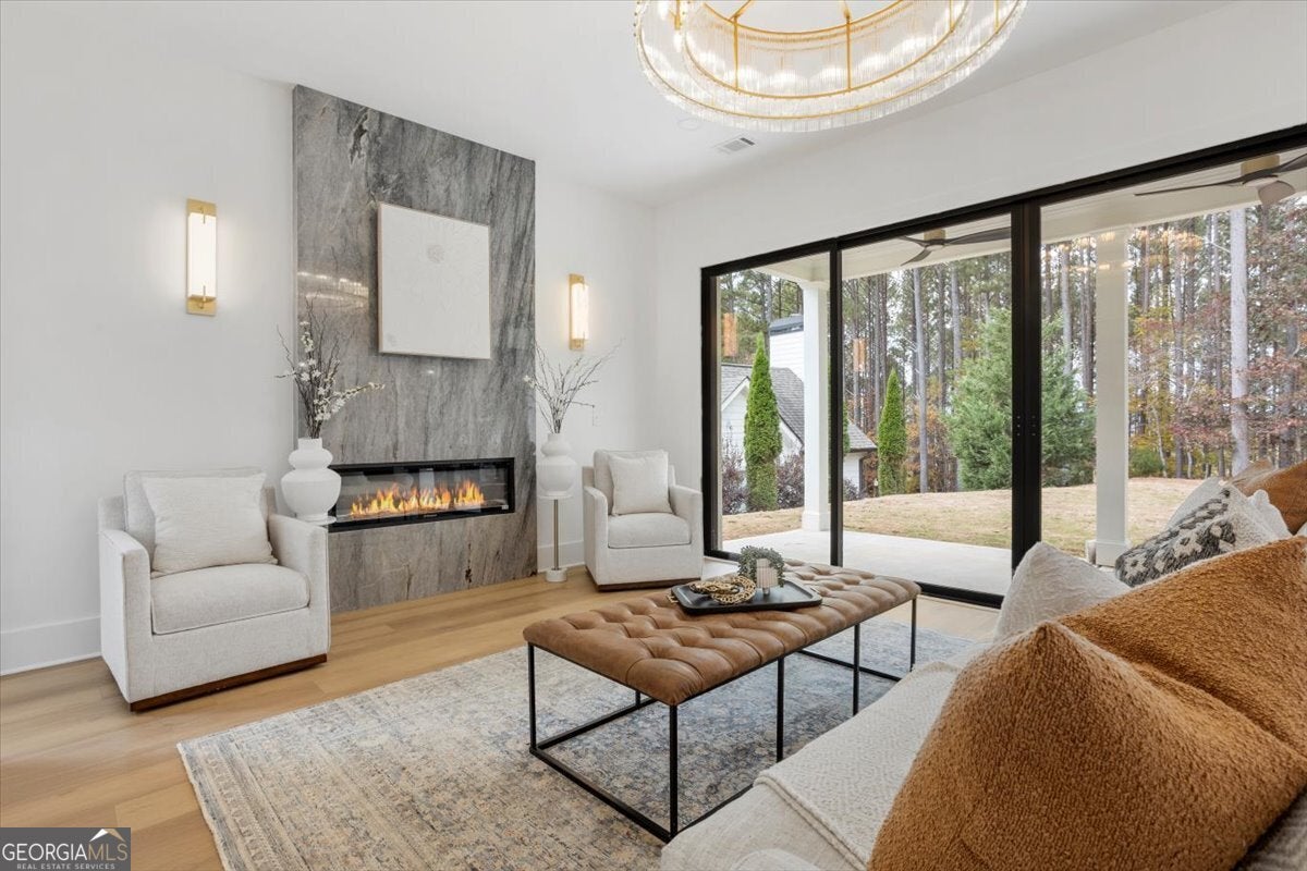 Stunning new construction modern luxury awaits at 606 Talmadge Ln in Governors Preserve. This four-sided painted brick residence features 10'+ ceilings and a dramatic living room highlighted by a floor-to-ceiling solid-surface stone fireplace and 3-panel multi-slide glass doors that open seamlessly to the private backyard. The chef's kitchen is meticulously designed with waterfall stone counters, a walk-in pantry, breakfast nook, large dining room, and a butler's pantry with wet bar. This flexible multigenerational layout boasts two primary suites-one on each level-including a superb upstairs suite complete with its own private exterior entrance from the garage. The second floor also features a Jack-and-Jill bath layout with shared access to a charming Romeo and Juliet balcony. Additional functional spaces include a main-level office, an upstairs bonus room, and a versatile room above the garage ideal for a 6th bedroom, media room, or private retreat. All bathrooms showcase granite countertops and high-end fixtures. The property is completed by an oversized garage with epoxy floors and EV charging, and a level backyard perfectly suitable for a future pool. Located in a top-rated school district and minutes to downtown Canton with easy access to Roswell, Alpharetta, and Cumming. This is a rare blend of craftsmanship, comfort, and contemporary design-your next chapter of luxury begins here.