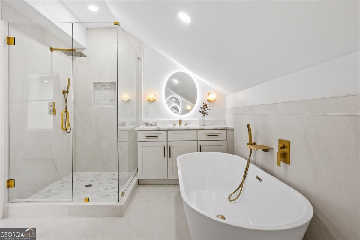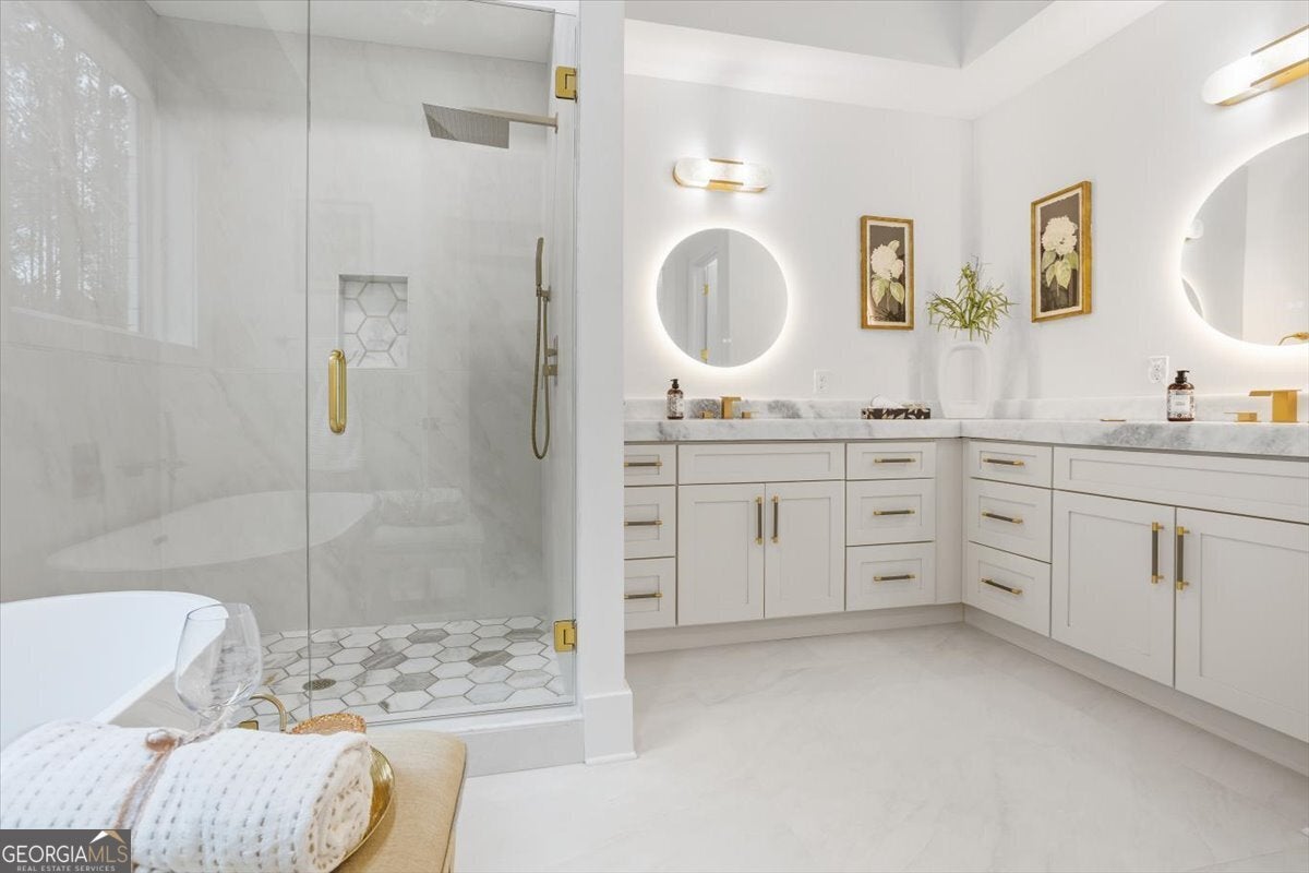 - Interior FeaturesDouble Vanity, High Ceilings, Master On Main Level, Other, Pulldown Attic Stairs, Separate Shower, Soaking Tub, Tile Bath