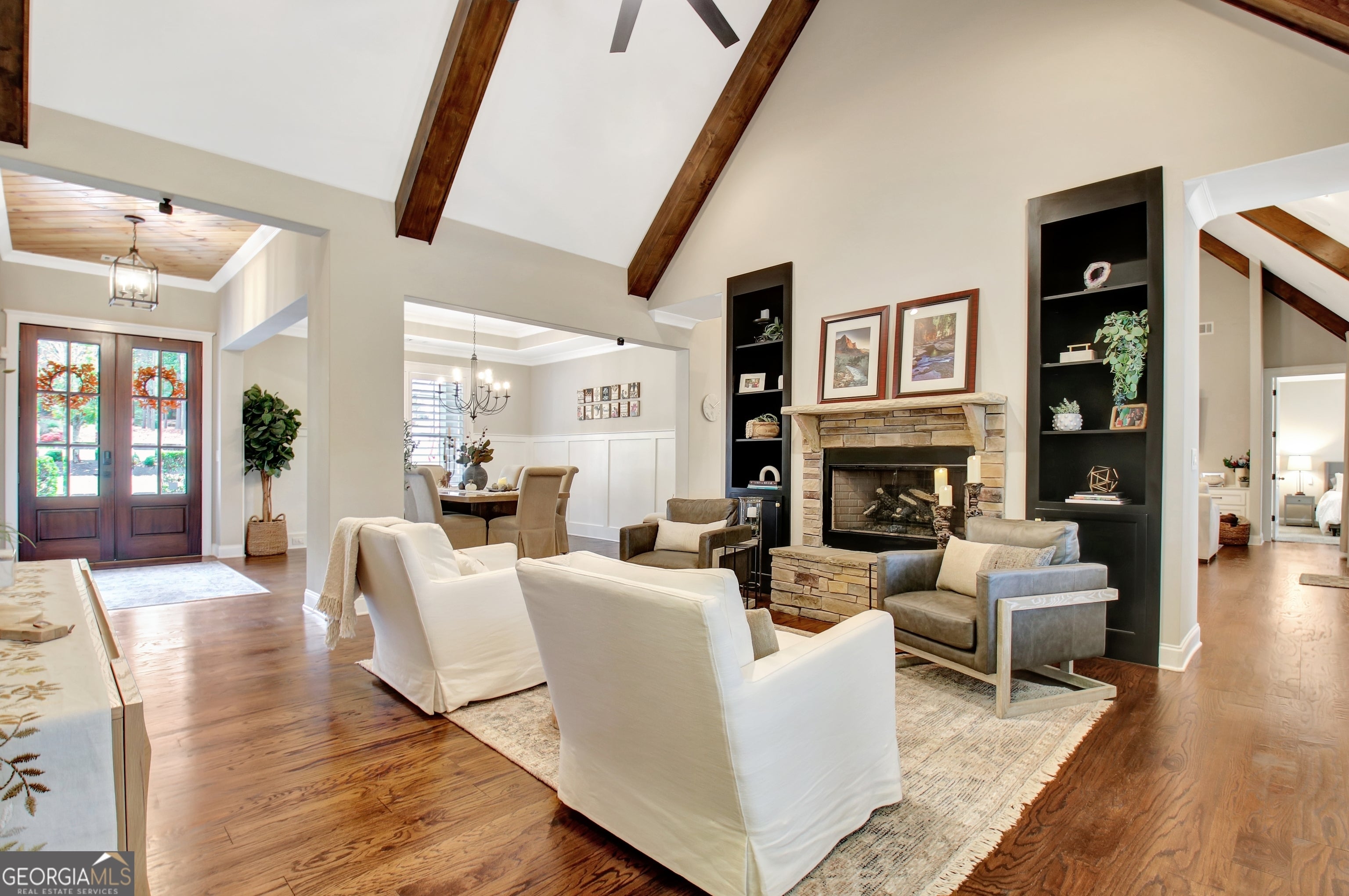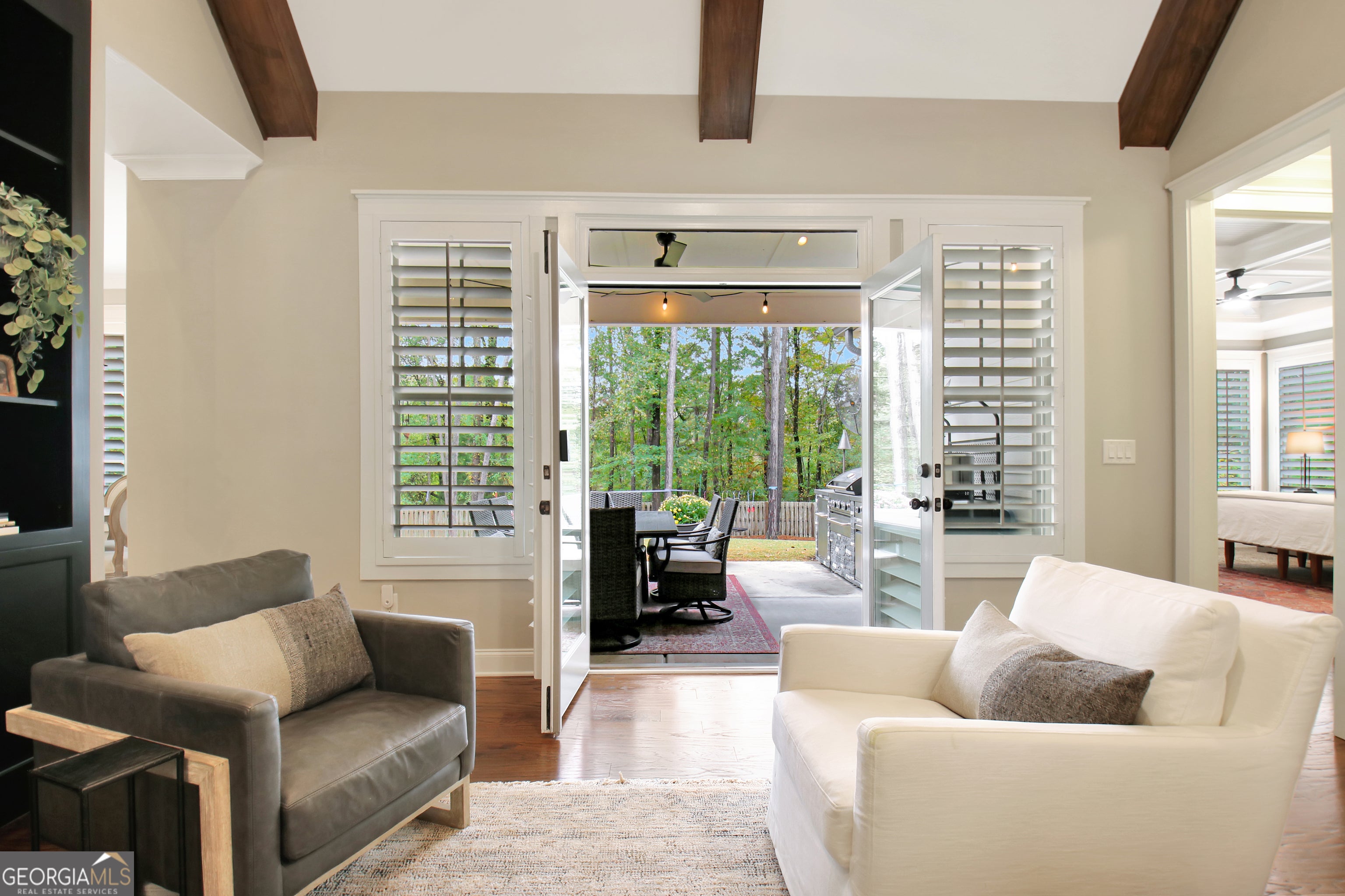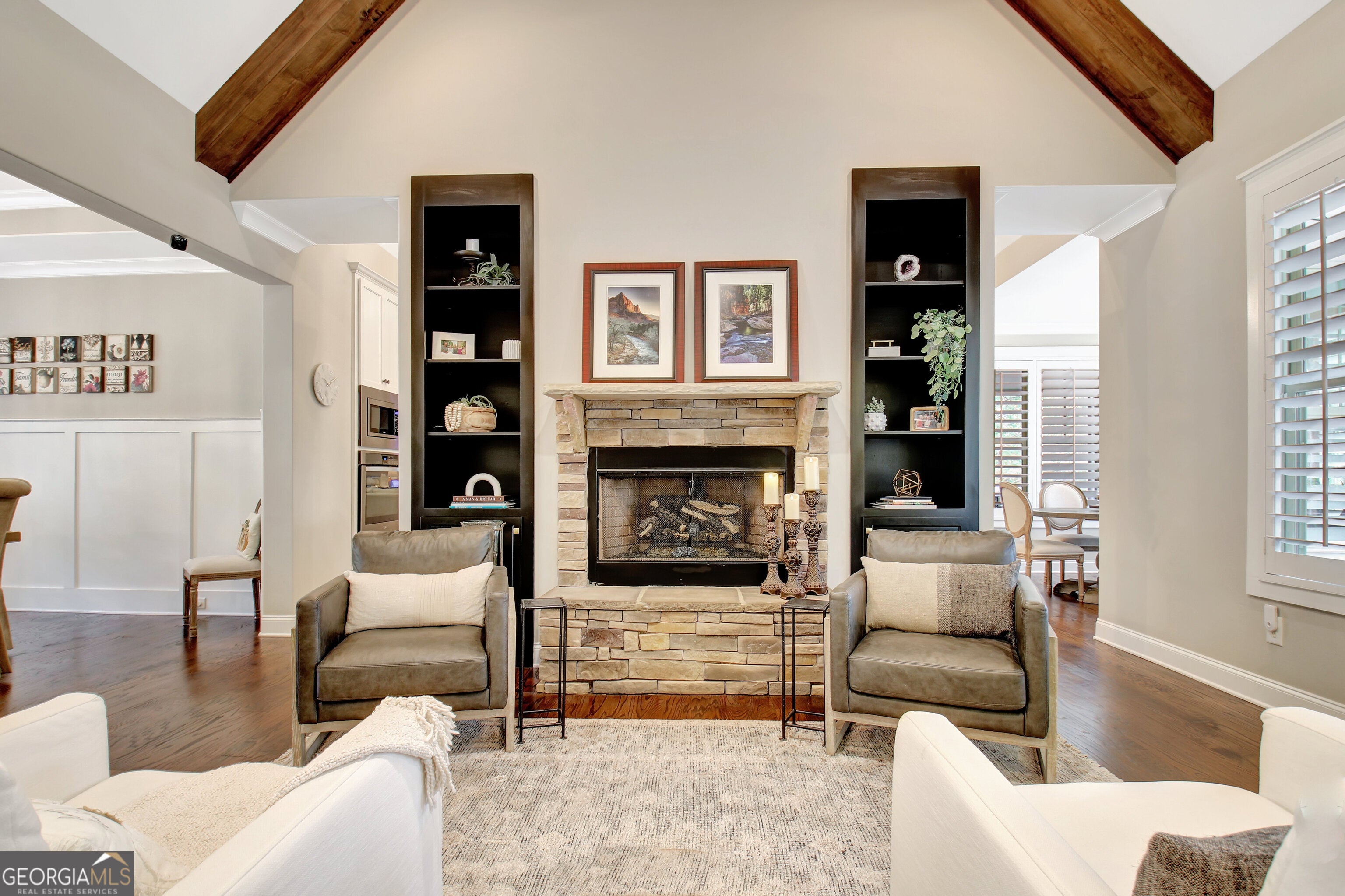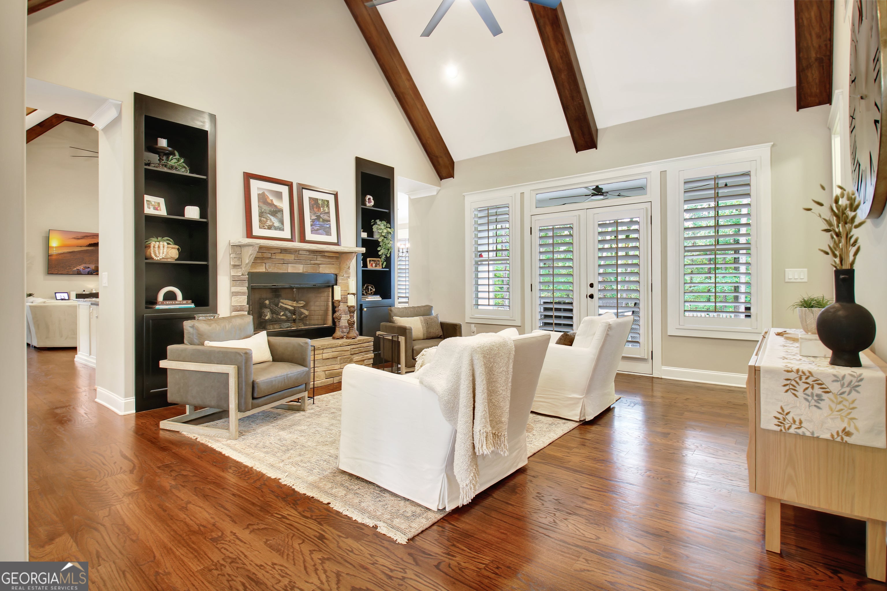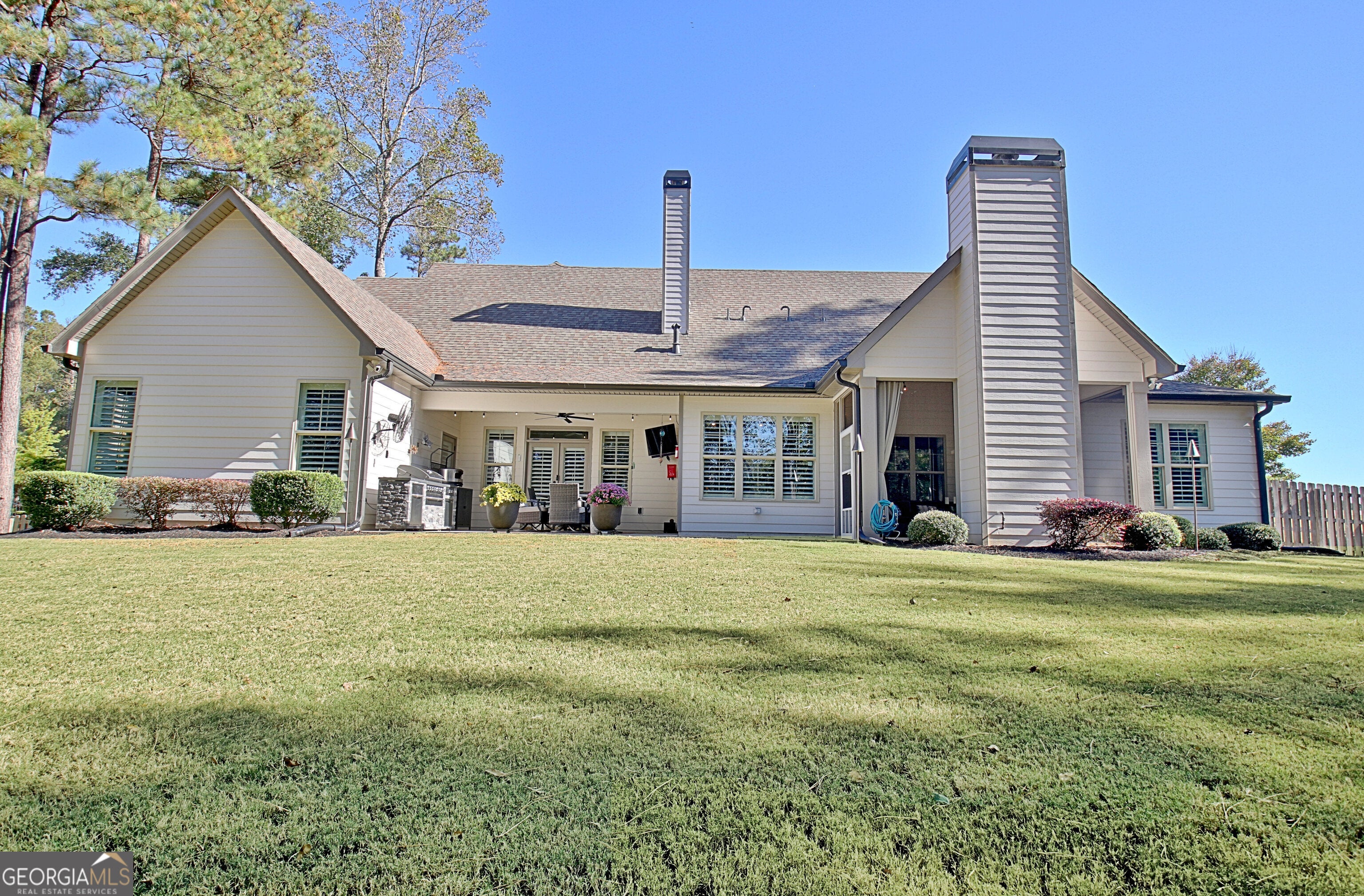Effortless style and timeless craftsmanship come together in this beautifully designed Northwynn home! Step through the double front doors into a warm, inviting foyer where rich hardwood floors and a wood-planked ceiling set the tone for relaxed elegance. The open layout flows seamlessly into a vaulted great room accented by exposed beams, custom built-ins, and a stacked-stone fireplace. To the left, a formal dining room offers wainscoting, a tray ceiling, and soft natural light filtered through custom wood shutters. The kitchen is a showpiece with timeless white cabinetry, granite countertops, tile backsplash, 36" 5 burner gas cooktop, wall oven, wine cooler, and a generous island with seating. A walk-in pantry/wet bar/mudroom with custom pull-out shelves keeps everything organized and accessible. The serene primary suite on the main level features a tray ceiling with tongue-and-groove detail, a private door to the porch, two closets, and the spa-inspired bath includes dual vanities with granite counters, a soaking tub, and a large walk-in shower with dual heads and a built-in bench, all finished with elegant tilework and bronze fixtures. Upstairs, a spacious bonus room offers endless flexibility: ideal for a media room, additional living area, guest room, or home office, and a large, walk-in attic with spray foam insulation for exceptional storage in a comfortable environment. The covered patio features a BBQ center with stone surround and natural gas, ceiling fan, and a wall mounted TV for easy entertaining. The vaulted screened gameday porch extends the living area, complete with a floor-to-ceiling stone fireplace, ceiling fan, bistro lighting, and speakers that can connect to a central entertainment system. The oversized three-car dream garage features an epoxy floor and room for vehicles, tools, or a home gym. The beautifully landscaped, private, fenced yard, and picture-perfect curb appeal complete this incredible property. Every space in this four bedroom, four bathroom (plus a bonus!) home has been thoughtfully designed for livability, luxury, and low-maintenance enjoyment, with a location convenient to PTC, Newnan, Senoia, shopping, and dining!