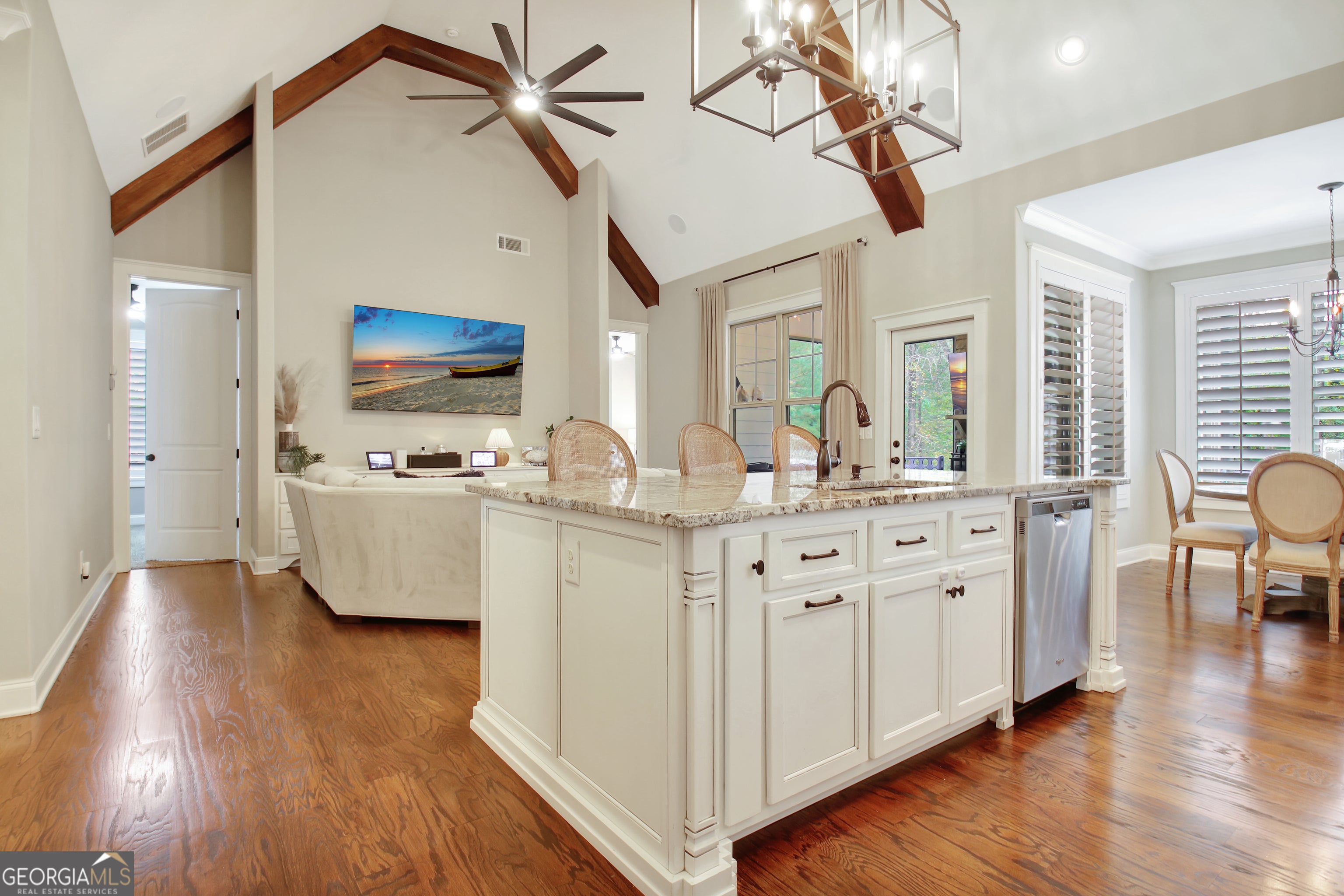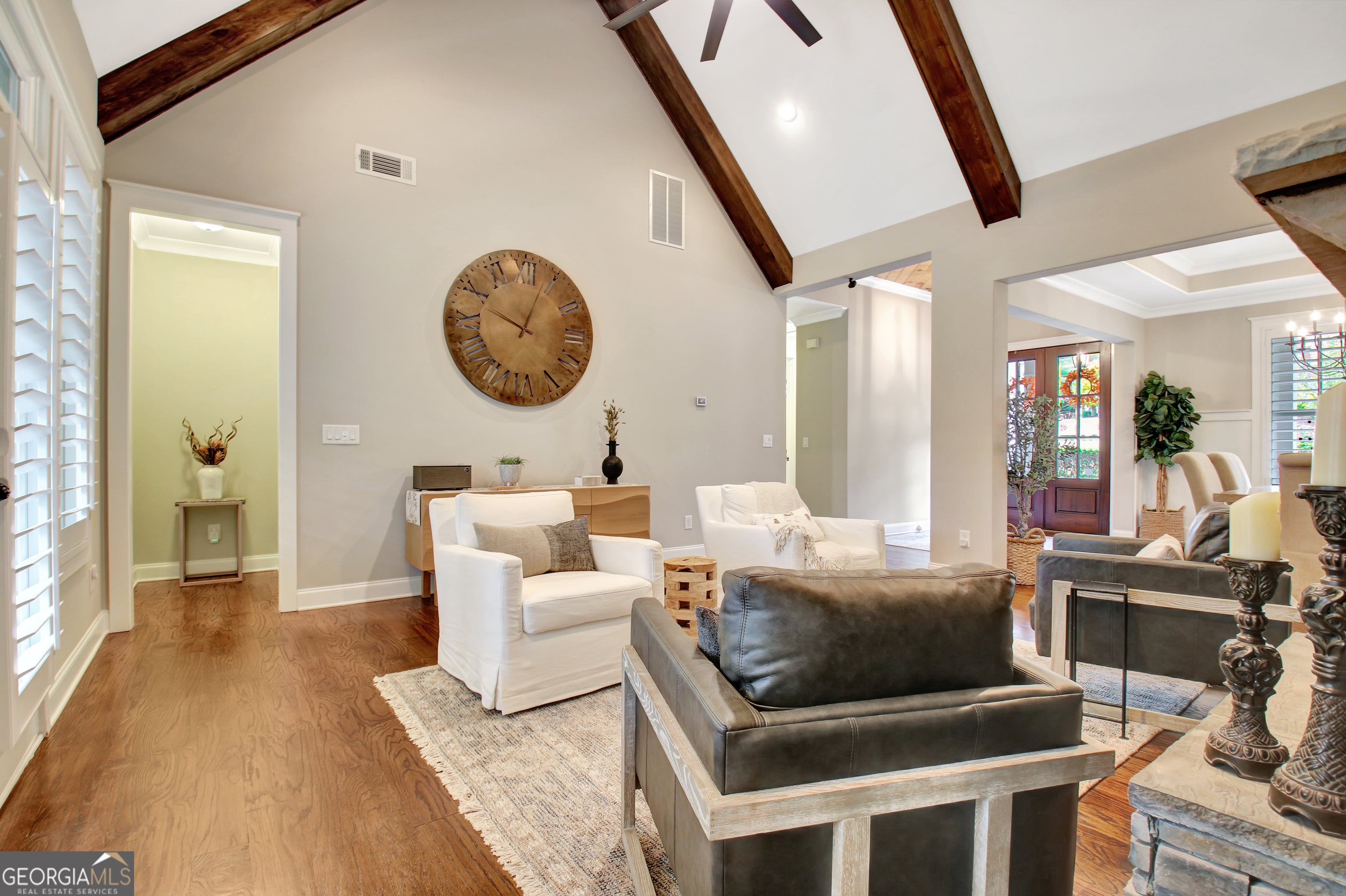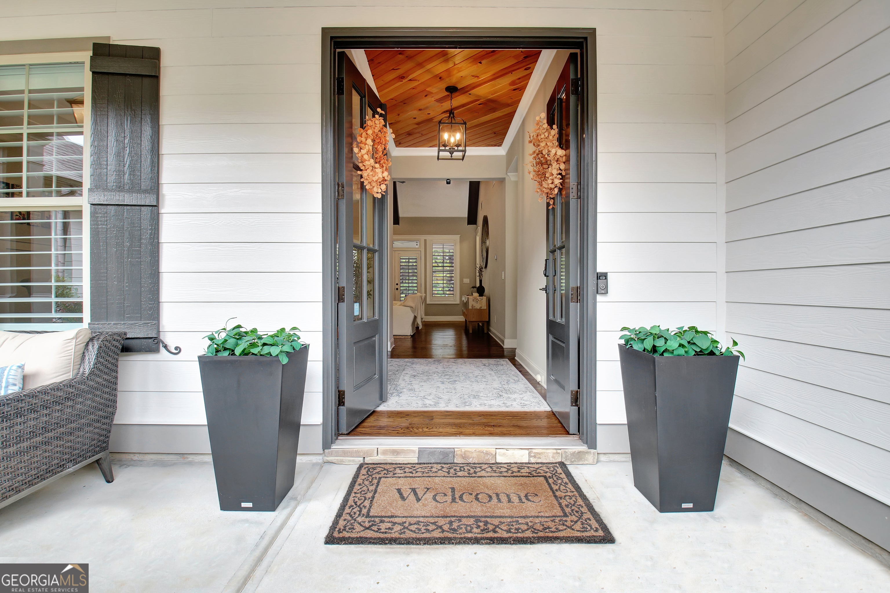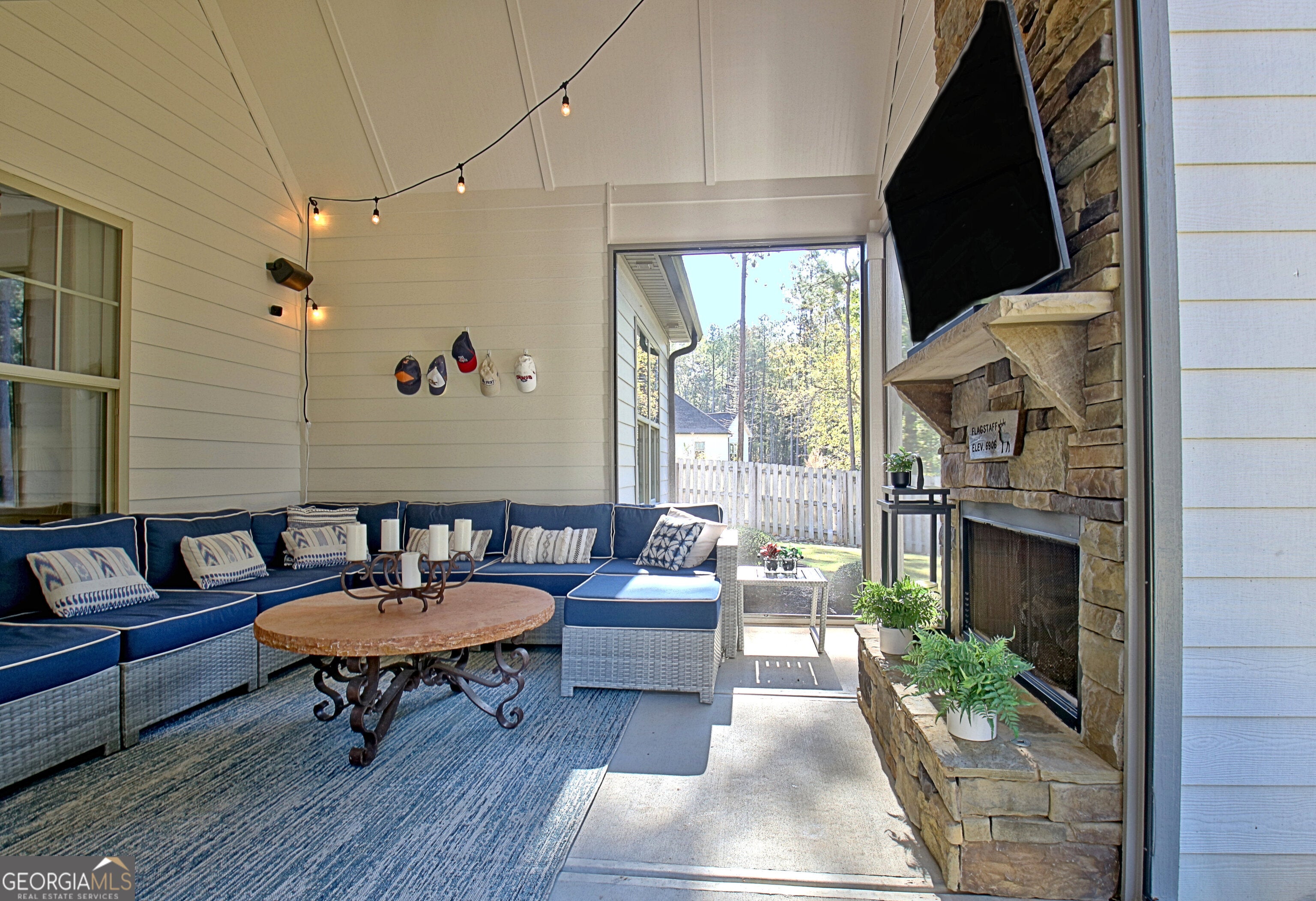 Effortless style and timeless craftsmanship come together in this beautifully designed Northwynn home! Step through the double front doors into a warm, inviting foyer where rich hardwood floors and a wood-planked ceiling set the tone for relaxed elegance. The open layout flows seamlessly into a vaulted great room accented by exposed beams, custom built-ins, and a stacked-stone fireplace. To the left, a formal dining room offers wainscoting, a tray ceiling, and soft natural light filtered through custom wood shutters. The kitchen is a showpiece with timeless white cabinetry, granite countertops, tile backsplash, 36" 5 burner gas cooktop, wall oven, wine cooler, and a generous island with seating. A walk-in pantry/wet bar/mudroom with custom pull-out shelves keeps everything organized and accessible. The serene primary suite on the main level features a tray ceiling with tongue-and-groove detail, a private door to the porch, two closets, and the spa-inspired bath includes dual vanities with granite counters, a soaking tub, and a large walk-in shower with dual heads and a built-in bench, all finished with elegant tilework and bronze fixtures. Upstairs, a spacious bonus room offers endless flexibility: ideal for a media room, additional living area, guest room, or home office, and a large, walk-in attic with spray foam insulation for exceptional storage in a comfortable environment. The covered patio features a BBQ center with stone surround and natural gas, ceiling fan, and a wall mounted TV for easy entertaining. The vaulted screened gameday porch extends the living area, complete with a floor-to-ceiling stone fireplace, ceiling fan, bistro lighting, and speakers that can connect to a central entertainment system. The oversized three-car dream garage features an epoxy floor and room for vehicles, tools, or a home gym. The beautifully landscaped, private, fenced yard, and picture-perfect curb appeal complete this incredible property. Every space in this four bedroom, four bathroom (plus a bonus!) home has been thoughtfully designed for livability, luxury, and low-maintenance enjoyment, with a location convenient to PTC, Newnan, Senoia, shopping, and dining!