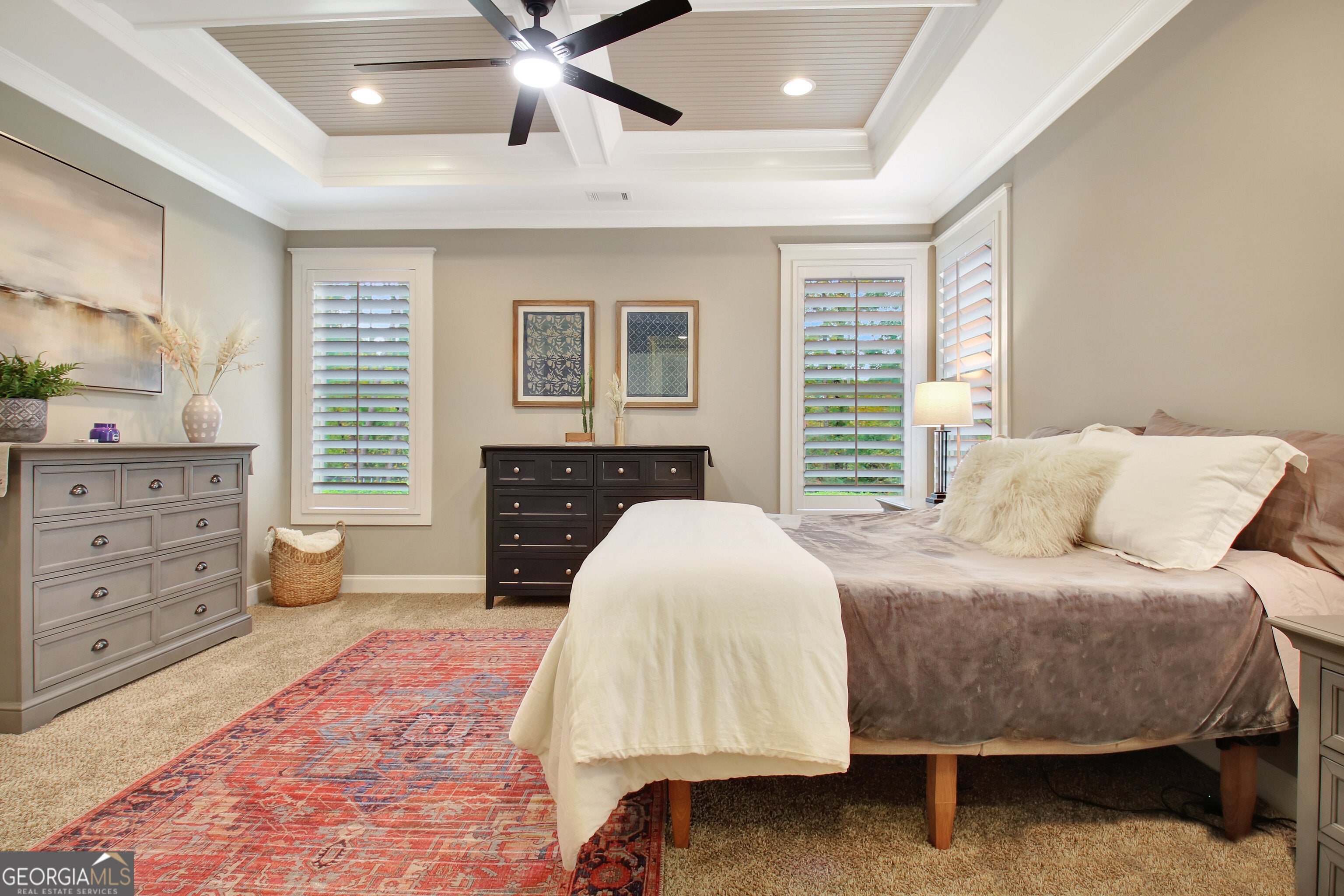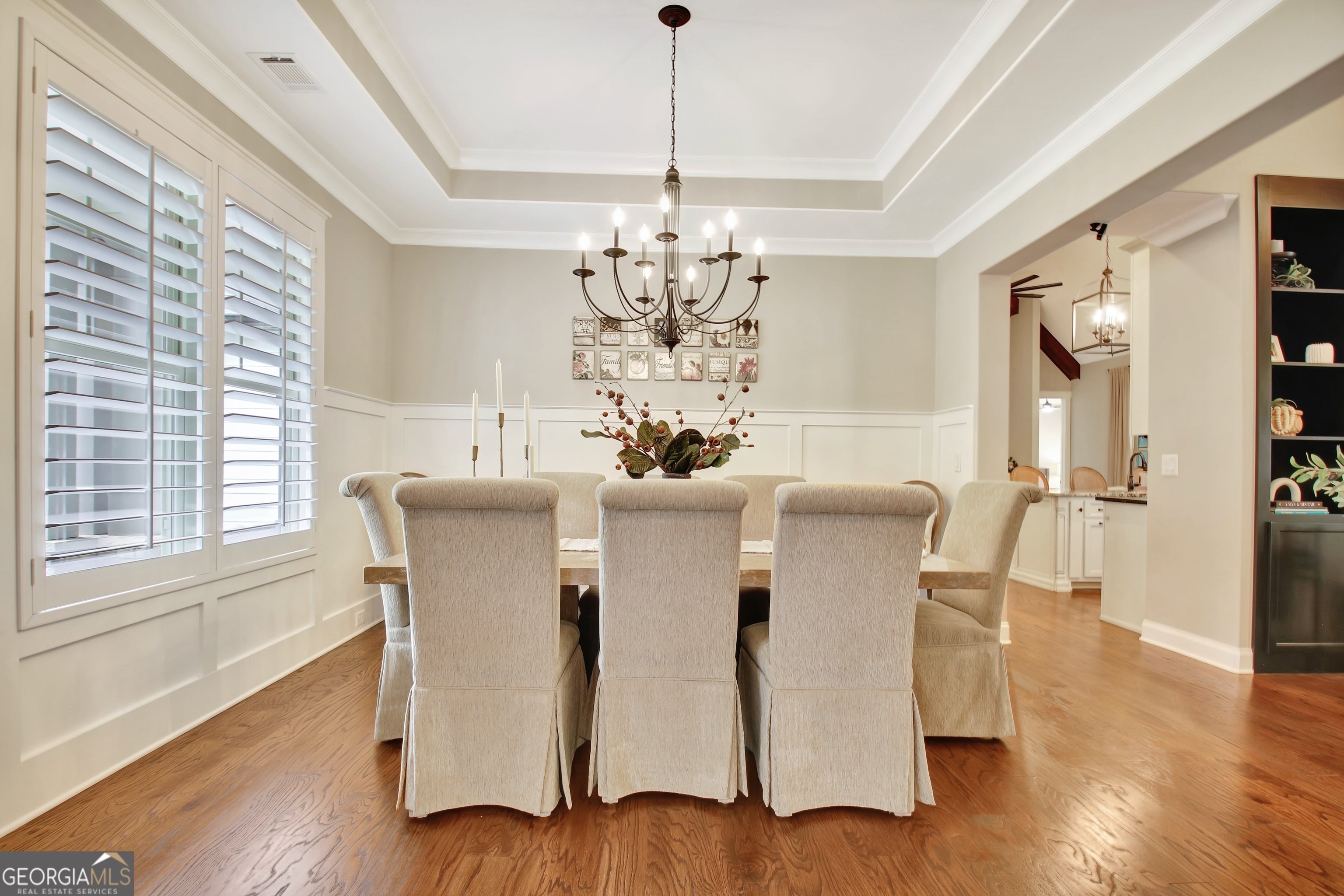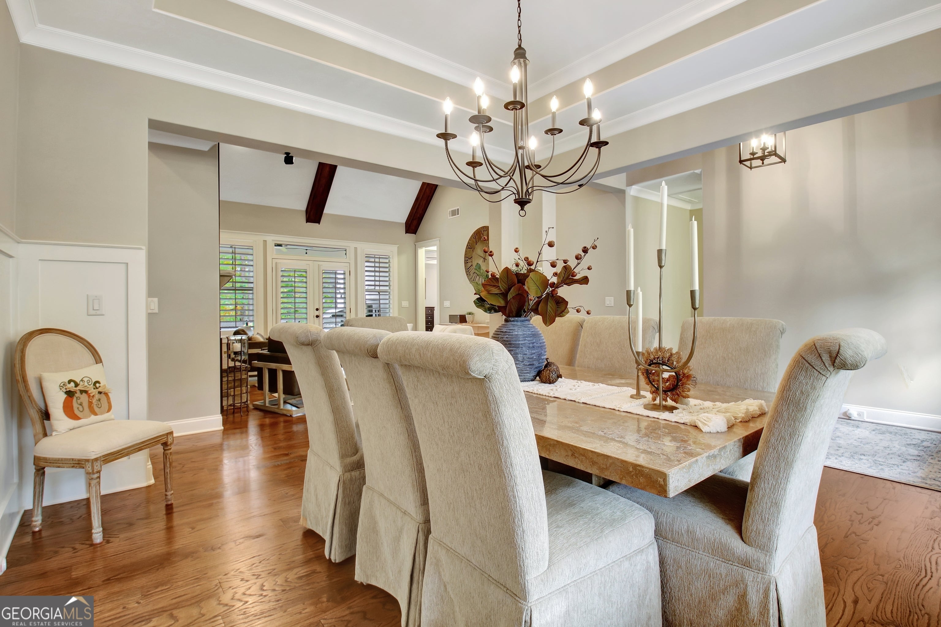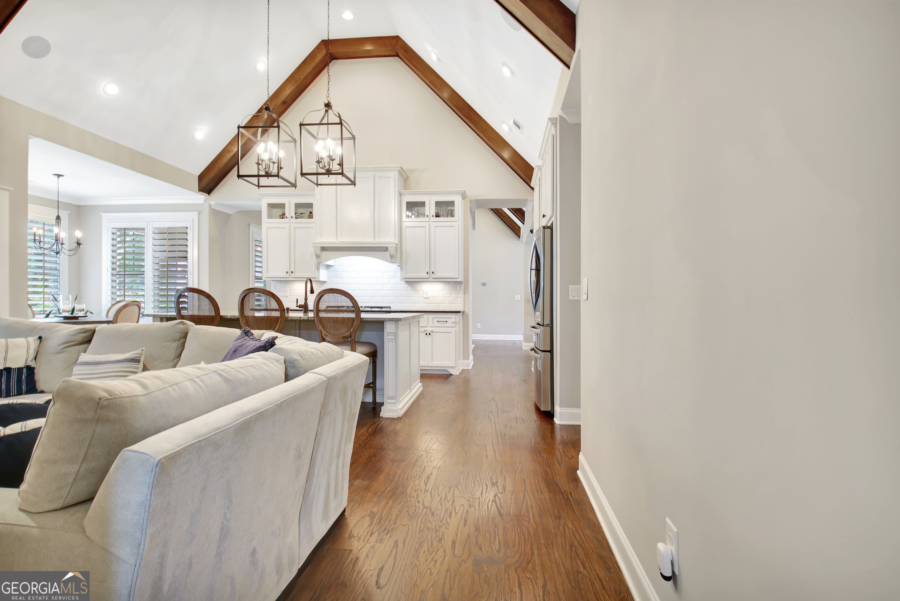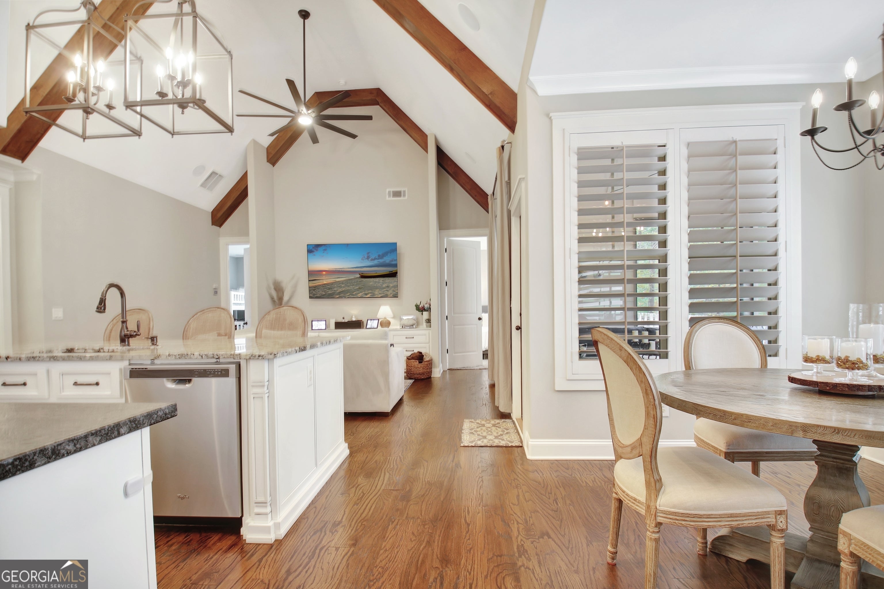 Effortless style and timeless craftsmanship come together in this beautifully designed Northwynn home! Step through the double front doors into a warm, inviting foyer where rich hardwood floors and a wood-planked ceiling set the tone for relaxed elegance. The open layout flows seamlessly into a vaulted great room accented by exposed beams, custom built-ins, and a stacked-stone fireplace. To the left, a formal dining room offers wainscoting, a tray ceiling, and soft natural light filtered through custom wood shutters. The kitchen is a showpiece with timeless white cabinetry, granite countertops, tile backsplash, 36" 5 burner gas cooktop, wall oven, wine cooler, and a generous island with seating. A walk-in pantry/wet bar/mudroom with custom pull-out shelves keeps everything organized and accessible. The serene primary suite on the main level features a tray ceiling with tongue-and-groove detail, a private door to the porch, two closets, and the spa-inspired bath includes dual vanities with granite counters, a soaking tub, and a large walk-in shower with dual heads and a built-in bench, all finished with elegant tilework and bronze fixtures. Upstairs, a spacious bonus room offers endless flexibility: ideal for a media room, additional living area, guest room, or home office, and a large, walk-in attic with spray foam insulation for exceptional storage in a comfortable environment. The covered patio features a BBQ center with stone surround and natural gas, ceiling fan, and a wall mounted TV for easy entertaining. The vaulted screened gameday porch extends the living area, complete with a floor-to-ceiling stone fireplace, ceiling fan, bistro lighting, and speakers that can connect to a central entertainment system. The oversized three-car dream garage features an epoxy floor and room for vehicles, tools, or a home gym. The beautifully landscaped, private, fenced yard, and picture-perfect curb appeal complete this incredible property. Every space in this four bedroom, four bathroom (plus a bonus!) home has been thoughtfully designed for livability, luxury, and low-maintenance enjoyment, with a location convenient to PTC, Newnan, Senoia, shopping, and dining!
