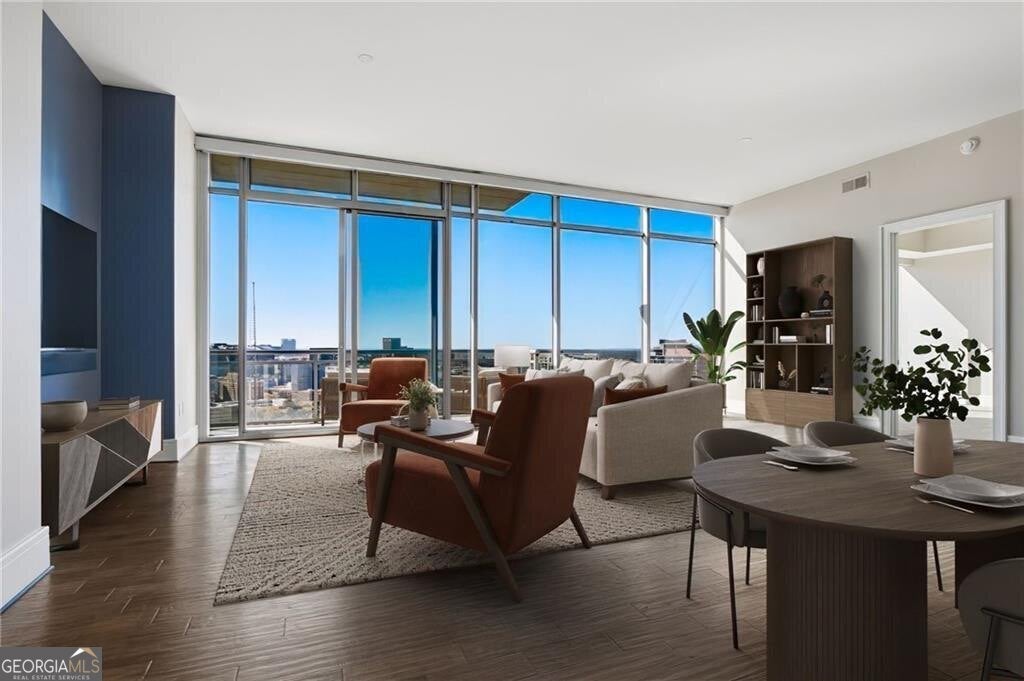 Experience elevated Midtown living at its finest from this luxurious 33rd-floor residence perched above the Loews Atlanta Hotel. Enjoy sweeping, unobstructed views of Midtown, Downtown, and Piedmont Park from every room of this impeccably designed home. The spacious open layout offers a seamless flow between the living, dining, and kitchen areas - perfect for both entertaining and everyday living. The oversized primary suite provides a serene retreat with automatic blackout shades, a custom walk-in closet, and a spa-like ensuite bath featuring a Victoria + Albert soaking tub and separate shower. The guest suite offers privacy and comfort for visitors or an ideal home office. Every detail has been thoughtfully upgraded, from hardwood floors and custom cabinetry to high-end kitchen appliances, smart home features, and an integrated audio-visual system. Electronic shades and mounted TVs in each room remain with the home, creating a truly turnkey experience. Residents of 1065 Midtown enjoy exclusive access to the private owner amenities above the Loews Hotel, including a heated rooftop pool, clubroom, and 24-hour concierge. Ownership also includes direct elevator access to Exhale Spa & Gym, valet service, and in-room dining from Ashland Restaurant. With only 52 private residences above the hotel, 1065 Midtown offers a rare blend of privacy, security, and resort-style luxury. Two deeded parking spaces, same-level storage, and a private gated entry ensure convenience and peace of mind. Just moments from Piedmont Park, the BeltLine, the High Museum, and Atlanta's top restaurants and nightlife, this residence captures the very best of urban sophistication.
