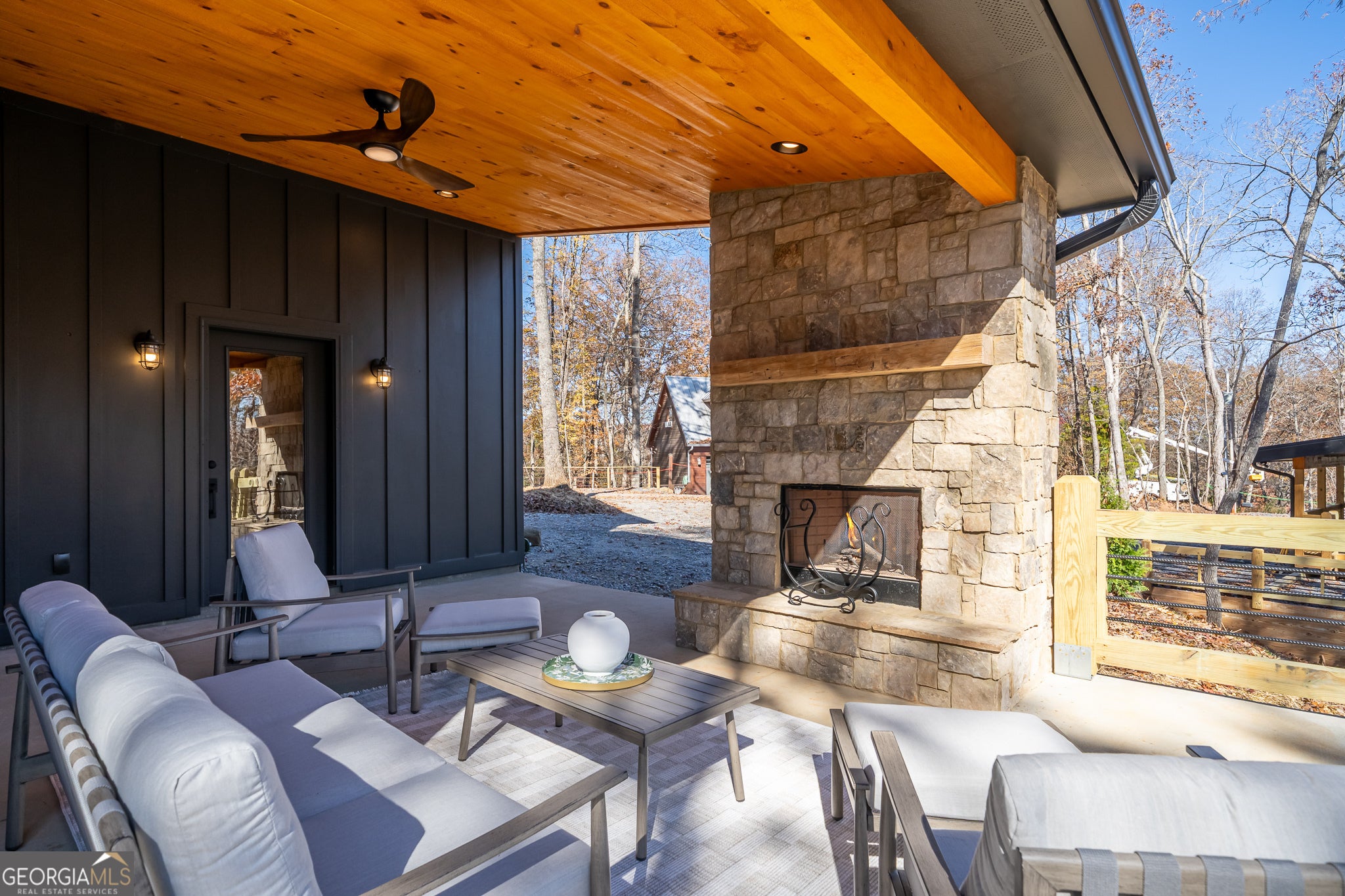Tucked in the scenic Aska Adventure Area, this NEW CONSTRUCTION cottage offers a serene escape nestled on a peaceful peninsula of Lake Blue Ridge, all while placing you just six minutes from the boutiques, galleries, breweries, and dining of downtown Blue Ridge. Built with a premium Mountain Modern design, the exterior features a striking combination of black vertical board-and-batten siding and a heavy stone foundation, set on nearly an acre of private, wooded land. The property invites total relaxation, quiet walks, and wildlife spotting, while offering seasonal lake and mountain views through the treetops. The open-concept living area serves as a central gathering space, anchored by a beautiful stone gas fireplace with a reclaimed timber mantel and warm wood accents. The adjacent modern kitchen is a chef's dream, featuring reclaimed wood accents, Taj Mahal quartzite countertops, a farmhouse sink, a 5-burner gas range/oven, and a spacious walk-in pantry closed off by a custom reclaimed barn door. Just off the cozy dining area, the conveniently built-in coffee and wine bar offers morning brews or evening pours near the covered patio. The home features two oversized bedrooms with lofted ceilings, including a primary bedroom with expansive windows that create a true treehouse experience and an 11' 8" x 11' 5" massive walk-in closet, and the luxurious main bath, featuring reclaimed timber wind beams, boasts an oversized walk-in, tile shower, and dual vanities, blending rustic style with modern comfort. Thoughtfully crafted for all-season enjoyment, the home's expanded outdoor living amenities are unmatched, including a large covered patio with a wood-burning fireplace and fan, a stone-lined outdoor fire pit area, and a private courtyard ready for sunset soaks in the hot tub. Lake enjoyment is easy with access to two quiet coves offering a kayak launch and boat ramp, while the flat, pull-through driveway provides exceptional convenience for managing any vehicles, boats, or trailers. This short-term rental-friendly property has no covenants and restrictions, making it an ideal investment; additionally, all utilities (including propane) are buried for a neat homesite, and the home features high-speed internet wiring and dual-fuel heating. Love the furnishings shown here? They're also offered via a separate bill of sale. Discover the tranquility and convenience of this Lake Blue Ridge area escape and make this BRAND NEW, beautifully furnished, and move-in ready home yours by scheduling your private showing today!