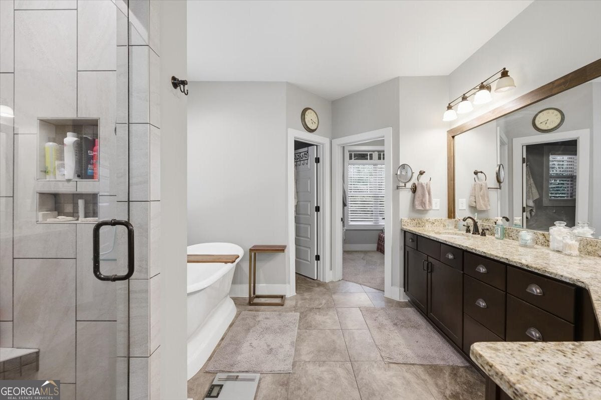 - Interior FeaturesAttic Expandable, Bookcases, Double Vanity, Master On Main Level, Separate Shower, Soaking Tub, Split Bedroom Plan, Tile Bath, Vaulted Ceiling(s), Walk-In Closet(s)