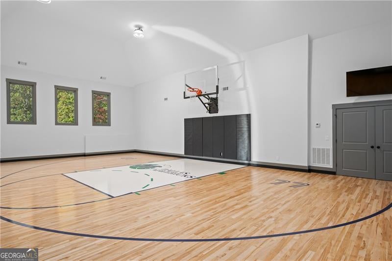 Stunning Home, meticulously maintained, on beautiful acreage. Relaxing front porch has double glass & iron doors that open into a fabulous floorplan. Comfortable Office/TV Room with french doors is just off the Foyer. Another Flex Room/Dining Room/Sitting Room is on the other side of the Foyer. Spacious two story Great Room with loads of windows includes built-in bookcases and a fireplace, and overlooks backyard pool. Great Room is open to large kitchen with oversized island, breakfast bar, lots of cabinet space, walk-in pantry, and top-of-the line appliances including two Viking dishwashers, Viking Refrigerator and Freezer, vegetable sink, and Ilve oven and range with custom-crafted copper vent hood. Kitchen has an open dining space and french doors that lead to relaxing screened porch - great for outside tv watching. Oversized utility/laundry room with laundry chute from upstairs. Mud room with built-ins. Beautifully appointed powder room. Private main level owners suite has a wall of windows in the sitting area that look out to large, private backyard. Luxurious owners bathroom has beautiful spa-like shower with double shower heads, soaking tub, spacious double vanities, his and her water closets, and custom-designed walk-in owners closet. Upper level features a fabulous open loft area and three fabulous bedroom suites - each with a private bathroom and walk-in closet with built-ins, as well as a spacious Media Room. Finished terrace level is an entertainers dream and features a family room with french doors out to covered back patio, game area, full kitchen with large island, full pool bathroom with steam shower, exercise/music room, large theater room, a full bedroom suite with its own private bathroom, and... a spectacular indoor basketball court. Outdoors offers spacious covered areas for seating as well as a covered grilling/kitchen station with seating, a magnificent salt-water pool, enormous yard, and beautiful hardwoods. Three car garage. Cul-de-sac street. 5 minutes from a private school.