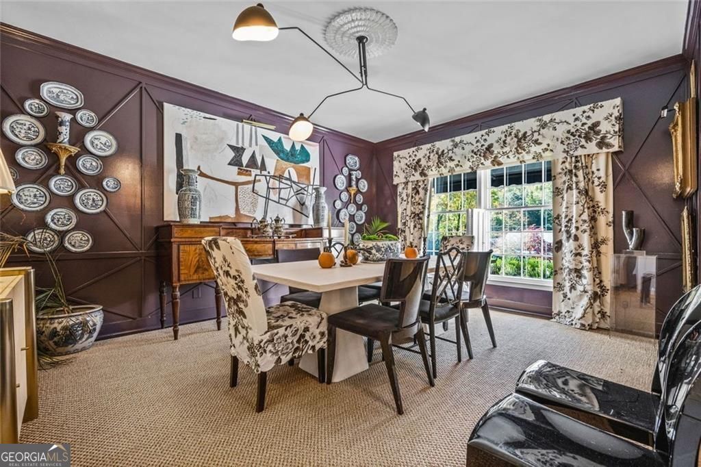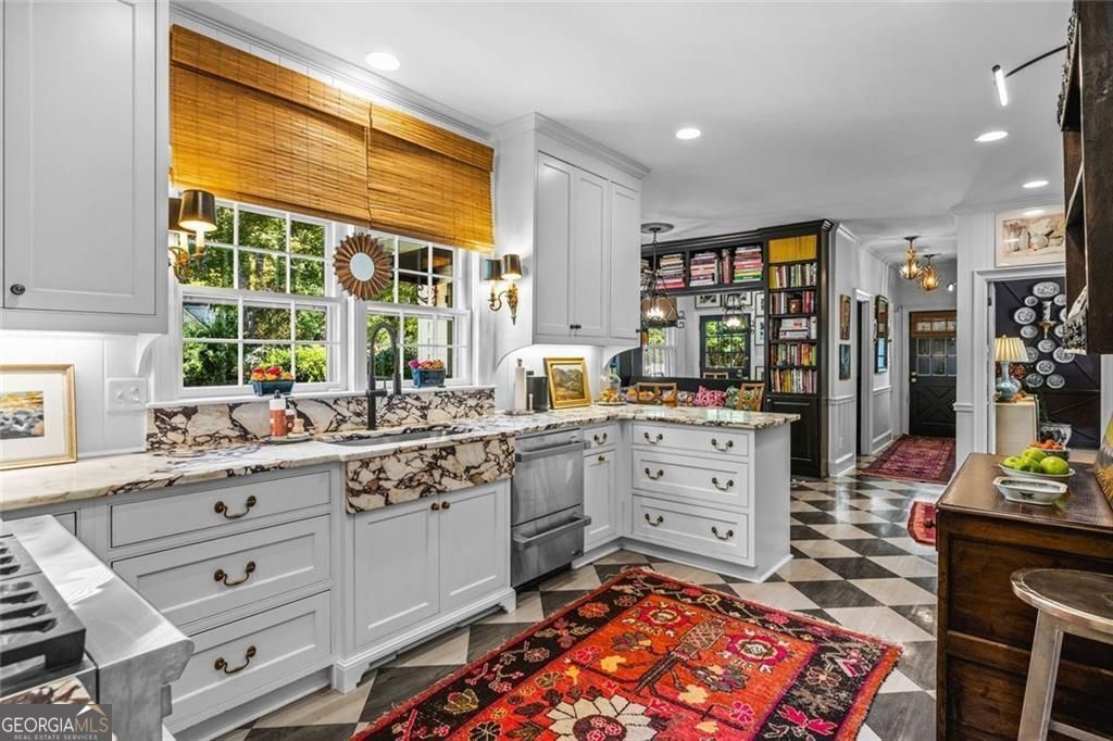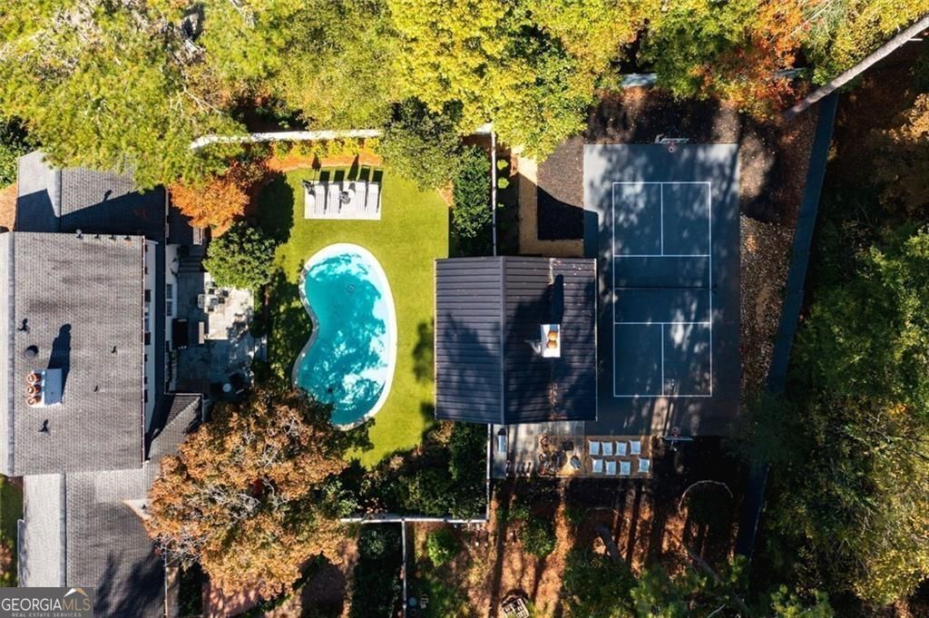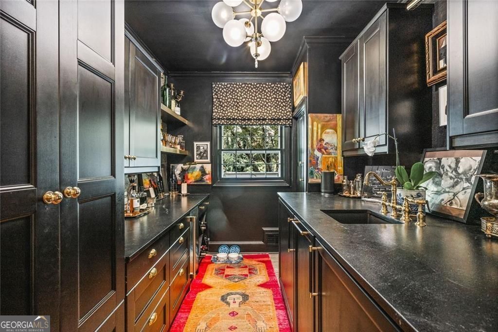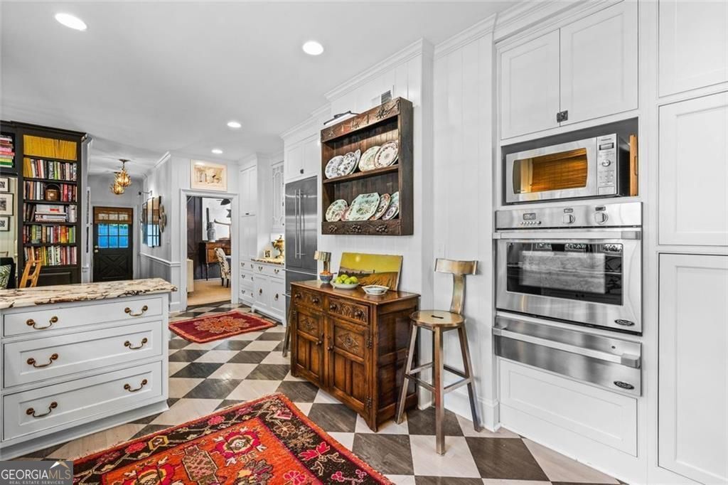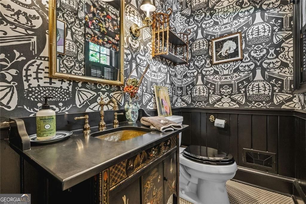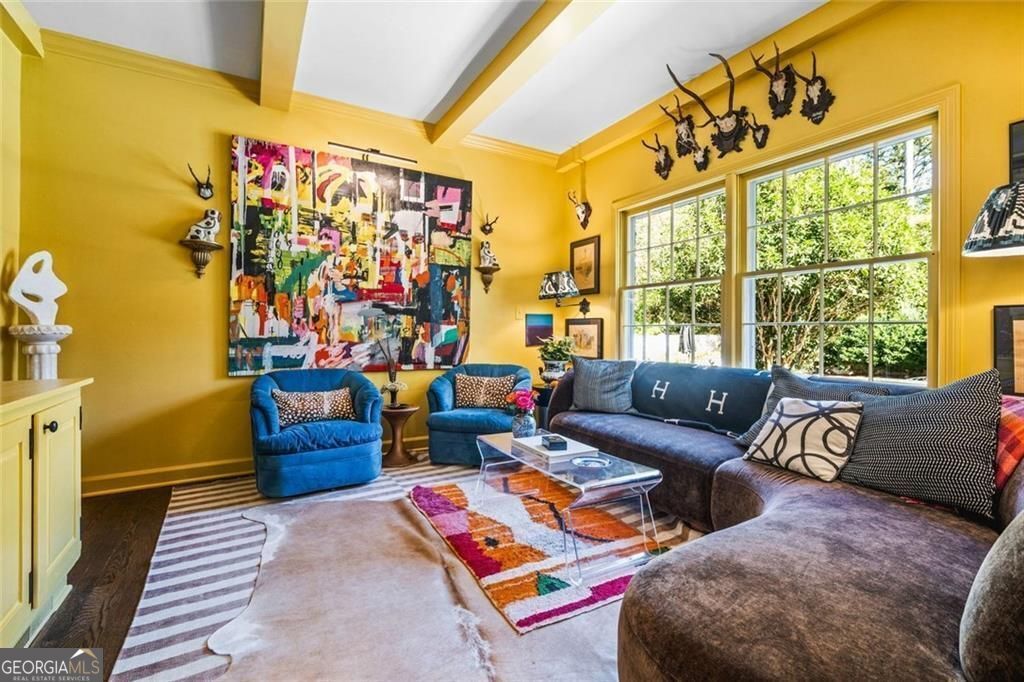 Tucked quietly within one of Marietta's most coveted neighborhoods, this masterfully transformed estate is where architectural heritage meets magazine-worthy design. Every inch has been thoughtfully curated, not simply renovated, but reimagined. Manicured grounds and flickering gas lanterns create a warm sense of arrival, while the timeless facade hints at the craftsmanship within. Inside, original brick flooring, arched doorways, and beamed ceilings set a rich architectural tone rarely found today. The living room is expansive yet inviting, anchored by a striking gas fireplace and filled with natural light. It flows seamlessly into a generously scaled dining space designed for gatherings that linger. At the heart of the home, the chef's kitchen makes a statement with commercial-grade appliances, dramatic black-and-white checkered stained hardwoods, and one-of-a-kind granite countertops. A built-in breakfast nook adds charm, while a moody wet bar with concealed laundry elevates both style and function. Just beyond, a tucked-away library nook offers a quiet retreat. The main-level primary suite feels private and indulgent, complete with a marble bath and custom closet. Designer finishes, including distinctive Gucci wallpaper, add layers of sophistication throughout. Upstairs, four spacious bedrooms and two renovated baths provide flexibility and comfort, with ample storage offering future potential. The terrace level expands the lifestyle with a welcoming family room, dedicated gym, and full bath with direct pool access. Out back, a true resort setting awaits: saltwater pool, expansive heated cabana with industrial fans, and a full-sized basketball and pickleball court - all framed by picturesque views of Kennesaw Mountain. Just minutes from Historic Marietta Square yet peacefully positioned within Oakton, this is a rare opportunity to own a fully realized vision in one of Marietta's most treasured communities.