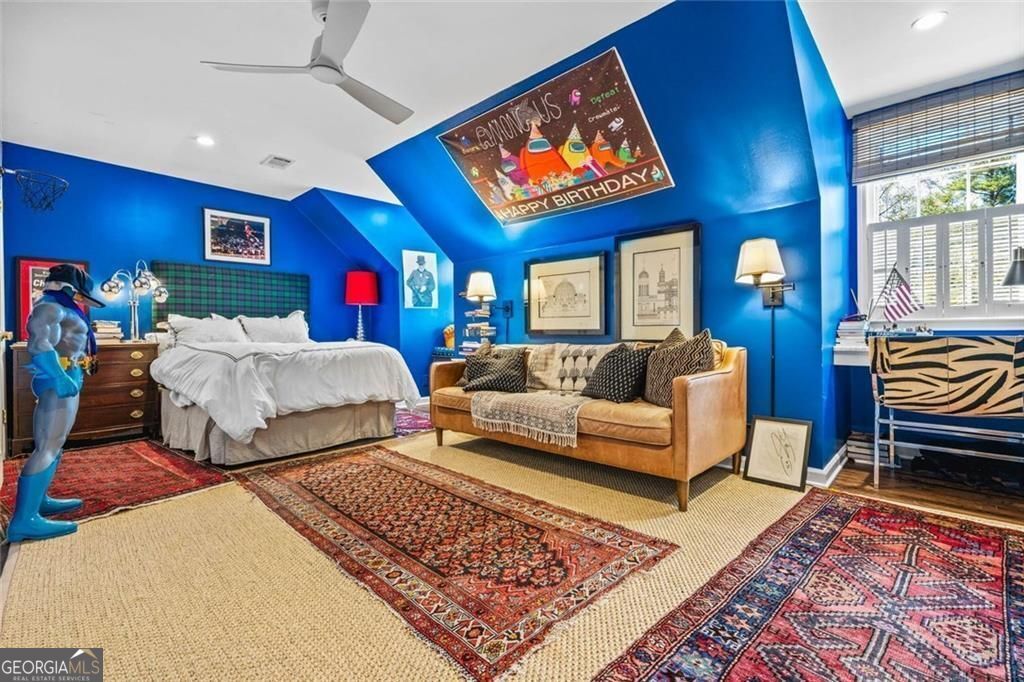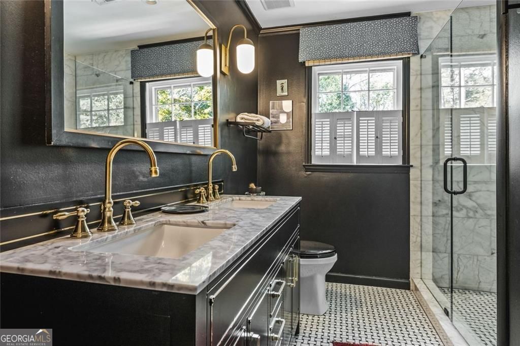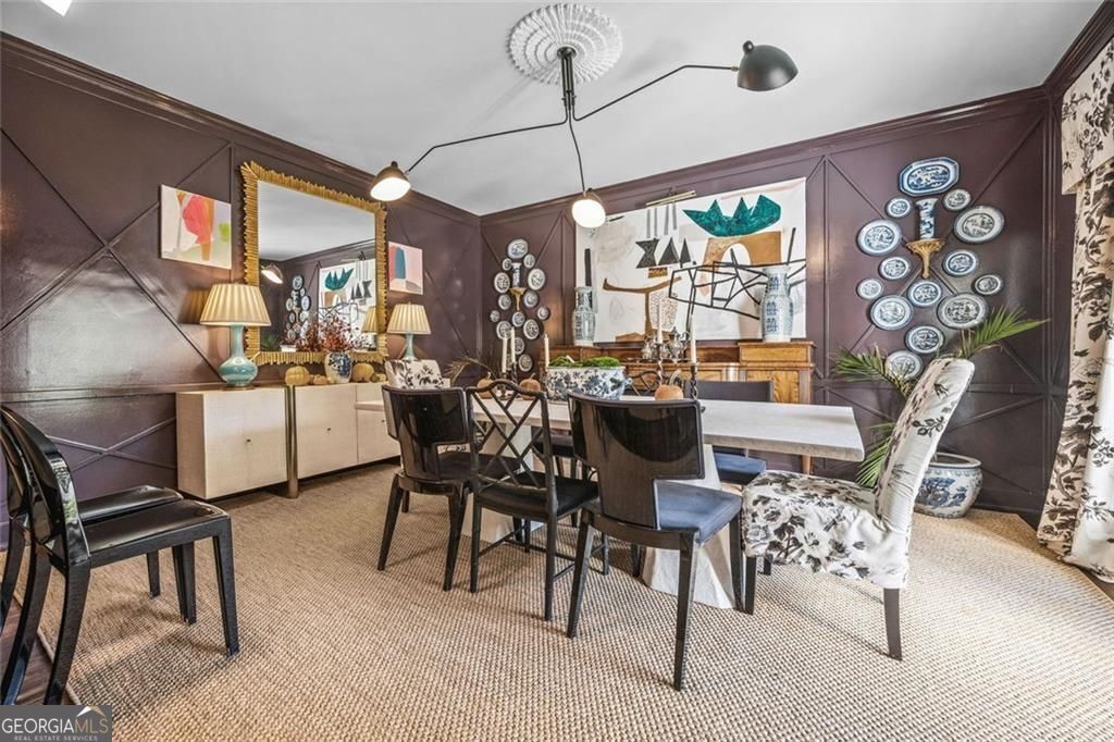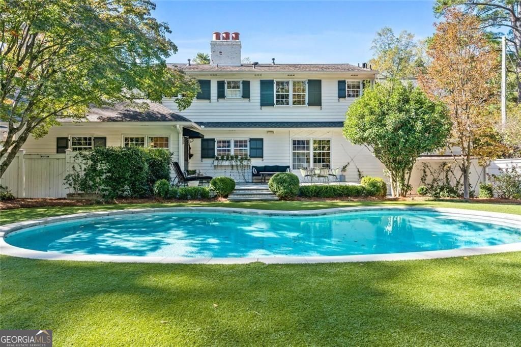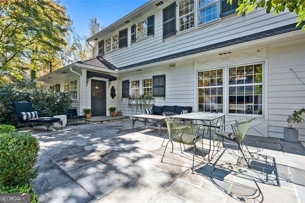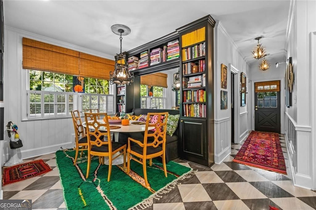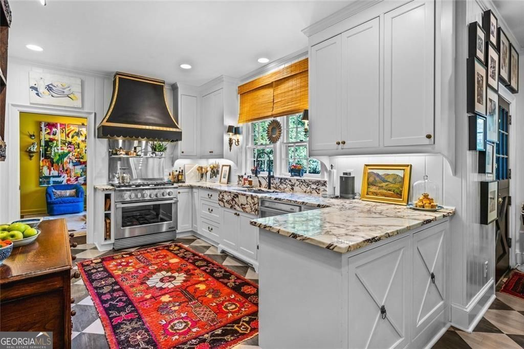 Tucked quietly within one of Marietta's most coveted neighborhoods, this masterfully transformed estate is where architectural heritage meets magazine-worthy design. Every inch has been thoughtfully curated, not simply renovated, but reimagined. Manicured grounds and flickering gas lanterns create a warm sense of arrival, while the timeless facade hints at the craftsmanship within. Inside, original brick flooring, arched doorways, and beamed ceilings set a rich architectural tone rarely found today. The living room is expansive yet inviting, anchored by a striking gas fireplace and filled with natural light. It flows seamlessly into a generously scaled dining space designed for gatherings that linger. At the heart of the home, the chef's kitchen makes a statement with commercial-grade appliances, dramatic black-and-white checkered stained hardwoods, and one-of-a-kind granite countertops. A built-in breakfast nook adds charm, while a moody wet bar with concealed laundry elevates both style and function. Just beyond, a tucked-away library nook offers a quiet retreat. The main-level primary suite feels private and indulgent, complete with a marble bath and custom closet. Designer finishes, including distinctive Gucci wallpaper, add layers of sophistication throughout. Upstairs, four spacious bedrooms and two renovated baths provide flexibility and comfort, with ample storage offering future potential. The terrace level expands the lifestyle with a welcoming family room, dedicated gym, and full bath with direct pool access. Out back, a true resort setting awaits: saltwater pool, expansive heated cabana with industrial fans, and a full-sized basketball and pickleball court - all framed by picturesque views of Kennesaw Mountain. Just minutes from Historic Marietta Square yet peacefully positioned within Oakton, this is a rare opportunity to own a fully realized vision in one of Marietta's most treasured communities.