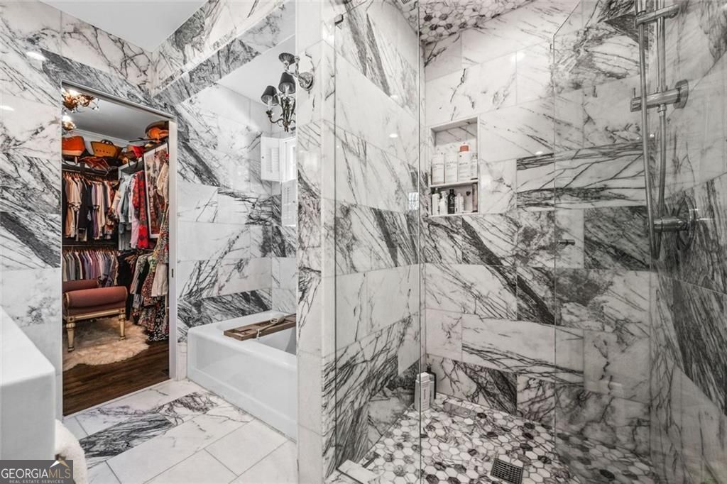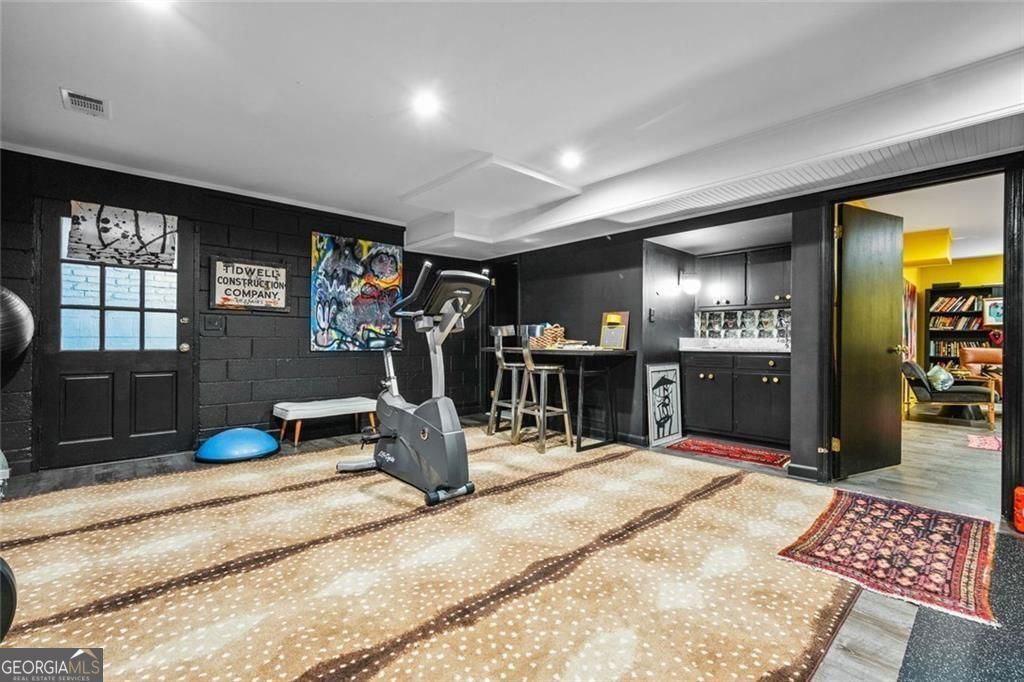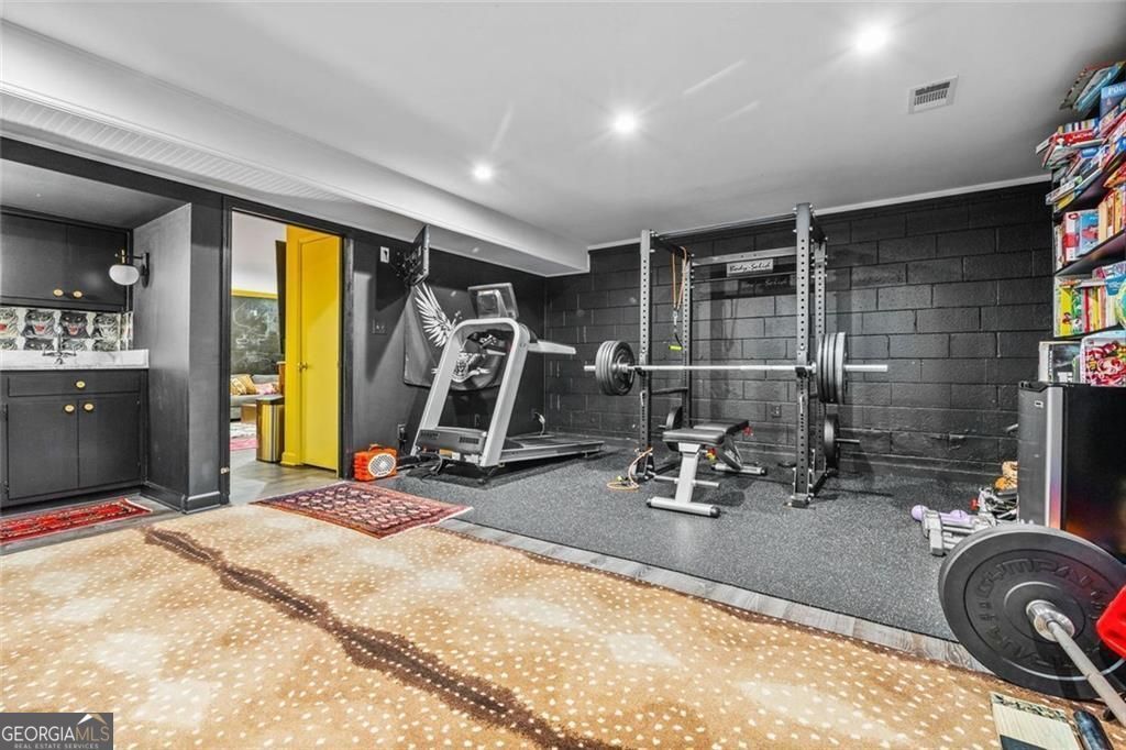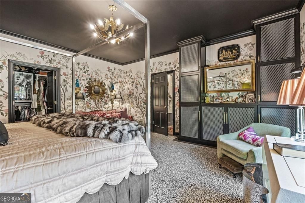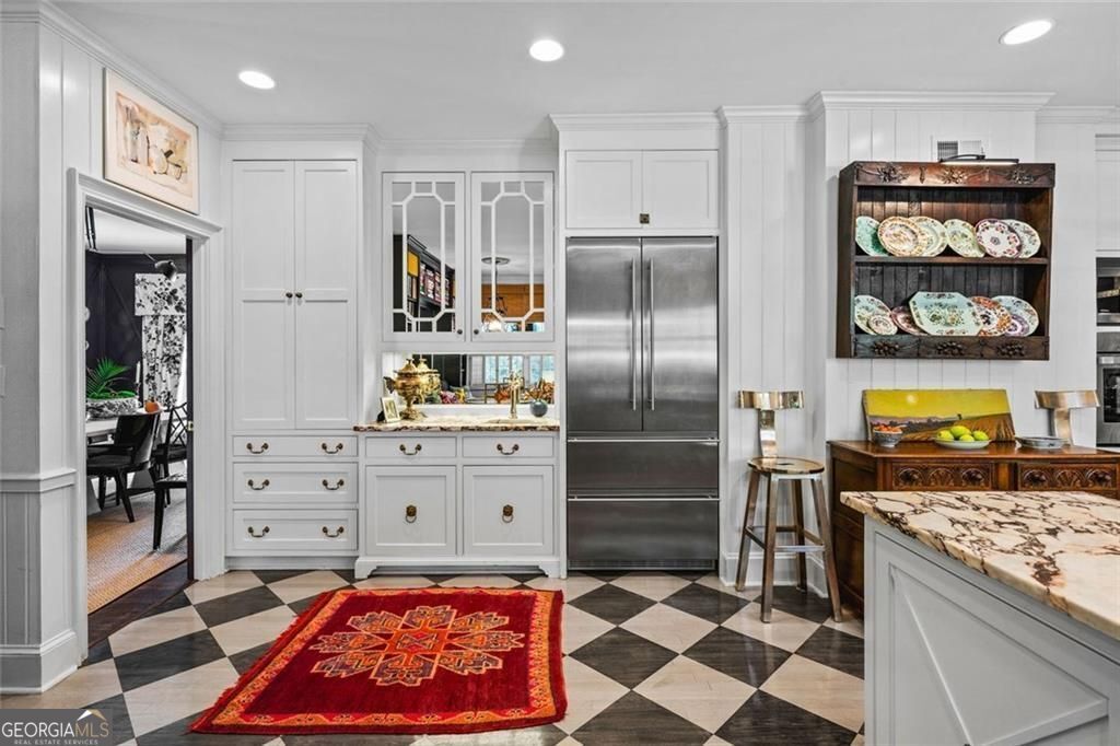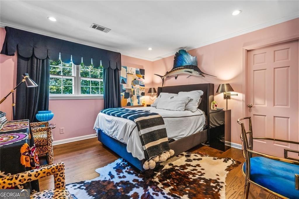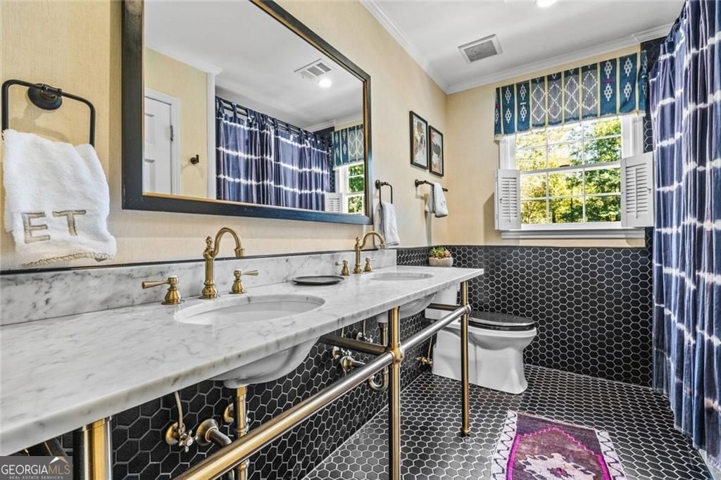 Tucked quietly within one of Marietta's most coveted neighborhoods, this masterfully transformed estate is where architectural heritage meets magazine-worthy design. Every inch has been thoughtfully curated, not simply renovated, but reimagined. Manicured grounds and flickering gas lanterns create a warm sense of arrival, while the timeless facade hints at the craftsmanship within. Inside, original brick flooring, arched doorways, and beamed ceilings set a rich architectural tone rarely found today. The living room is expansive yet inviting, anchored by a striking gas fireplace and filled with natural light. It flows seamlessly into a generously scaled dining space designed for gatherings that linger. At the heart of the home, the chef's kitchen makes a statement with commercial-grade appliances, dramatic black-and-white checkered stained hardwoods, and one-of-a-kind granite countertops. A built-in breakfast nook adds charm, while a moody wet bar with concealed laundry elevates both style and function. Just beyond, a tucked-away library nook offers a quiet retreat. The main-level primary suite feels private and indulgent, complete with a marble bath and custom closet. Designer finishes, including distinctive Gucci wallpaper, add layers of sophistication throughout. Upstairs, four spacious bedrooms and two renovated baths provide flexibility and comfort, with ample storage offering future potential. The terrace level expands the lifestyle with a welcoming family room, dedicated gym, and full bath with direct pool access. Out back, a true resort setting awaits: saltwater pool, expansive heated cabana with industrial fans, and a full-sized basketball and pickleball court - all framed by picturesque views of Kennesaw Mountain. Just minutes from Historic Marietta Square yet peacefully positioned within Oakton, this is a rare opportunity to own a fully realized vision in one of Marietta's most treasured communities.