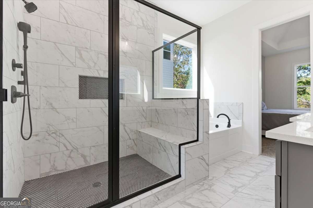Welcome to the Littleson Plan at Carter Grove - where timeless design meets modern convenience! Step inside to discover a spacious primary suite on the main level, complete with vaulted ceilings, an abundance of natural sunlight, and serene views of the wooded backyard. The spa-inspired ensuite bath features a large double vanity, soaking tub, and separate shower, creating the perfect retreat after a long day. Upstairs, you'll find four generously sized bedrooms and two full bathrooms. One of the bedrooms features its own private ensuite bath, making it an ideal guest suite or retreat for family members. The thoughtful layout ensures comfort and privacy for everyone. The heart of the home is the chef-inspired kitchen with sleek quartz countertops, high-end soft-close cabinetry, a spacious island, and a sunlit breakfast area - ideal for everyday living and entertaining. Throughout the home, elegant details combine with practical design to create a space that feels both warm and refined. Nestled in the highly sought-after Carter Grove community, residents enjoy a true sense of neighborhood charm paired with resort-style amenities. Explore everything this golf cart-friendly community has to offer - from the luxurious clubhouse, gated pool, tennis courts, and playgrounds to beautifully maintained sidewalks and lush landscaping. Just steps away, you'll find Woodland Hills Golf Club, making it easy to enjoy a round of golf or a peaceful walk. The location couldn't be better - just minutes from Downtown Cartersville's dining, shopping, and entertainment, plus convenient access to Red Top Mountain State Park, the Etowah River, and LakePoint Station. Whether you're seeking outdoor adventure or the ease of suburban living, this home delivers it all. As an added bonus, we're offering $5,000 in closing costs OR a temporary rate buydown when you finance with our preferred lender, Matt Garcia with Supreme Lending. Don't miss the opportunity to make this dream home yours in one of Cartersville's most desirable neighborhoods!