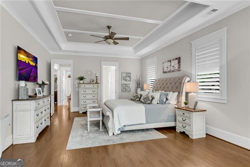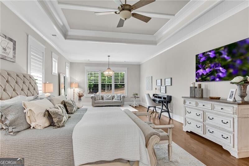 POOL-READY LOT! See example photos at the end of the gallery for the incredible backyard oasis you can build. (Pool builder contact details in agent remarks.) Welcome to this custom-enlarged version of the coveted DFW Ventures "Bridgefield" plan, located in the exclusive Sarazen's Corner enclave of Chateau Elan-where every home includes a deeded MANDATORY Legends GOLF CLUB Membership. Situated on a beautifully landscaped 0.72-acre fenced corner lot, this property showcases landscape lighting on all four sides and exceptional craftsmanship throughout. Step inside to find 10' ceilings and 8' doors on the main level, site-finished hardwoods throughout (NO carpet!), and a striking hardwood staircase with upgraded iron balusters. The formal dining room features a custom paneled accent wall, while the great room impresses with its 13' coffered ceiling, built-in bookcases, stacked-stone fireplace, and even a discreet pet door cleverly built into the cabinetry. The chef's kitchen is a true showpiece-designed with custom floor-to-ceiling cabinetry, quartz countertops, two pantries, and a premium KitchenAid appliance suite including a 48" double gas range, convection microwave, warming drawer, 42" built-in refrigerator, and space for beverage center or wine fridge. An oversized eat-in area makes this the heart of the home. The main-level primary suite is an expansive retreat, complete with a sitting area, double vanities with stacked center cabinetry, an oversized dual "super shower," and a custom walk-in closet connected directly to the laundry room (with cabinetry and sink). A main-level guest suite with private bath, mud-room lockers, and a stylish half bath complete the first floor. Enjoy an oversized 3-car garage that easily fits trucks, plus a storage room and an extended driveway with generous guest parking. Outdoor living is exceptional with a covered patio featuring a wood-burning fireplace and power retractable screens, plus an extended paver grilling patio, all overlooking the lushly landscaped, fenced backyard. Upstairs, discover two additional bedrooms with full baths and a spacious rec room-a standout feature that eliminates the need for a basement. With its beamed ceiling, wet bar, ice maker, and space for beverage center or wine fridge, there's ample room for a pool table, media lounge, or game space. This thoughtfully designed home is ideal for buyers who love to entertain but prefer a right-sized, highly efficient layout over a massive estate. Plantation shutters throughout add the final touch of luxury.