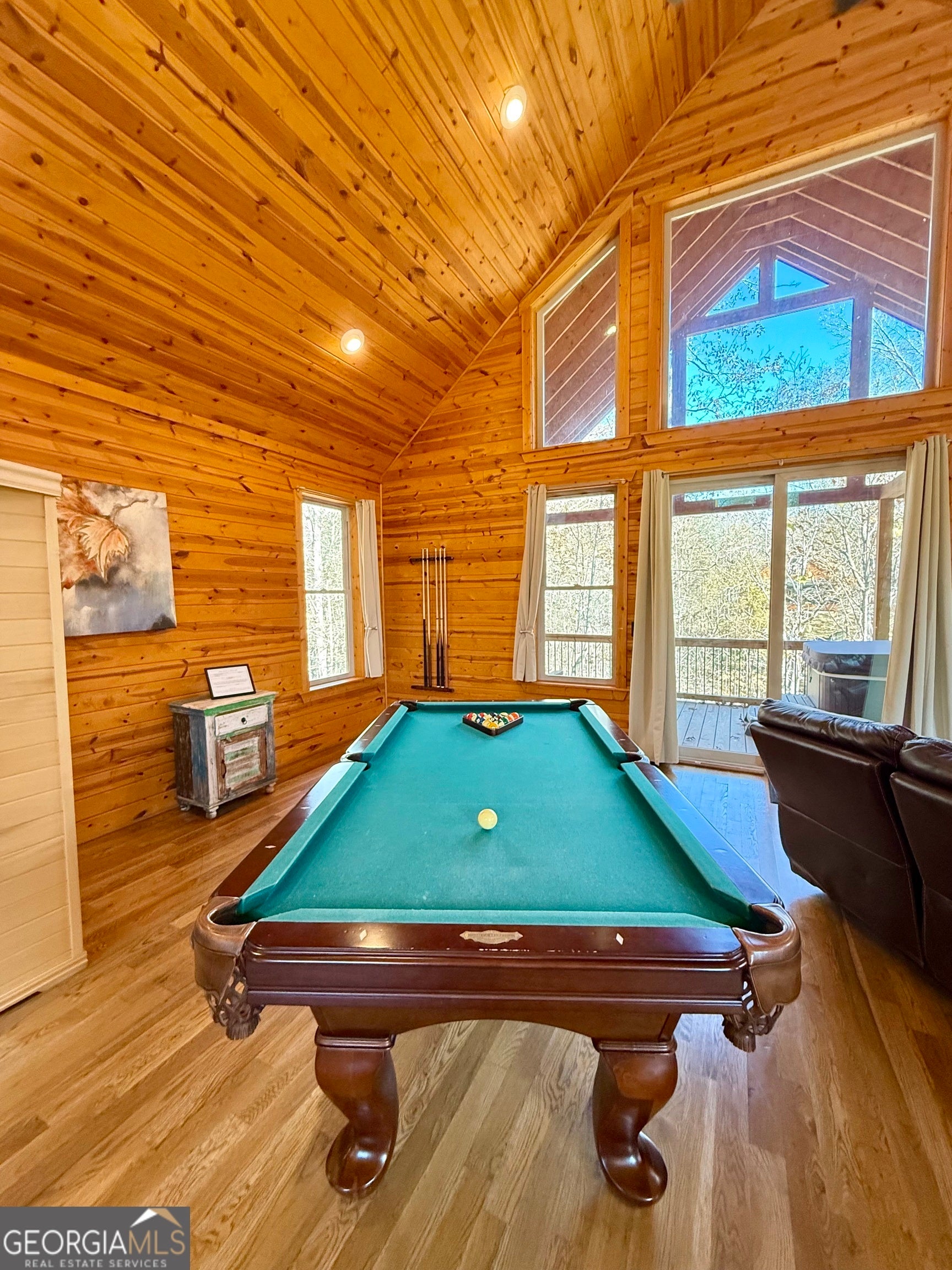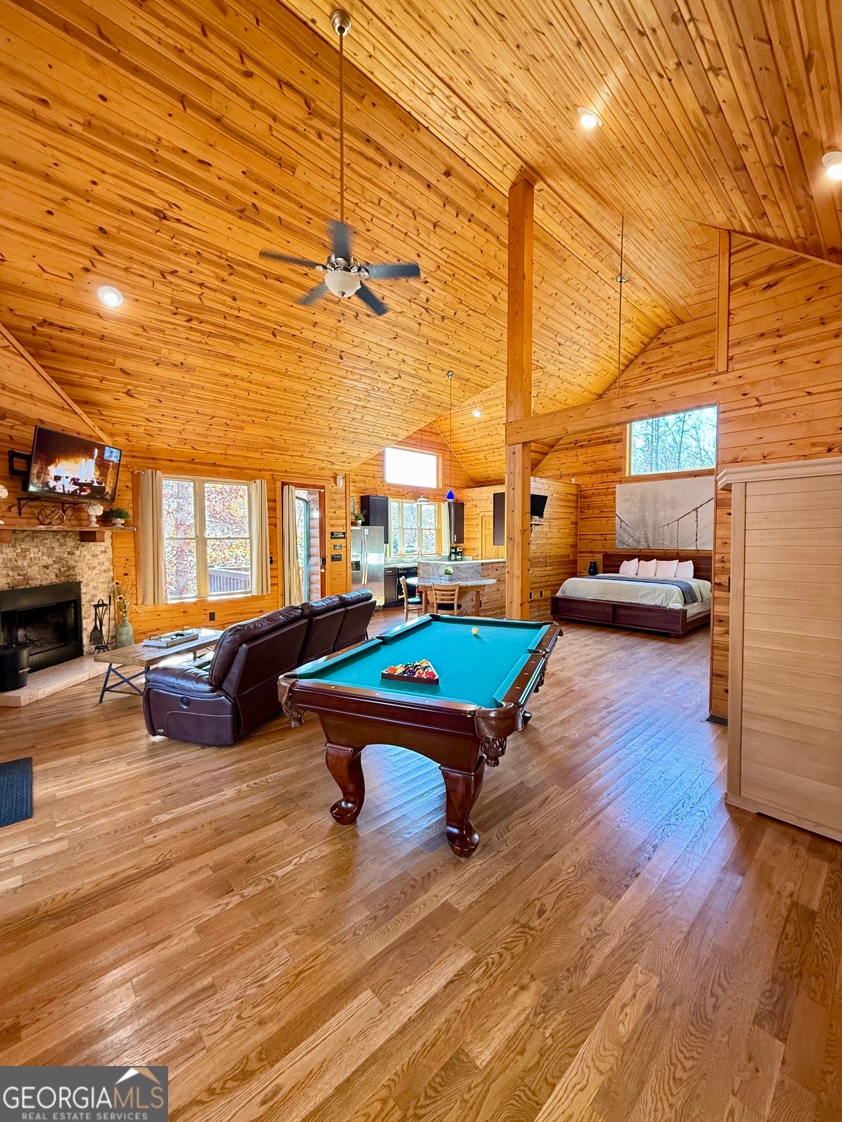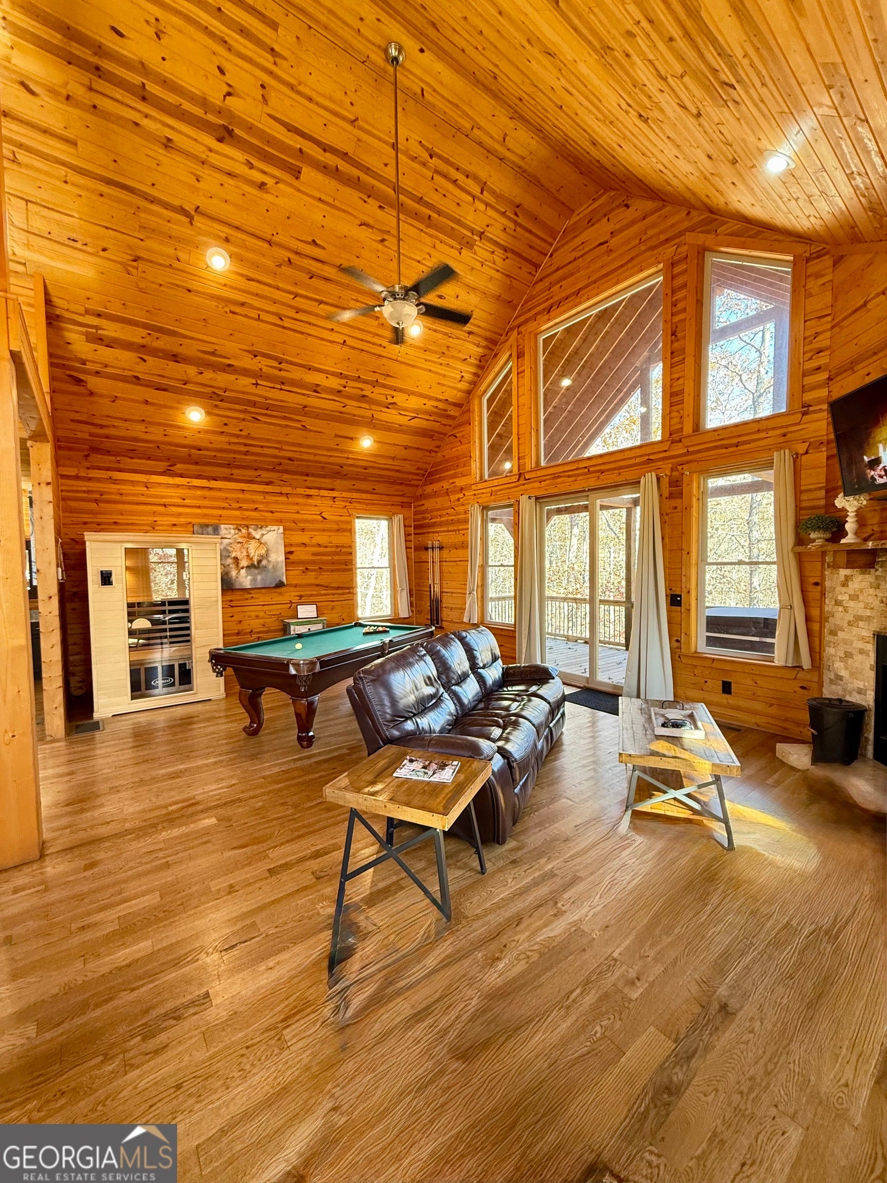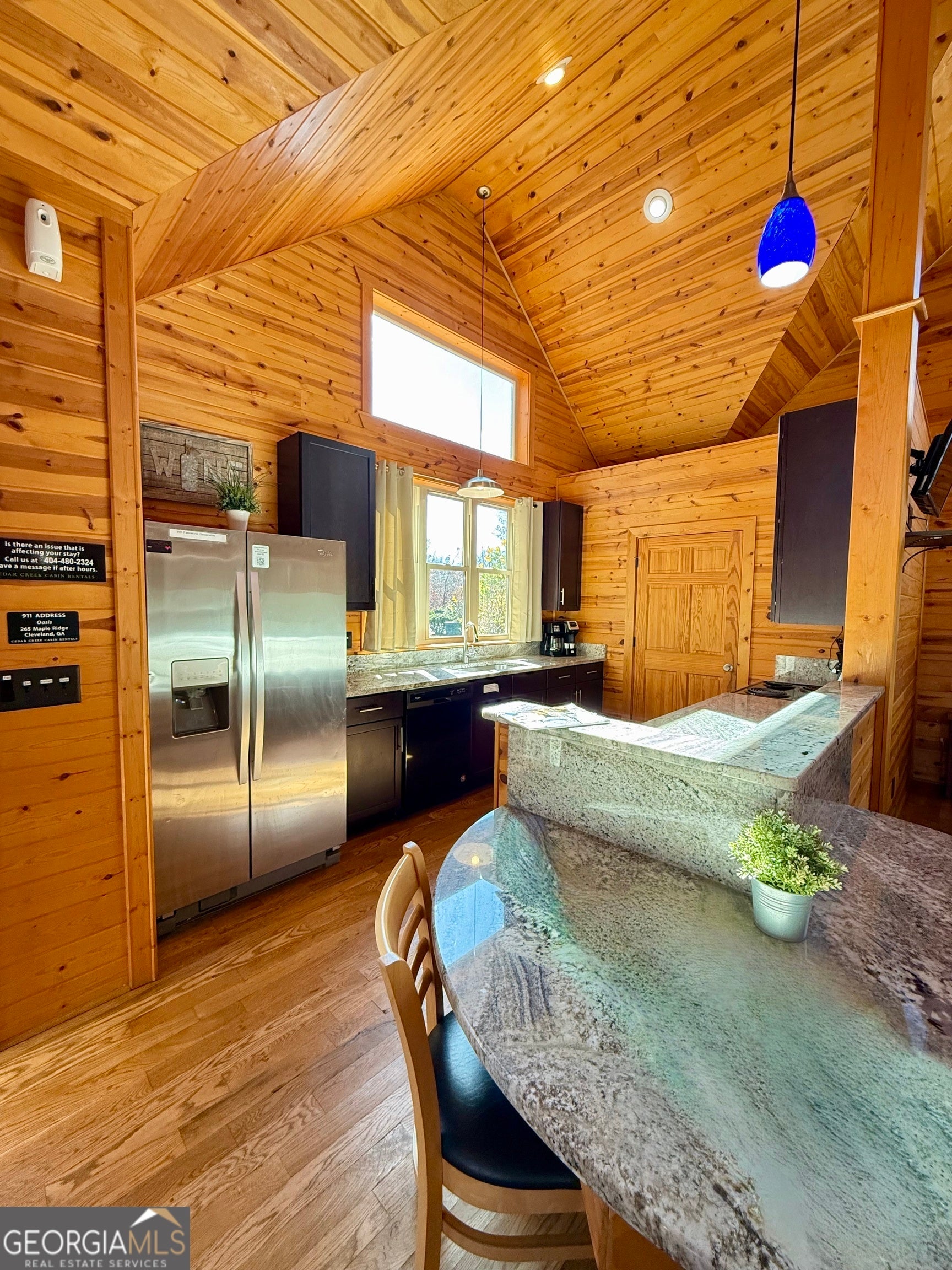 Welcome to "Oasis" - an income-producing mountain retreat ideally located at 265 Maple Ridge in Cleveland, GA. Perfectly situated near North Georgia's award-winning wineries and just minutes from Helen and Dahlonega, this charming cabin offers a true escape with outstanding rental potential. Step inside to an inviting open-concept layout highlighted by hardwood floors and tongue-and-groove walls and ceilings that create the quintessential cabin feel. The centerpiece of the home is the luxurious spa-style bathroom featuring a two-person walk-in tiled shower with dual rain shower heads, body jets, and handheld sprays, an oversized air tub, and a separate water closet. Relax in the cozy living area complete with a wood-burning fireplace, or enjoy cooking in the well-appointed kitchen with stone countertops. A laundry closet with stackable washer and dryer adds convenience. The private covered back deck is the perfect place to unwind, featuring a hot tub and peaceful wooded surroundings. Cabin is offered fully furnished, including a pool table and infrared sauna, making it turnkey for continued short-term rental success. Whether you're seeking an investment, a personal getaway, or both-Oasis delivers comfort, luxury, and an unbeatable location in the heart of North Georgia's wine country.