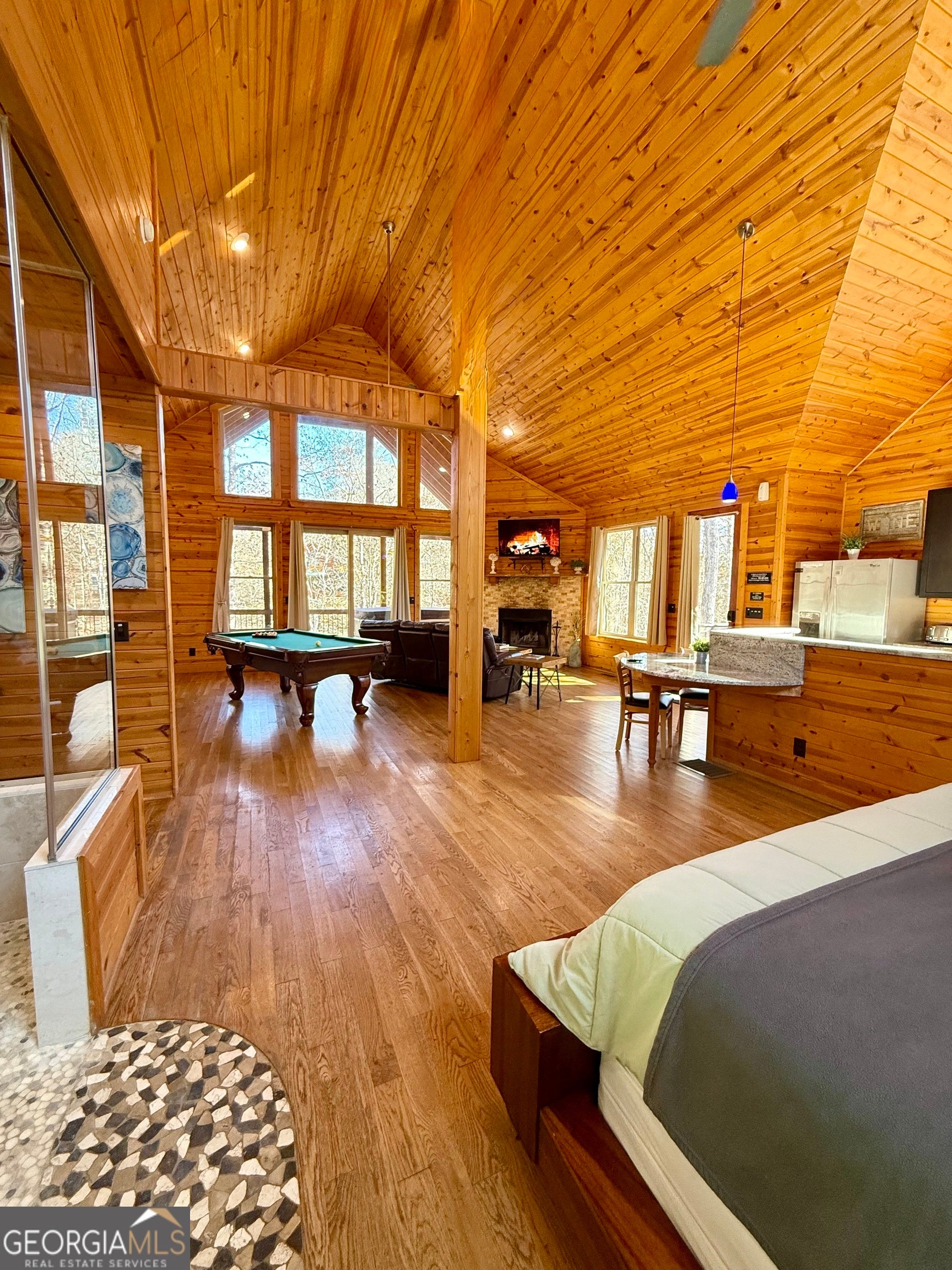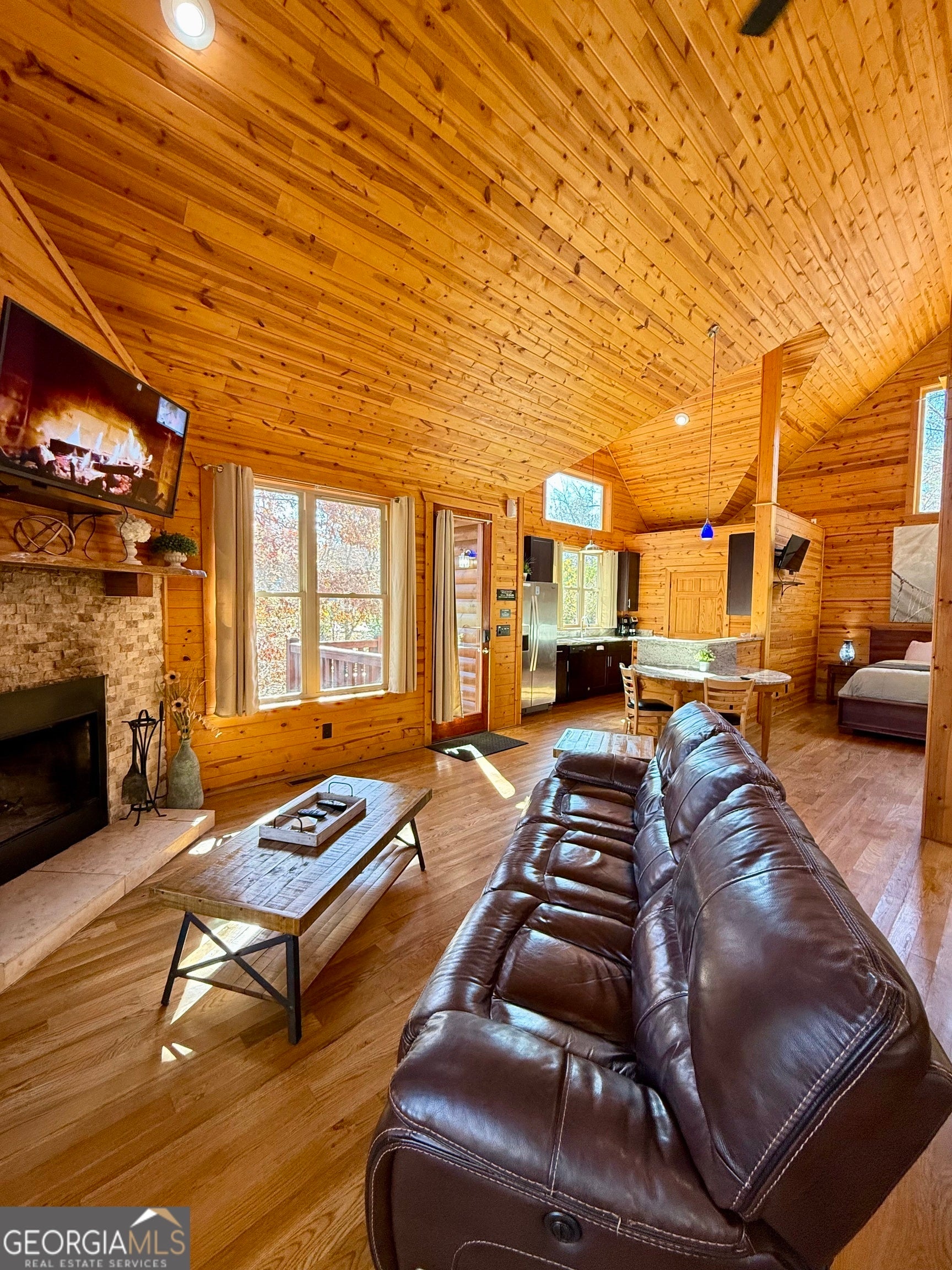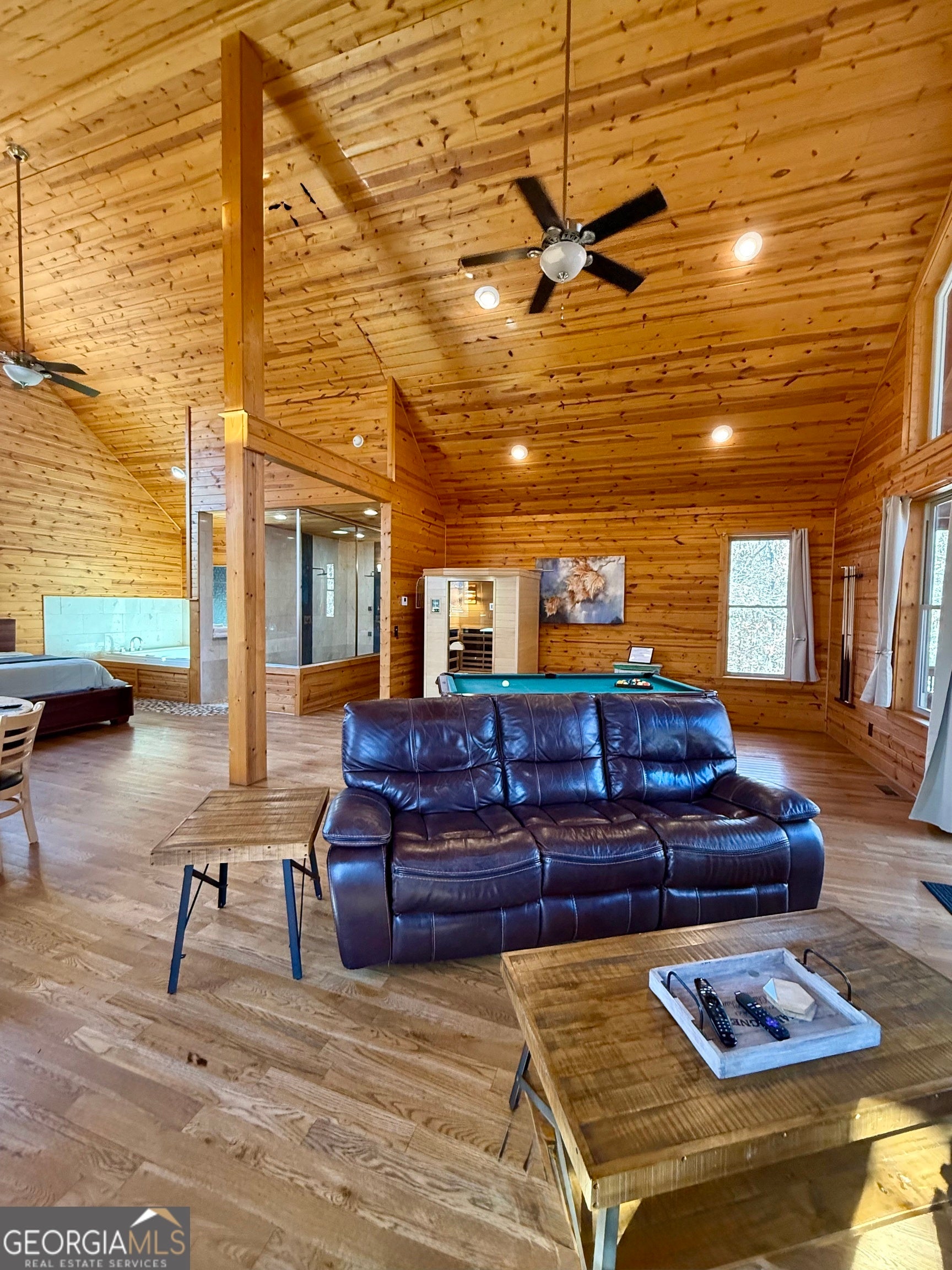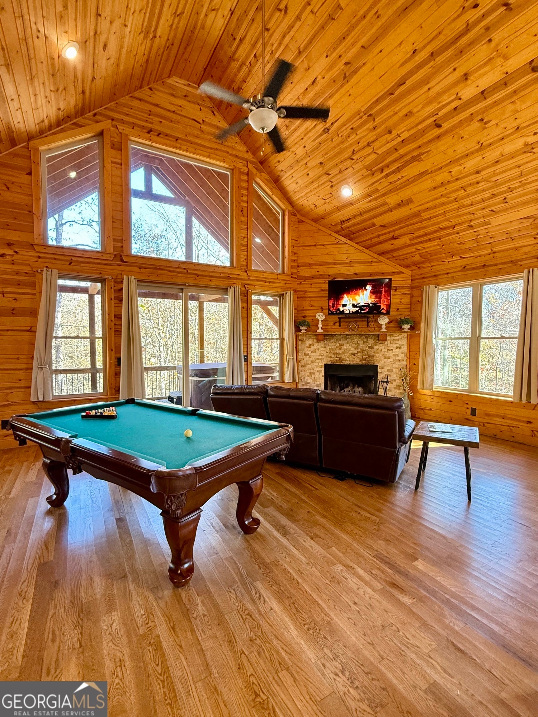 Welcome to "Oasis" - an income-producing mountain retreat ideally located at 265 Maple Ridge in Cleveland, GA. Perfectly situated near North Georgia's award-winning wineries and just minutes from Helen and Dahlonega, this charming cabin offers a true escape with outstanding rental potential. Step inside to an inviting open-concept layout highlighted by hardwood floors and tongue-and-groove walls and ceilings that create the quintessential cabin feel. The centerpiece of the home is the luxurious spa-style bathroom featuring a two-person walk-in tiled shower with dual rain shower heads, body jets, and handheld sprays, an oversized air tub, and a separate water closet. Relax in the cozy living area complete with a wood-burning fireplace, or enjoy cooking in the well-appointed kitchen with stone countertops. A laundry closet with stackable washer and dryer adds convenience. The private covered back deck is the perfect place to unwind, featuring a hot tub and peaceful wooded surroundings. Cabin is offered fully furnished, including a pool table and infrared sauna, making it turnkey for continued short-term rental success. Whether you're seeking an investment, a personal getaway, or both-Oasis delivers comfort, luxury, and an unbeatable location in the heart of North Georgia's wine country.