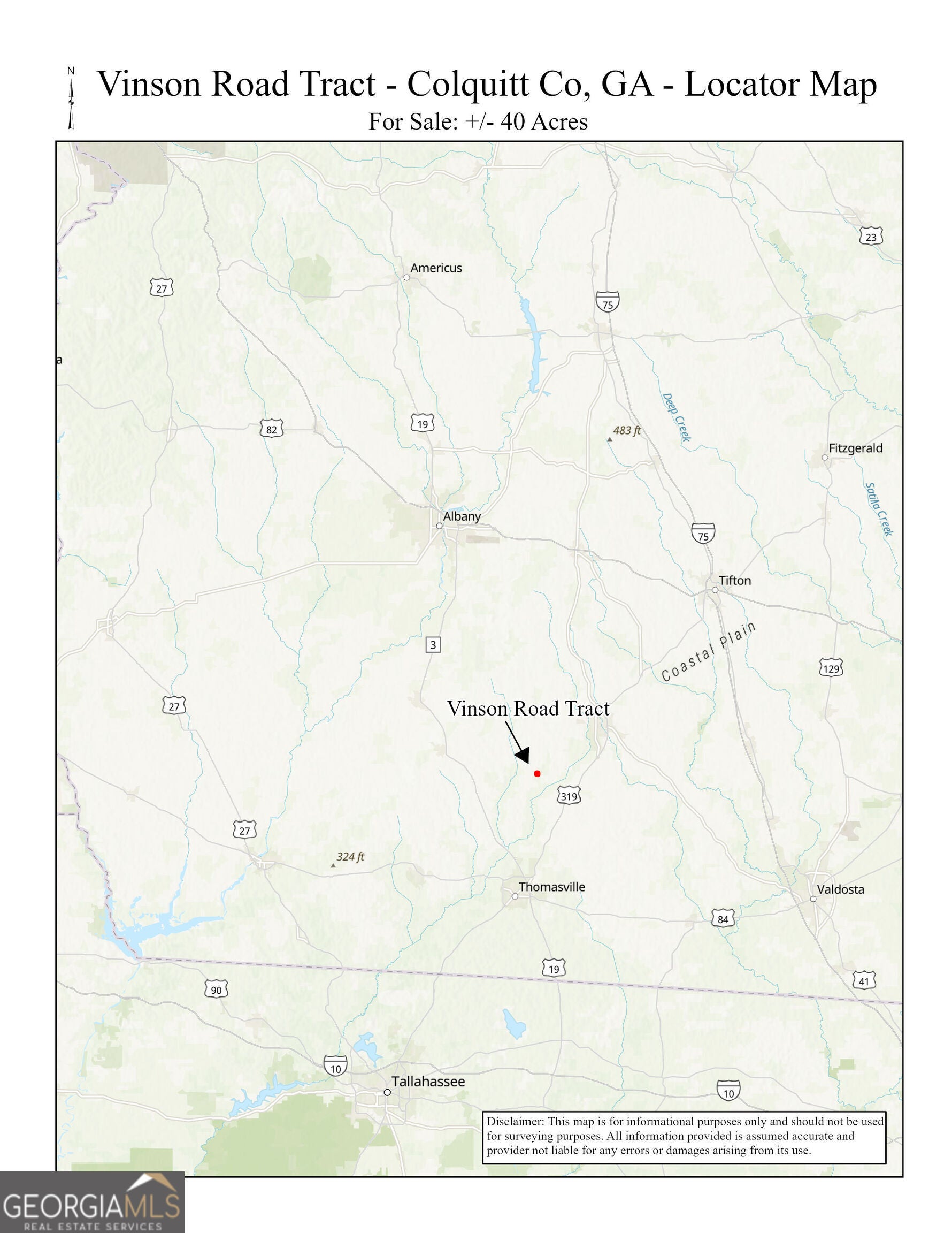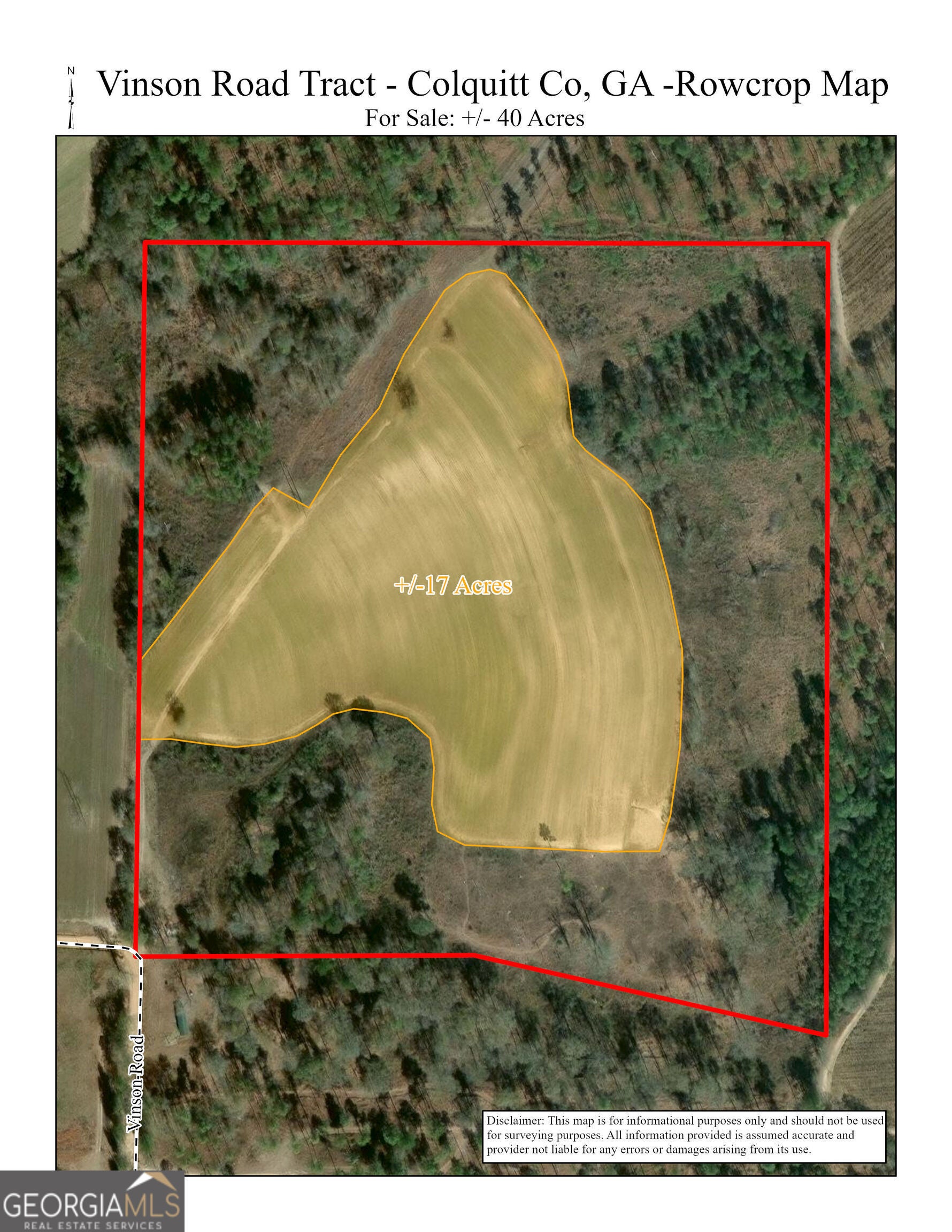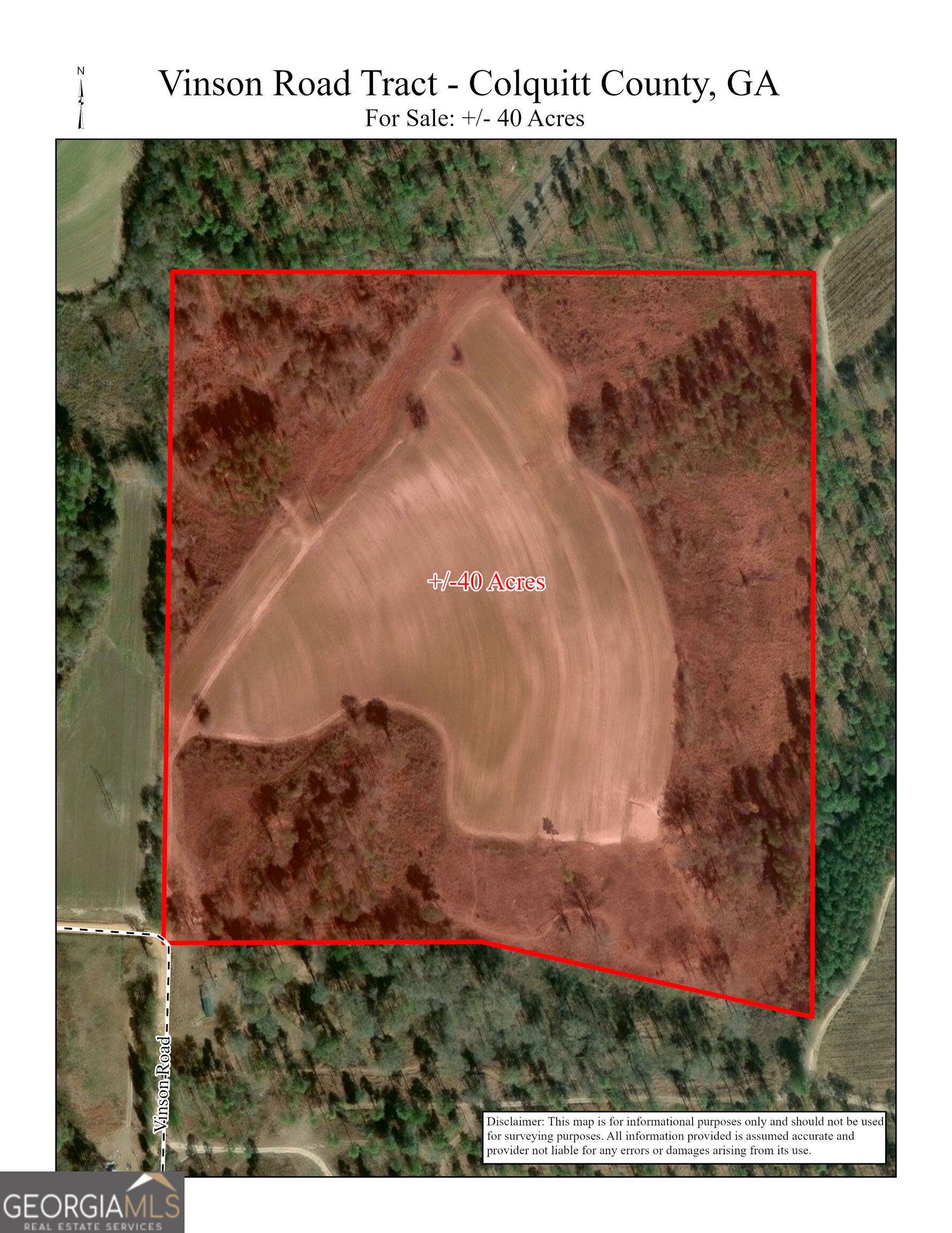 Vinson Road Tract is a 40 acre recreation and agricultural property located in Colquitt County, Georgia. The tract includes approximately 17 acres of rowcrop land, mixed pine/hardwoods, open land, and a small pond. The property supports diverse wildlife with a variety of cover types. It offers an excellent investment opportunity with rowcrop lease potential while providing outstanding recreational use. The property is surrounded by large quail plantation. The 40 acres being sold is part of a 48 acre parcel and will be subject to a survey.