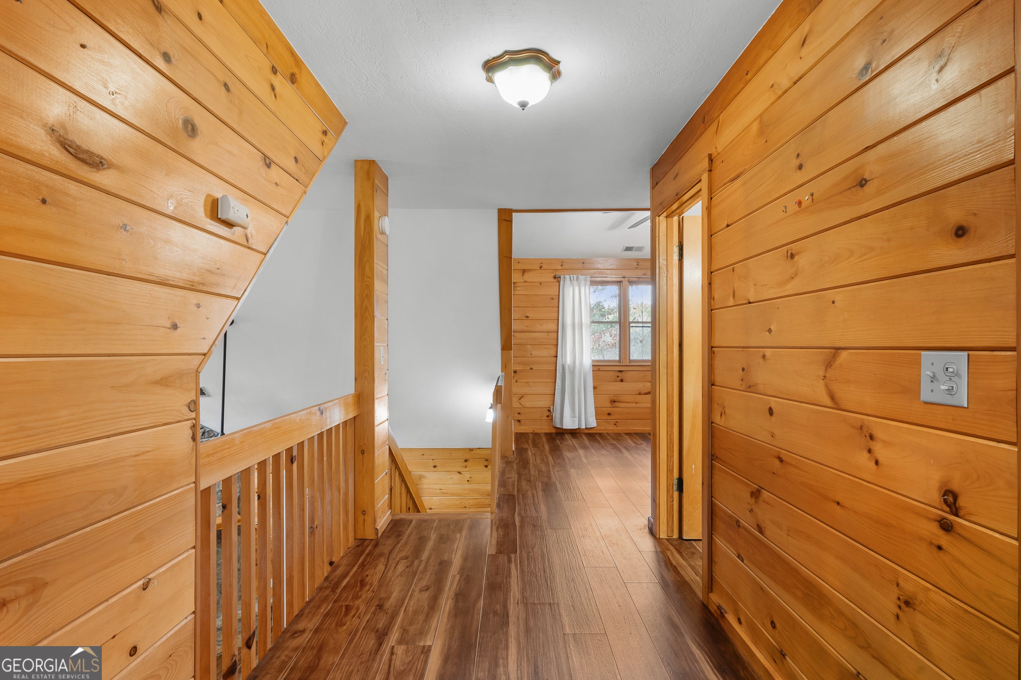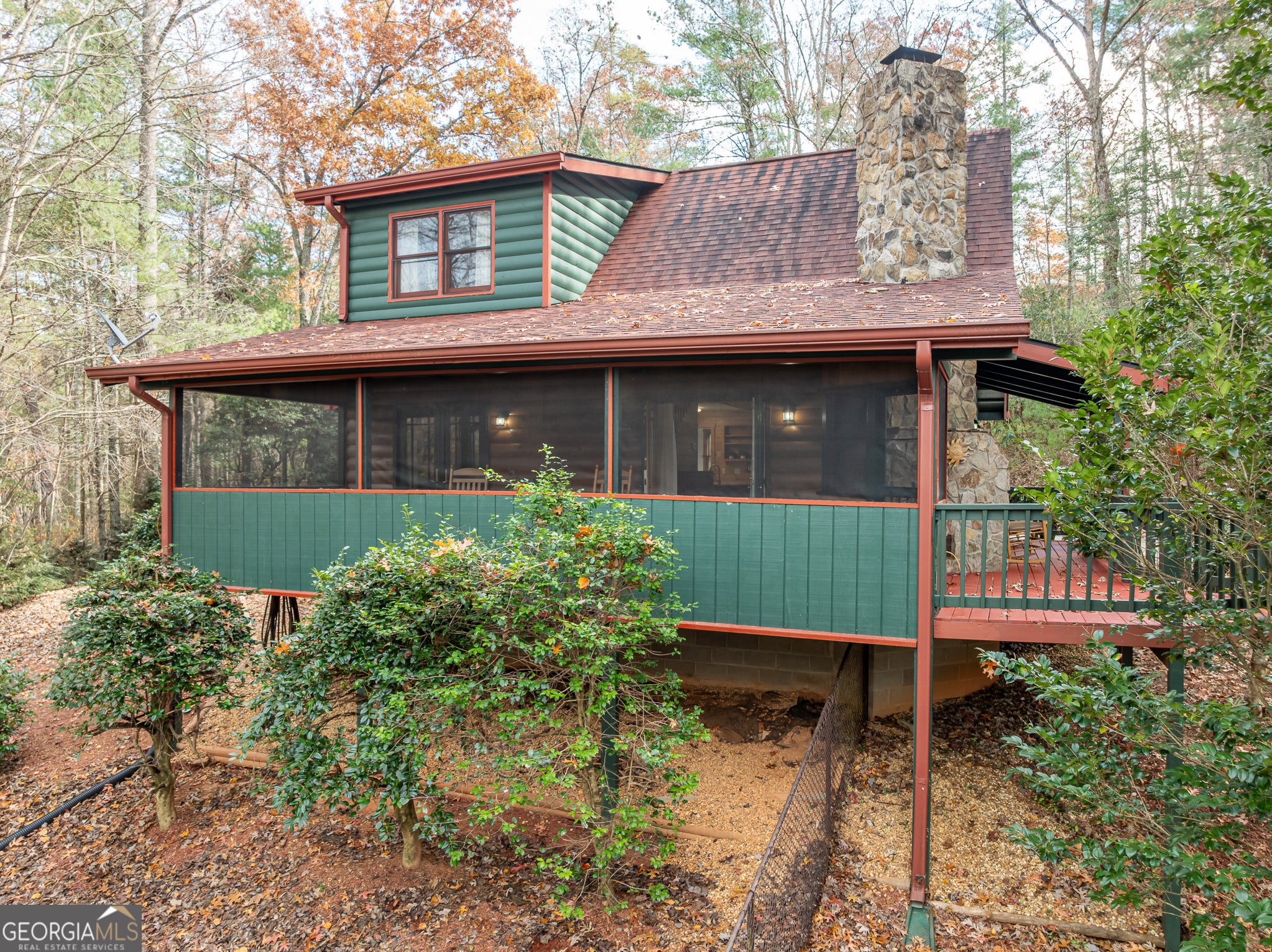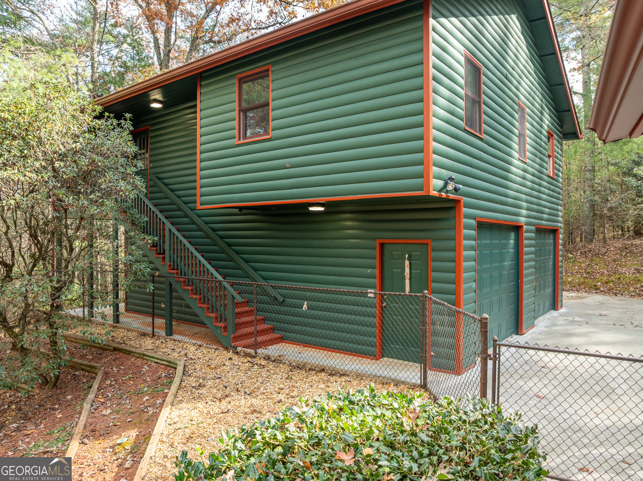 Tucked away on 8.74 wooded acres across three parcels, this well-cared-for property features two log-sided structures, a warm and inviting two-story main home and a spacious garage with a full apartment above, offering excellent flexibility for guests, long-term tenants, or short-term rental income. The main home opens to a vaulted living room with second-story windows that fill the space with natural light, a stacked stone gas log fireplace, and built-in bookcases with storage, along with easy access to the screened-in deck where ceiling fans and wooded views create a relaxing retreat. Tongue-and-groove wall paneling runs throughout, and the main level includes a comfortable bedroom with screened deck access, a full bath, a roomy laundry area with newer washer and dryer, and a bright kitchen that connects naturally to the living space. Upstairs, the primary bedroom offers privacy and its own full bath. The second structure is an immaculate two-car garage with added storage space and a half bath, and an exterior staircase leads to the generous two-bedroom, one-bath apartment featuring a full-size kitchen with pantry, a large living room with both a porch and a deck, and a stackable washer and dryer in the full bath. Additional perks include a fenced-in backyard, ample parking, a wooded lot that provides cool summer shade, and a small creek that enhances the natural setting. A Generac Protector QS generator powers both the main house and the garage apartment for peace of mind during outages. Schedule your private tour today and experience everything this versatile property has to offer.