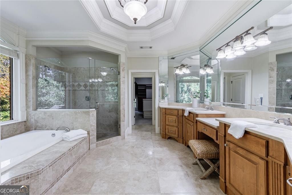 - Interior FeaturesBeamed Ceilings, Bookcases, Double Vanity, High Ceilings, Separate Shower, Vaulted Ceiling(s), Walk-In Closet(s), Wet Bar, Two Story Foyer, Whirlpool Bath