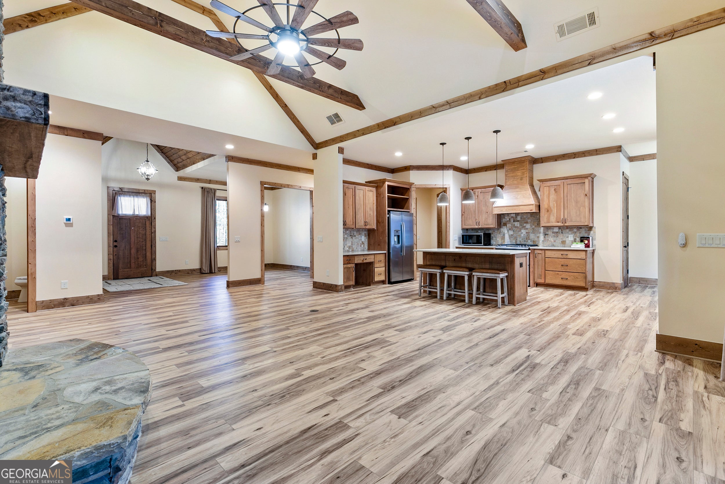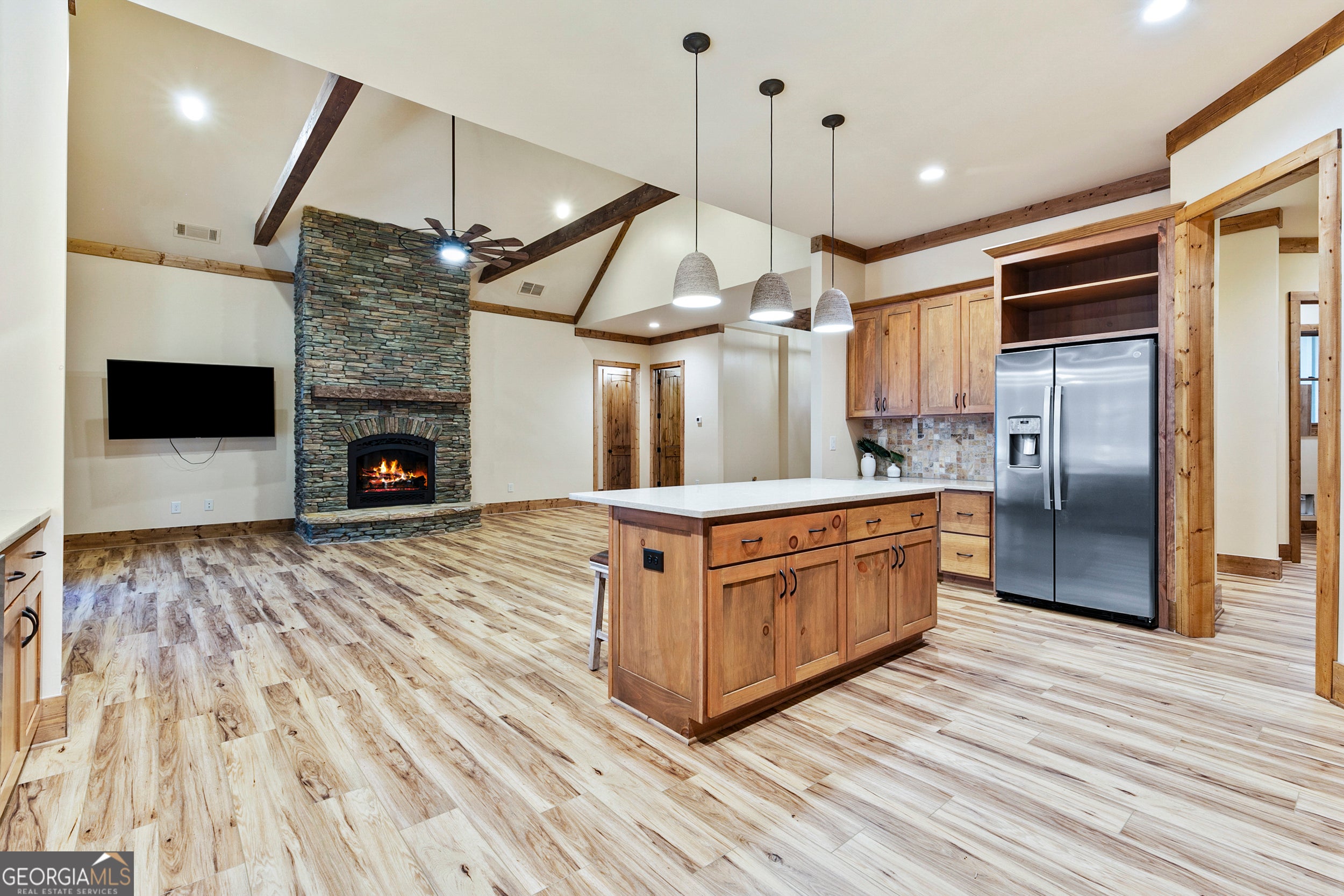 Escape to the mountains with this almost new, custom-built ranch home, completed in 2023, in the amenity-rich, gated Golf Cart Community of Bent Tree in Jasper, GA. This property is a rare opportunity for second-home buyers, STR investors, or those looking to retire or downsize from the Atlanta area. Custom Built in 2023 by Serenity Builders, this 3-bedroom, 2.5-bath home showcases newer construction quality and offers a flat driveway and secluded, wooded views throughout. The open layout is perfect for entertaining, featuring a vaulted beamed ceiling, a stacked stone fireplace, and a large front porch for enjoying the quiet nature surrounding the 1.13-acre lot. The gourmet kitchen boasts a large quartz island, double ovens (including a dual-fuel slide-in range), custom vent hood, and stainless-steel appliances (refrigerator included). Custom upgrades abound, including pull-out drawers and specialty organizers in nearly every cabinet. The primary suite is a true retreat with dual large walk-in closets, custom wall mirrors, dual vanities, a large soaking tub, and a separate tiled shower with a bench. Exceptional features include 8' solid core wood doors, crown trim, premium baseboards, Pella wood windows, custom draperies, custom closets, and a brand NEW 24kw whole house Generac generator. Relax on the screened-in back porch with a vaulted heart pine ceiling, overlooking the landscaped, partially fenced backyard with flagstone pavers. The home also includes an on-demand hot water heater with a no-salt water softener, new HVAC system, new Roof, new Electrical, new Everything and even including a stacked flagstone skirt on all four sides of the exterior. Bent Tree is known for its resort-style amenities, including an 18-hole Golf Course with pro shop and restaurant, two pools, an equestrian facility, a dog park, multiple trails, a 110-acre lake for swimming, boating, fishing, paddleboarding, and dedicated indoor/outdoor tennis and pickleball courts, community clubhouse, library, mail center and MORE. The community also features strong fellowship and many active activities to partake in. With a custom-built, almost-new home and incredible amenities, this property offers the perfect blend of luxury, convenience, and mountain escape.