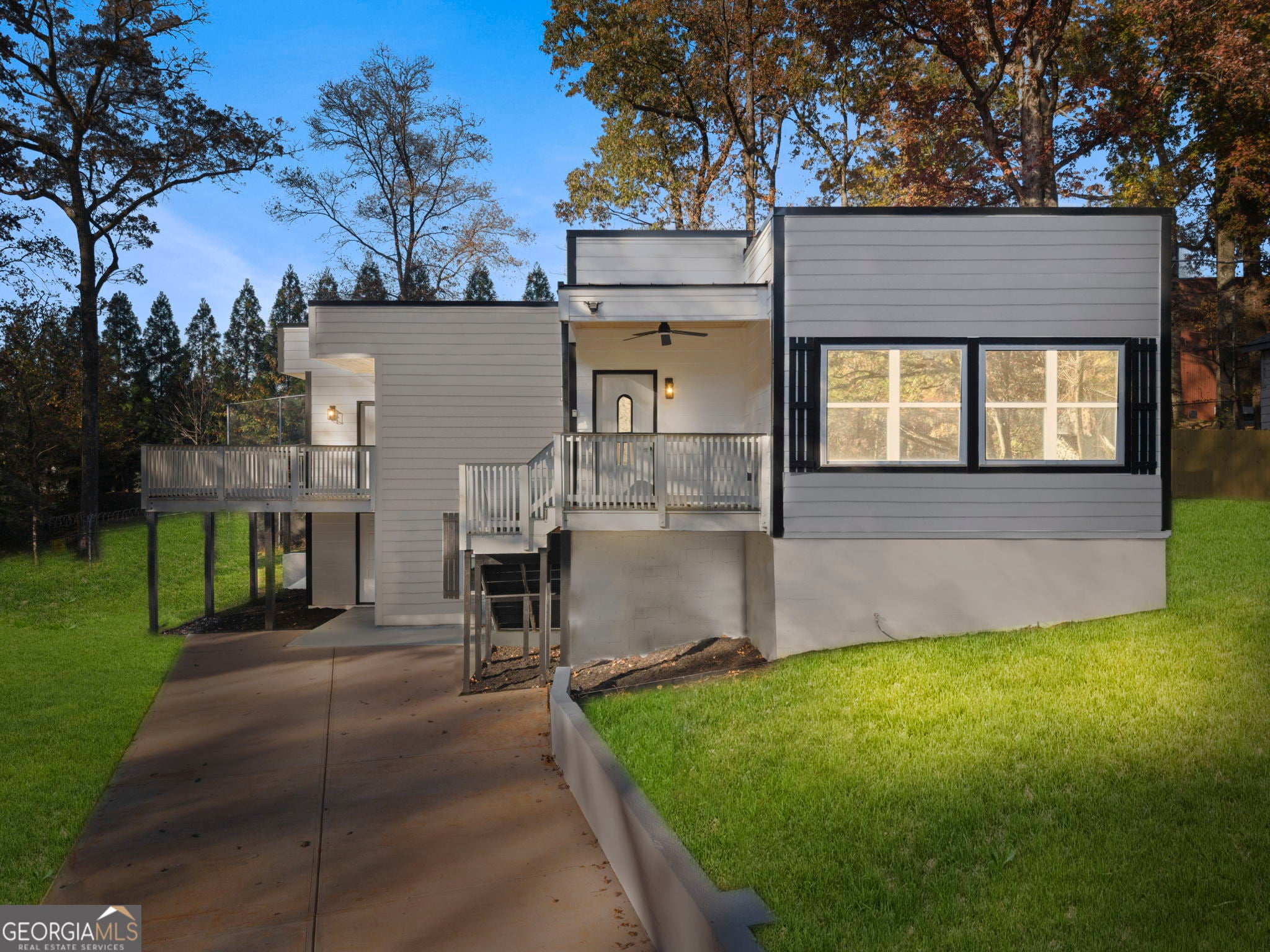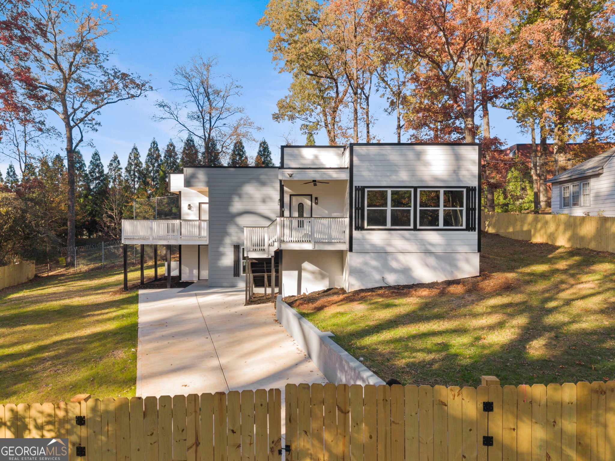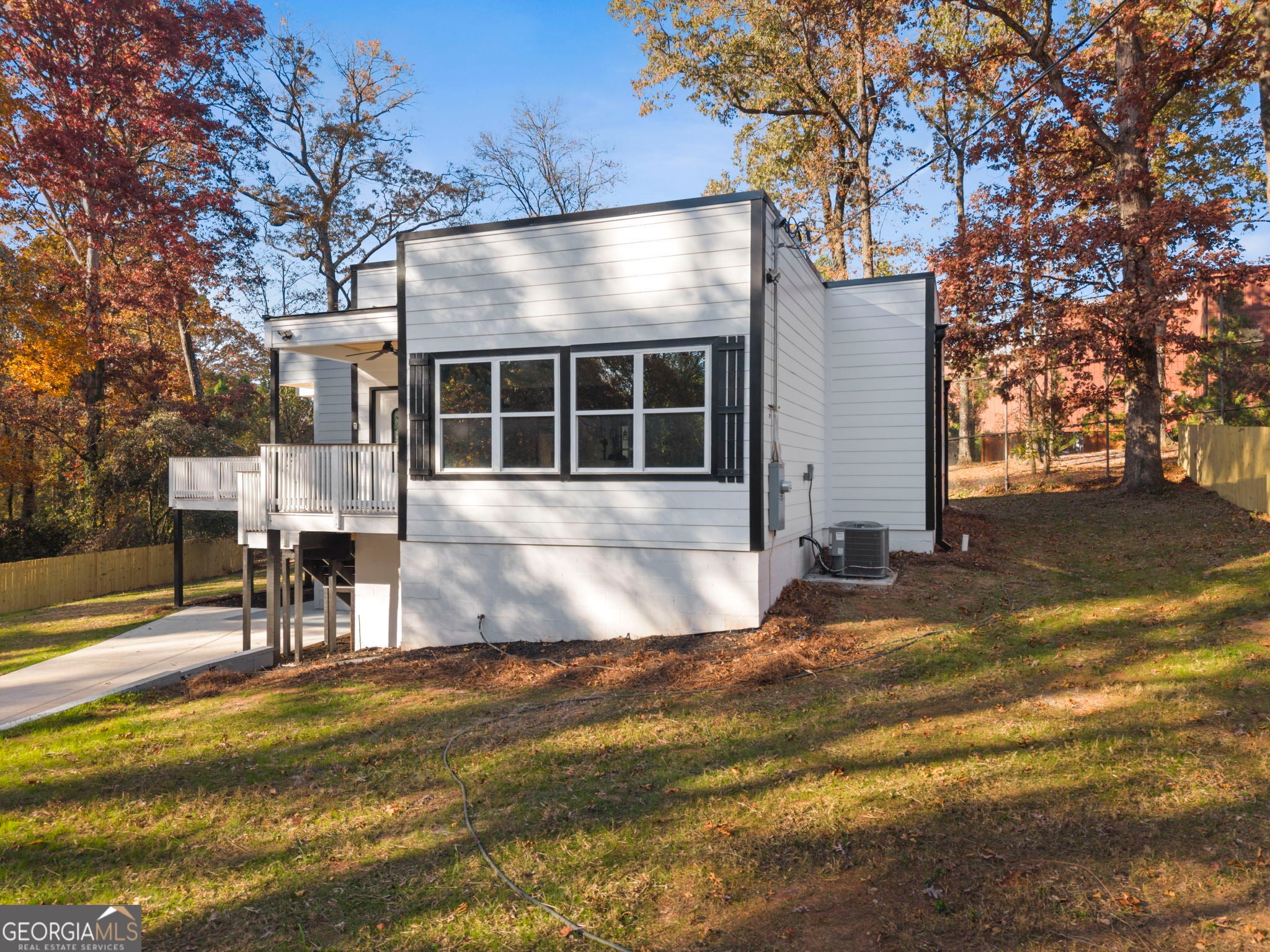 Discover modern living at its finest in this stunning new-construction contemporary home, offering three bedrooms, two bathrooms and an unfinished room. Designed with clean lines and thoughtful details throughout, this property blends style with everyday comfort. Enjoy ultimate privacy with a full wrap-around fence and multiple outdoor spaces to relax. Step out from the primary suite onto your private balcony porch-perfect for peaceful mornings or relaxing evenings. The home also features a spacious deck that flows seamlessly into the interior, along with a second patio ideal for enjoying your morning coffee. Inside, you'll find a beautifully decorated electric fireplace, sleek modern finishes, and an open layout filled with natural light. The brand-new TPO roof ensures energy efficiency and long-lasting durability. An added bonus is the unfinished room with its own private exterior entry-an excellent opportunity for additional income, a home office, studio, or guest suite. This contemporary gem offers comfort, versatility, and exceptional design. A must-see!