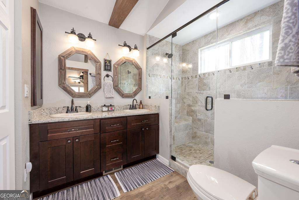 - Interior FeaturesBeamed Ceilings, Double Vanity, High Ceilings, In-Law Floorplan, Master On Main Level, Separate Shower, Tile Bath, Vaulted Ceiling(s)