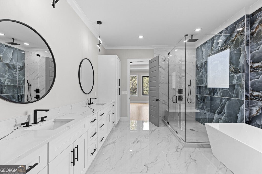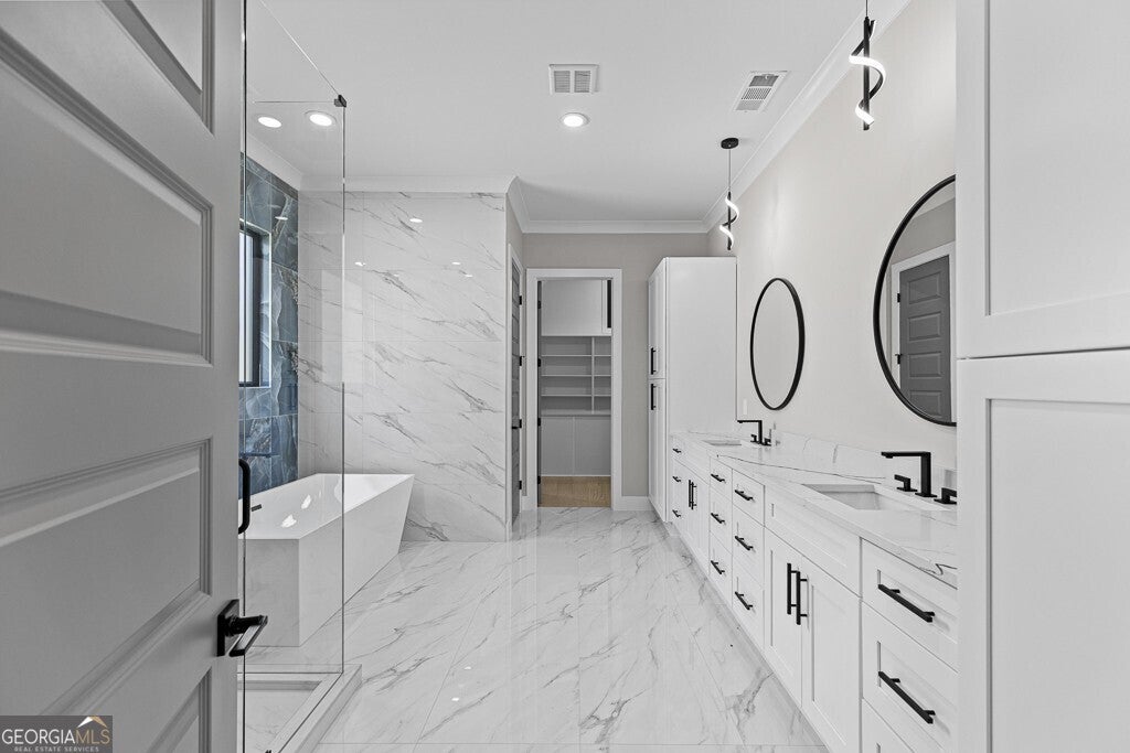 - Interior FeaturesDouble Vanity, High Ceilings, Separate Shower, Soaking Tub, Walk-In Closet(s)
