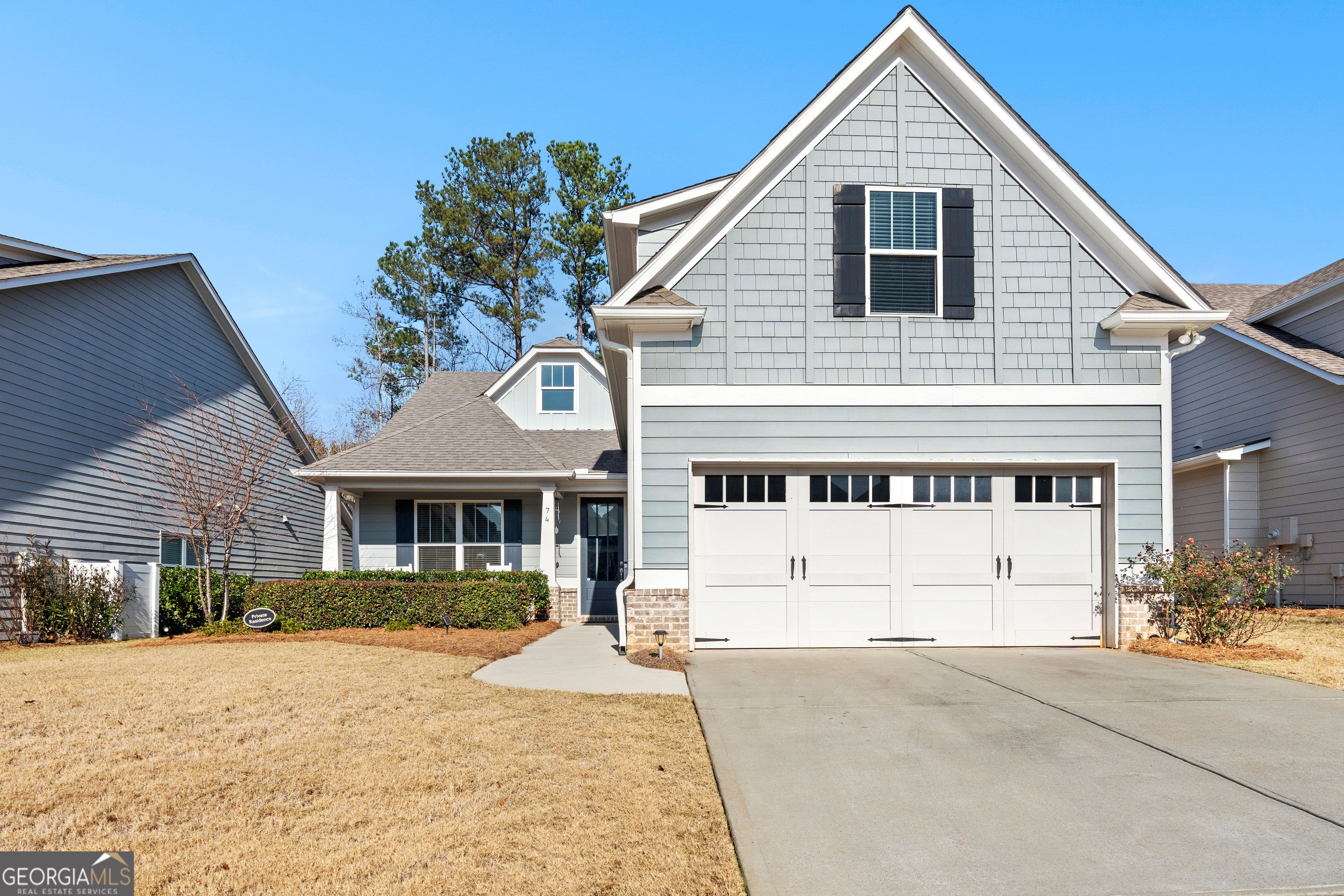 Welcome home to Heritage Pointe at The Georgian, the area's only 55+ gated community. Built in 2018 on one of the most private, wooded lots in the neighborhood, this home offers both charm and functionality. A rocking chair front porch invites you to relax and socialize with neighbors, leading inside through a glazed front door that floods the foyer with natural light. Just off the entry, a quaint space is ideal for an office or personal library. The inviting living area opens to a kitchen featuring a large breakfast island and abundant storage, while a separate dining area provides direct access to the back patio. The spacious primary suite boasts a generous walk-in closet, a bathroom with a separate shower, and a private entrance to the back patio. A secondary bedroom and full guest bathroom complete the main level. Upstairs, a large flex space with a closet is perfect for a secondary living room, entertainment area, or home office. Outside, the covered stone patio with fireplace offers a tranquil retreat overlooking the beautifully wooded, private lot. Residents of The Georgian enjoy a resort-style lifestyle, including a pool with a huge waterslide, golf cart access to The Frog Golf Course designed by Tom Fazio, tennis courts, walking trails, a private clubhouse for events, and much more. Heritage Pointe adds even more perks with an adults-only pool and clubhouse, landscaping maintenance, and trash service. This is West Georgia's premier destination for an active, elevated adult lifestyle.