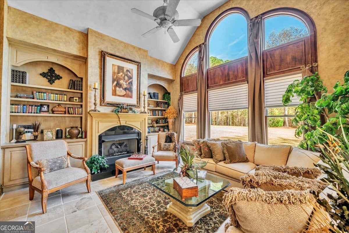 Set on 50 private acres in beautiful Senoia, Georgia, also known as the backdrop of The Walking Dead- this 6,788 SF estate, paired with a remarkable 6,000 SF luxury barn, offers an unparalleled living and entertaining experience just 29 miles from Atlanta and its airport. Impeccably maintained, the 2001 residence exudes Timeless Elegance with Roman columns, soaring ceilings, custom millwork, tray ceilings, expansive bright windows, and a chef's kitchen with JennAir Elite appliances. A dedicated wine cellar and an impressive entertainment room complete with a built-in full bar, leather seating, and wiring for a pull-down screen perfect for sports nights, elevating the home's lifestyle experience. Whole-home surround sound and luxurious finishes throughout create an atmosphere of sophisticated comfort. Designed by the owner, a professional landscaping artist, the outdoor spaces are breathtaking. Stone pathways, custom pergola pavilions, curated gardens, and stone steps with an integrated water feature create a serene, resort-like setting. A stone-tiled deck with a full outdoor kitchen anchors the main gathering area, complemented by a striking stone fireplace ideal for intimate evenings or elegant outdoor celebrations. The barn, a luxury log-cabin-inspired space, features soaring ceilings, a loft terrace, bar, commercial kitchen, surround sound, retractable large screen, full apartment, office, 2 full baths, 3 half baths, outdoor kitchen, recreation areas, and ample storage-perfect for entertaining, events, or farm use. This stunning property has been held by the same family since it was built, and it will mark your heart. Select furniture and equipment are included, adding exceptional value (contact agent for details). This is an incredible opportunity for entertainers, large families, hobby-farm living, or a memorable corporate retreat.