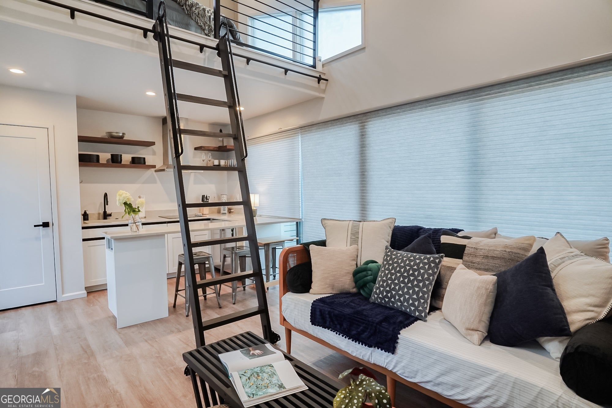 Welcome to Trilith's vibrant community and this fully furnished 550 sq ft micro home! Located directly across from Trilith Studios, this unit is designed for modern style and maximum functionality, ready for immediate occupancy. The main level features a thoughtfully designed living area, a full bathroom with a glass shower, and stackable laundry. The kitchen is perfectly equipped with a two-burner cooktop, compact fridge/freezer, coffee maker, toaster oven, and microwave-ideal for all your needs. A cozy, lofted bedroom is accessed by a ladder and includes smart built-in storage and closet space. Indoor/outdoor living is seamless with large glass sliding doors that open completely to a private back patio, complete with comfortable seating, a bistro set, and a gas grill-perfect for relaxing or entertaining! The unit also boasts a three-foot crawl space beneath, ideal for storage. Enjoy shared amenities like a fire pit and bike storage within the micro-home village. The larger Trilith neighborhood provides walking trails, parks, a pool, basketball/tennis courts, a dog park, and a lake area. Trilith is a state-of-the-art planned community combining modern living with convenience, shops, and restaurants, plus the exciting upcoming Trilith Live! Don't miss this unique opportunity!