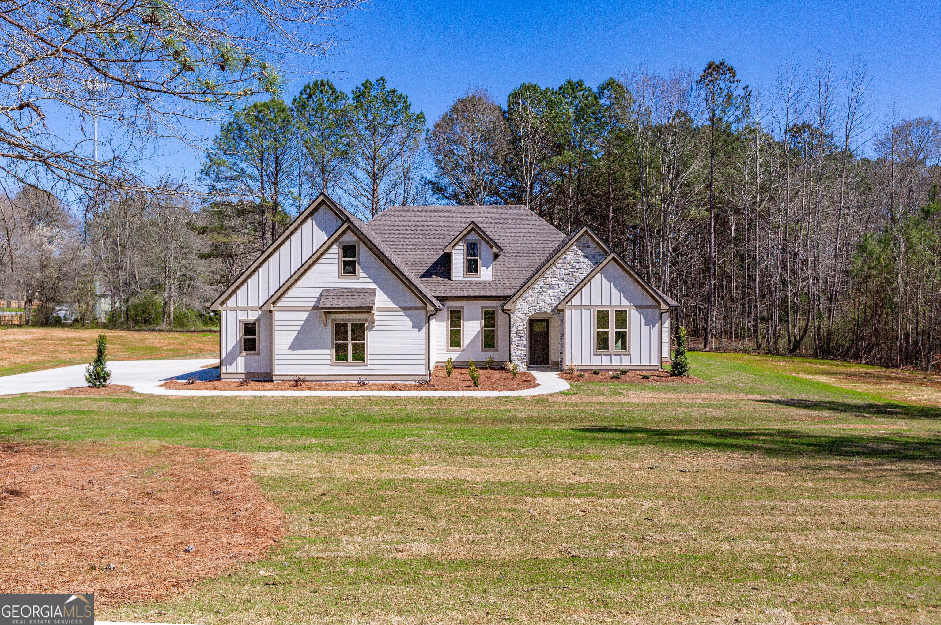 Trademark Quality Homes presents "The Bradford" on over 2 acres, this beautifully designed 4-bedroom, 3-bath ranch offers open-concept living, a split-bedroom layout, and thoughtfully selected finishes throughout. The gourmet kitchen features a large island, quartz countertops, stainless steel appliances, a walk-in pantry, and a separate breakfast area, all overlooking the family room - ideal for both everyday living and entertaining. The private owner's suite with tray ceilings, bath including double vanities, a tiled shower, soaking tub, and a spacious walk-in closet that conveniently connects to the laundry room. Three additional bedrooms and full baths are situated on the opposite side of the home, providing privacy and flexibility. Enjoy the covered back patio overlooking views of the wooded backyard - the perfect place for morning coffee or evening relaxation. This home blends comfort, privacy, and timeless style in a truly special setting. 13 minutes from downtown Senoia.