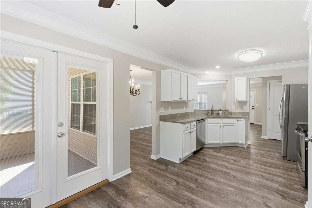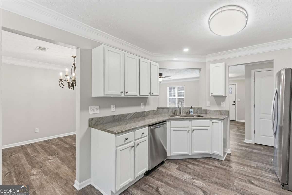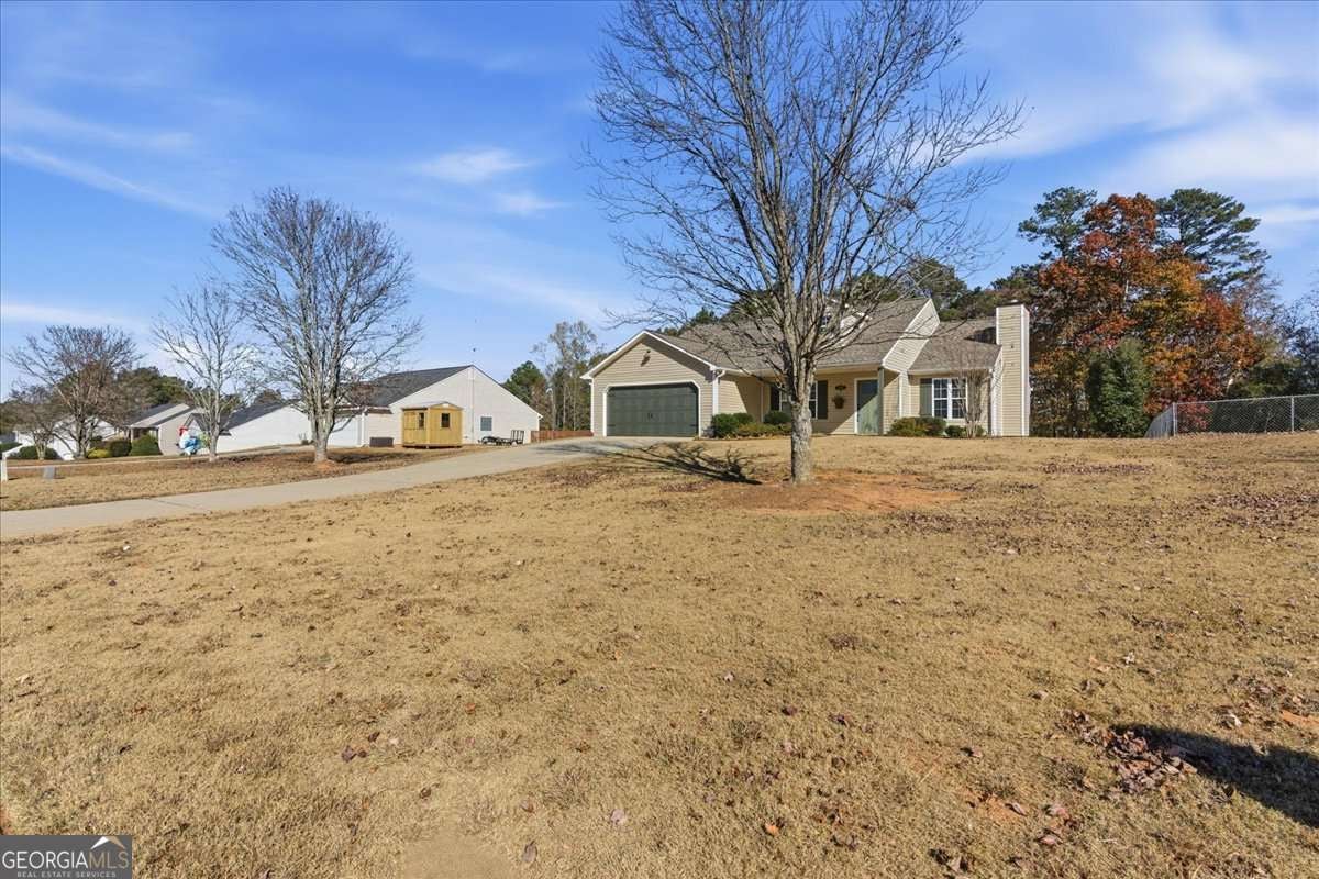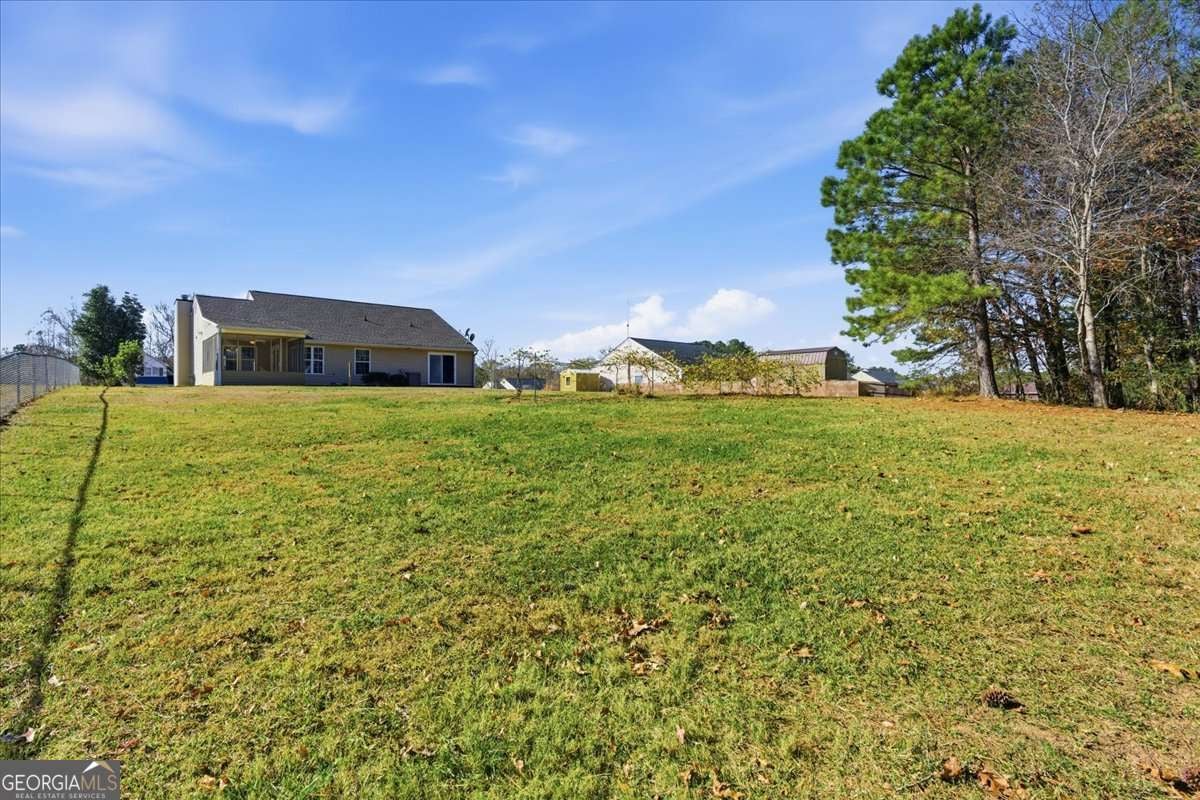 Beautiful stepless ranch featuring 3 bedrooms and 2 bathrooms on just over half an acre. This movein-ready home includes a fresh coat in paint, new roof, new HVAC, and all stainless steel appliances, which will remain with the property along with the stackable washer and dryer. Inside, the home offers brand-new LVP flooring throughout with no carpet, a kitchen with quartz countertops and a view into the living room, and a spacious screened-in porch off the back. The primary suite features a floor-to-ceiling tiled walk-in shower, an oversized walk-in closet, and a sliding screen door with built-in blinds for added privacy. Additional features include a two-car garage with a separate storage room, drop-down attic stairs, a covered back patio, a flat backyard, and a muscadine vine. This home offers convenient, lowmaintenance living with major systems and updates already complete.