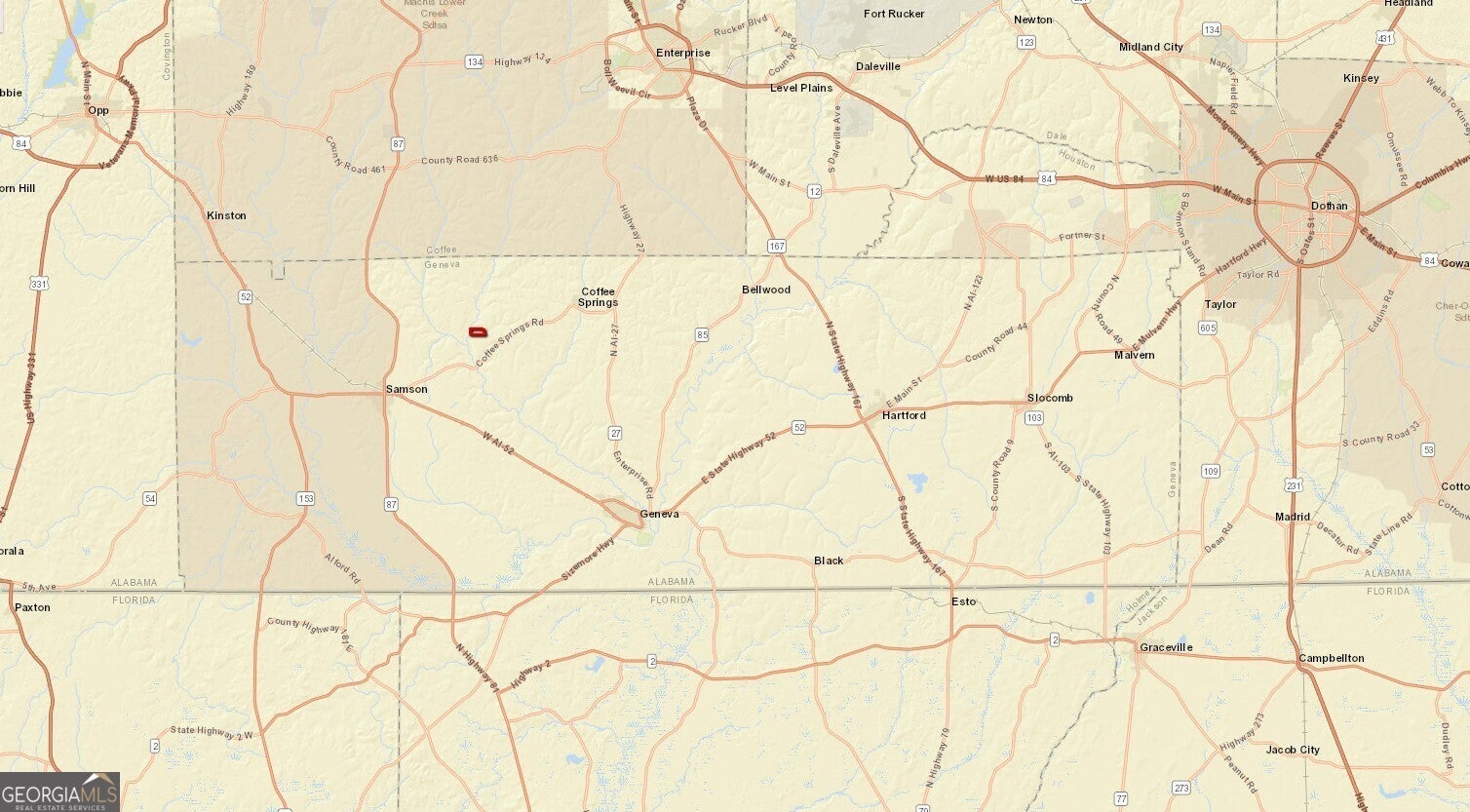 Discover 90 beautiful acres in northern Geneva County, located along Bull Branch Road in Coffee Springs. This property is high and dry with an excellent blend of natural features, making it ideal for a homesite, recreation, or a future rural getaway. A gorgeous buffer of mature oaks and pines stretches along the road frontage, offering natural privacy and a welcoming entrance. The interior of the tract consists primarily of natural loblolly pine, providing multiple options for the next owner-leave it wooded for hunting and outdoor recreation, develop ATV/UTV trails, or clear additional areas for food plots, a garden, or small pasture. Bull Branch winds through the center of the property, adding both character and a reliable water feature for wildlife. The setting is quiet and rural, surrounded by large agriculture and timber holdings, giving you the space and seclusion that's hard to find. Location Highlights: * 10 miles south of Enterprise * 8.5 miles north of Geneva * Approximately 90 miles to the Gulf of Mexico Whether you're looking to build a home, set up a hobby farm, add a hunting tract to your portfolio, or create a family retreat, this property offers the room and flexibility to make it your own.