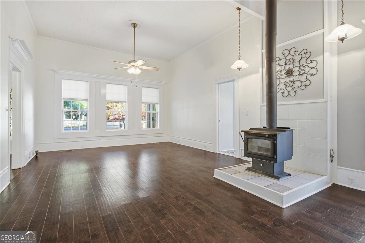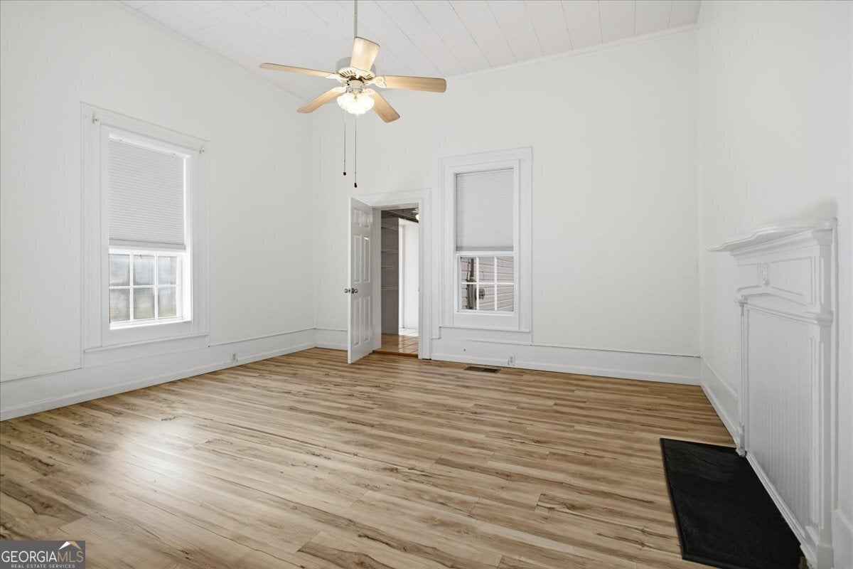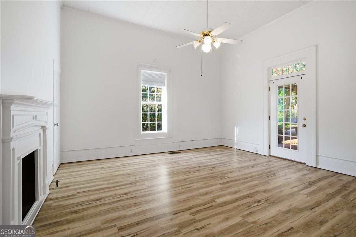 Step into the perfect blend of historic 1900 charm and modern function in this beautifully maintained Senoia property-complete with a versatile guest house, an impressive detached garage, and multiple indoor/outdoor living spaces designed for comfort, creativity, and multi-generational living. The main home features high ceilings, decorative fireplaces, and a welcoming covered front porch with a classic wooden swing. Inside, the living-dining combination offers warmth and character with a wood-burning stove, while an adjoining flex room and bright sunroom add valuable space for work, play, or quiet relaxation. The spacious primary suite includes its own decorative fireplace and a well-appointed bathroom with a soaking tub, separate shower, dual sinks, and a large walk-in closet with built-in shelving. A secondary bedroom-also featuring a decorative fireplace-adds even more historic appeal. The main home also includes a secondary bathroom. The country kitchen provides an ideal workspace with a walk-in pantry, breakfast bar, gas cooktop, wall oven, dishwasher, and generous cabinet storage. A large laundry room just off the kitchen includes extra counter space, cabinetry, and a wash sink for added convenience. Connected by a covered walkway, the guest house is perfect for in-laws, visitors, or rental income. It includes a kitchen (with refrigerator and dishwasher), a main-level bedroom and bathroom with its own washer and dryer, plus an upstairs bedroom with a vaulted ceiling. With its own electric meter, electric HVAC on the main level, and a window unit upstairs, the guest house offers independent comfort and functionality. Out back, a fenced yard provides room to garden, relax, or entertain-complete with a garden area, firepit, and a converted covered patio (formerly a carport) that creates the perfect outdoor gathering space. For hobbyists, contractors, or storage needs, the large detached garage is a major highlight. Outfitted with electricity and divided into two spaces-a front hobby-room style area and a large workshop with garage doors at both sections-it offers the kind of flexibility and square footage rarely found in homes of this era. The driveway also provides ample parking for guests, equipment, or multiple vehicles. Located just moments from Senoia's popular shopping, dining, and local attractions, this property delivers the ideal mix of convenience, versatility, and timeless charm.