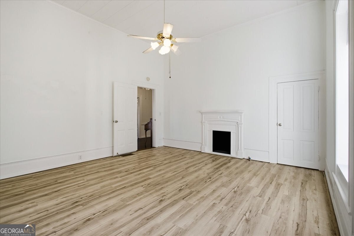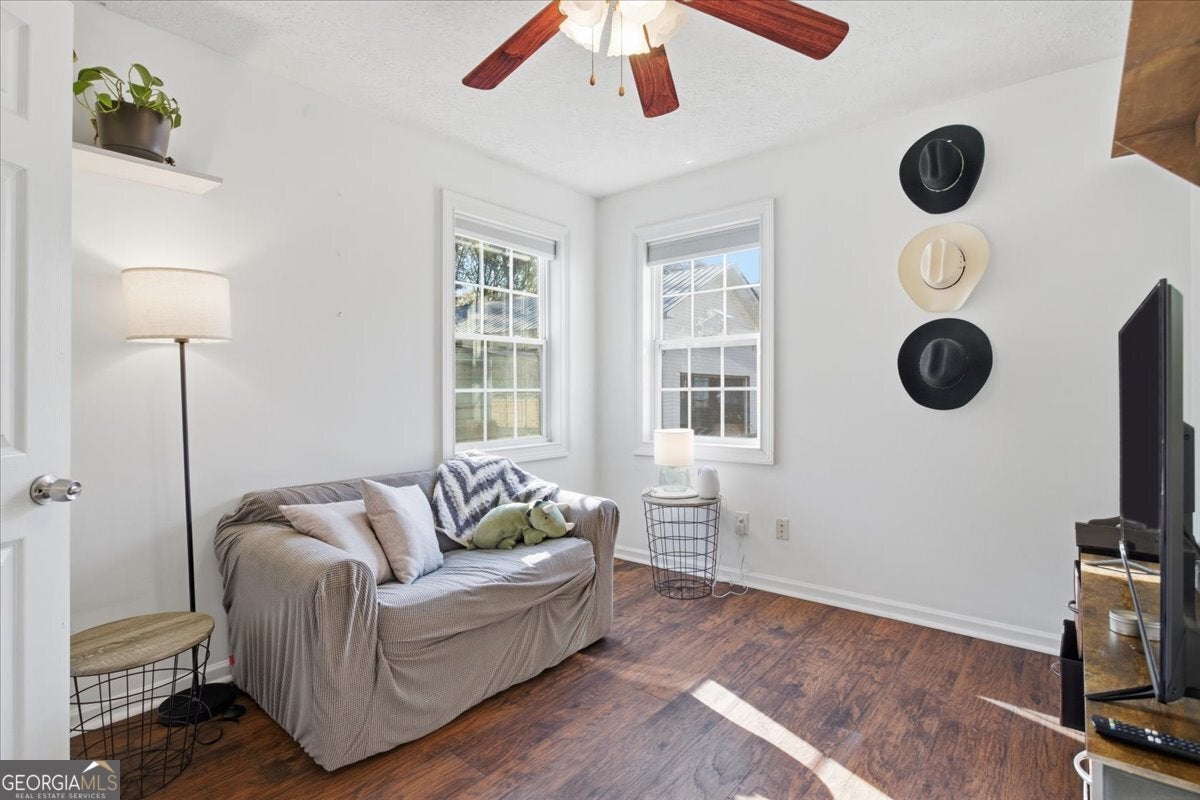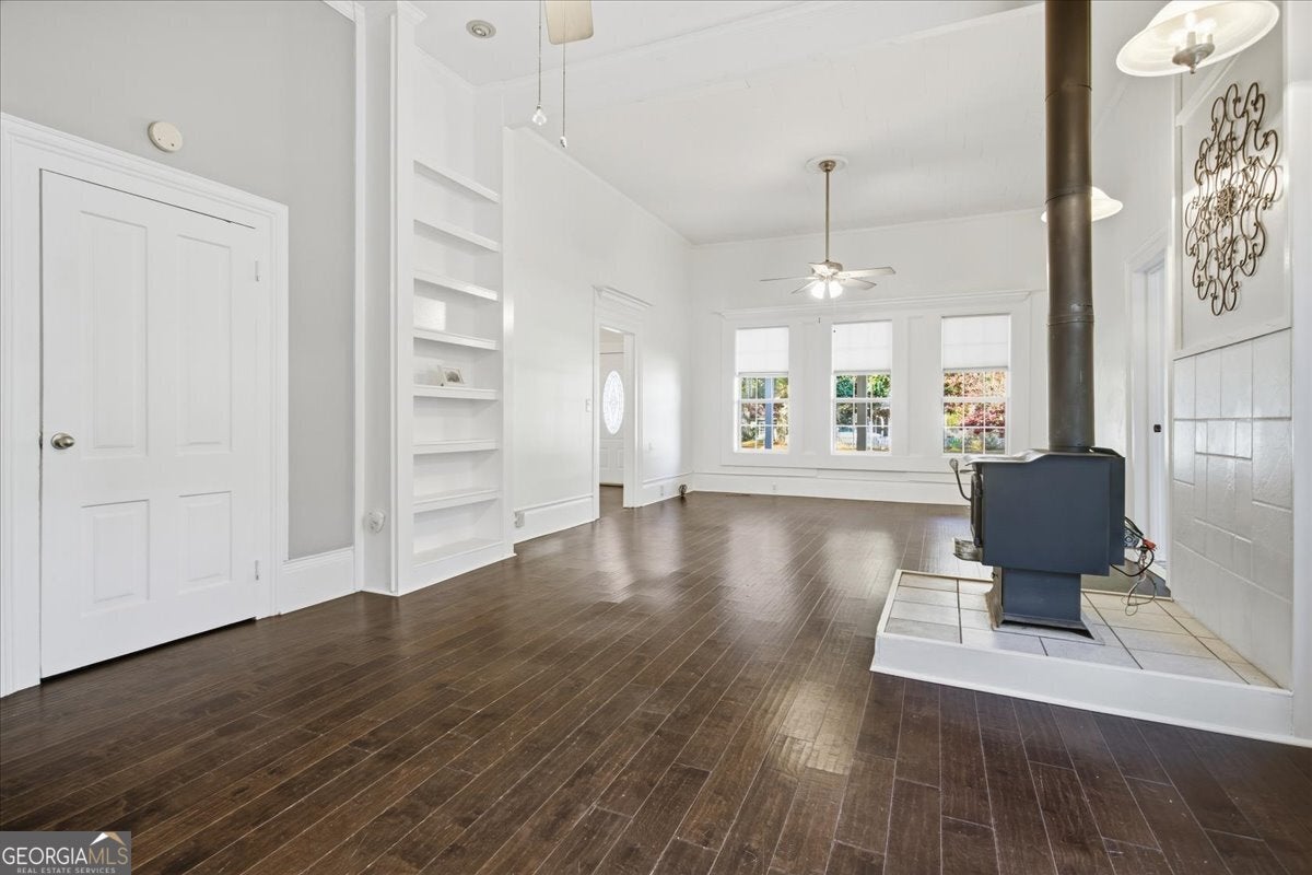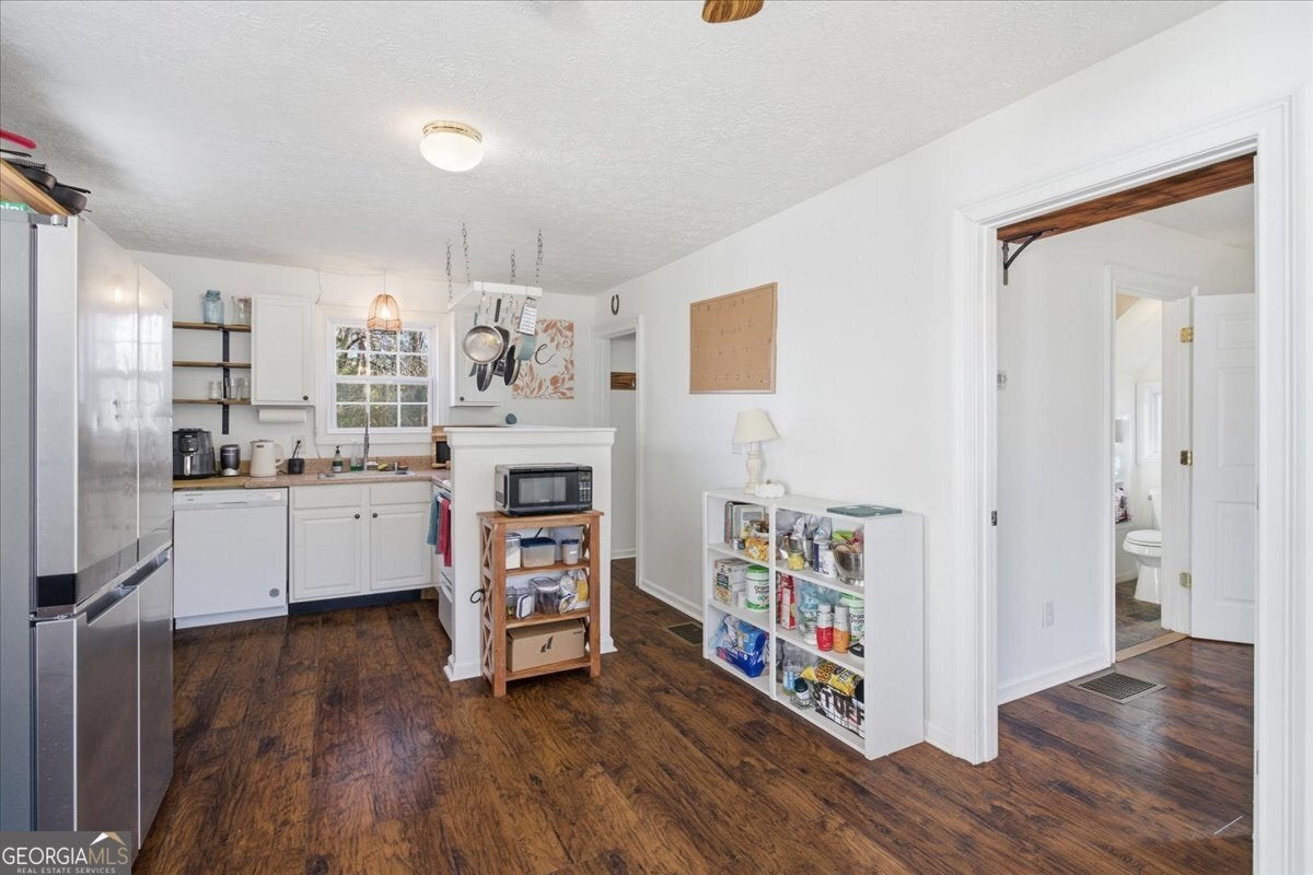 Step into the perfect blend of historic 1900 charm and modern function in this beautifully maintained Senoia property-complete with a versatile guest house, an impressive detached garage, and multiple indoor/outdoor living spaces designed for comfort, creativity, and multi-generational living. The main home features high ceilings, decorative fireplaces, and a welcoming covered front porch with a classic wooden swing. Inside, the living-dining combination offers warmth and character with a wood-burning stove, while an adjoining flex room and bright sunroom add valuable space for work, play, or quiet relaxation. The spacious primary suite includes its own decorative fireplace and a well-appointed bathroom with a soaking tub, separate shower, dual sinks, and a large walk-in closet with built-in shelving. A secondary bedroom-also featuring a decorative fireplace-adds even more historic appeal. The main home also includes a secondary bathroom. The country kitchen provides an ideal workspace with a walk-in pantry, breakfast bar, gas cooktop, wall oven, dishwasher, and generous cabinet storage. A large laundry room just off the kitchen includes extra counter space, cabinetry, and a wash sink for added convenience. Connected by a covered walkway, the guest house is perfect for in-laws, visitors, or rental income. It includes a kitchen (with refrigerator and dishwasher), a main-level bedroom and bathroom with its own washer and dryer, plus an upstairs bedroom with a vaulted ceiling. With its own electric meter, electric HVAC on the main level, and a window unit upstairs, the guest house offers independent comfort and functionality. Out back, a fenced yard provides room to garden, relax, or entertain-complete with a garden area, firepit, and a converted covered patio (formerly a carport) that creates the perfect outdoor gathering space. For hobbyists, contractors, or storage needs, the large detached garage is a major highlight. Outfitted with electricity and divided into two spaces-a front hobby-room style area and a large workshop with garage doors at both sections-it offers the kind of flexibility and square footage rarely found in homes of this era. The driveway also provides ample parking for guests, equipment, or multiple vehicles. Located just moments from Senoia's popular shopping, dining, and local attractions, this property delivers the ideal mix of convenience, versatility, and timeless charm.