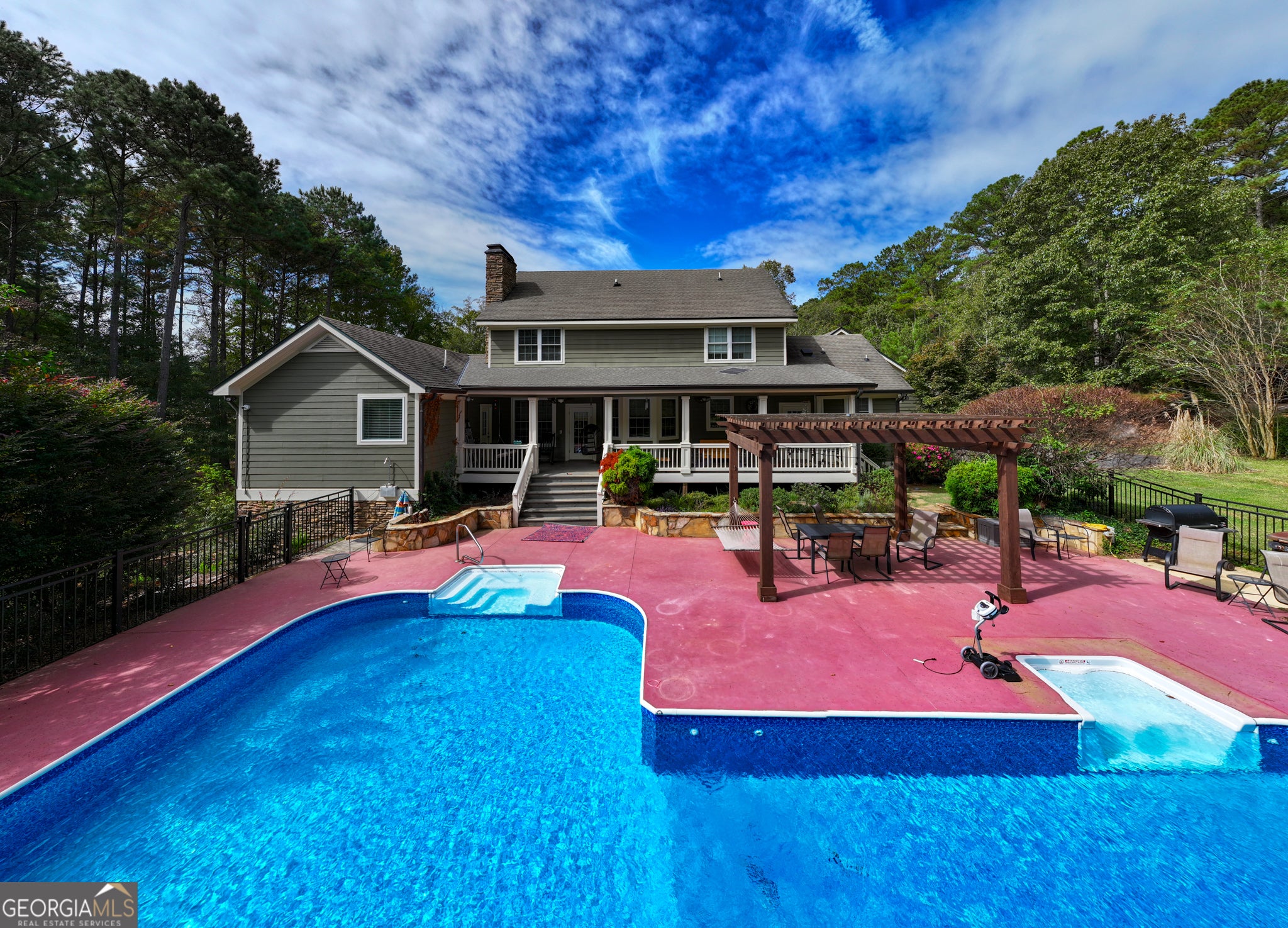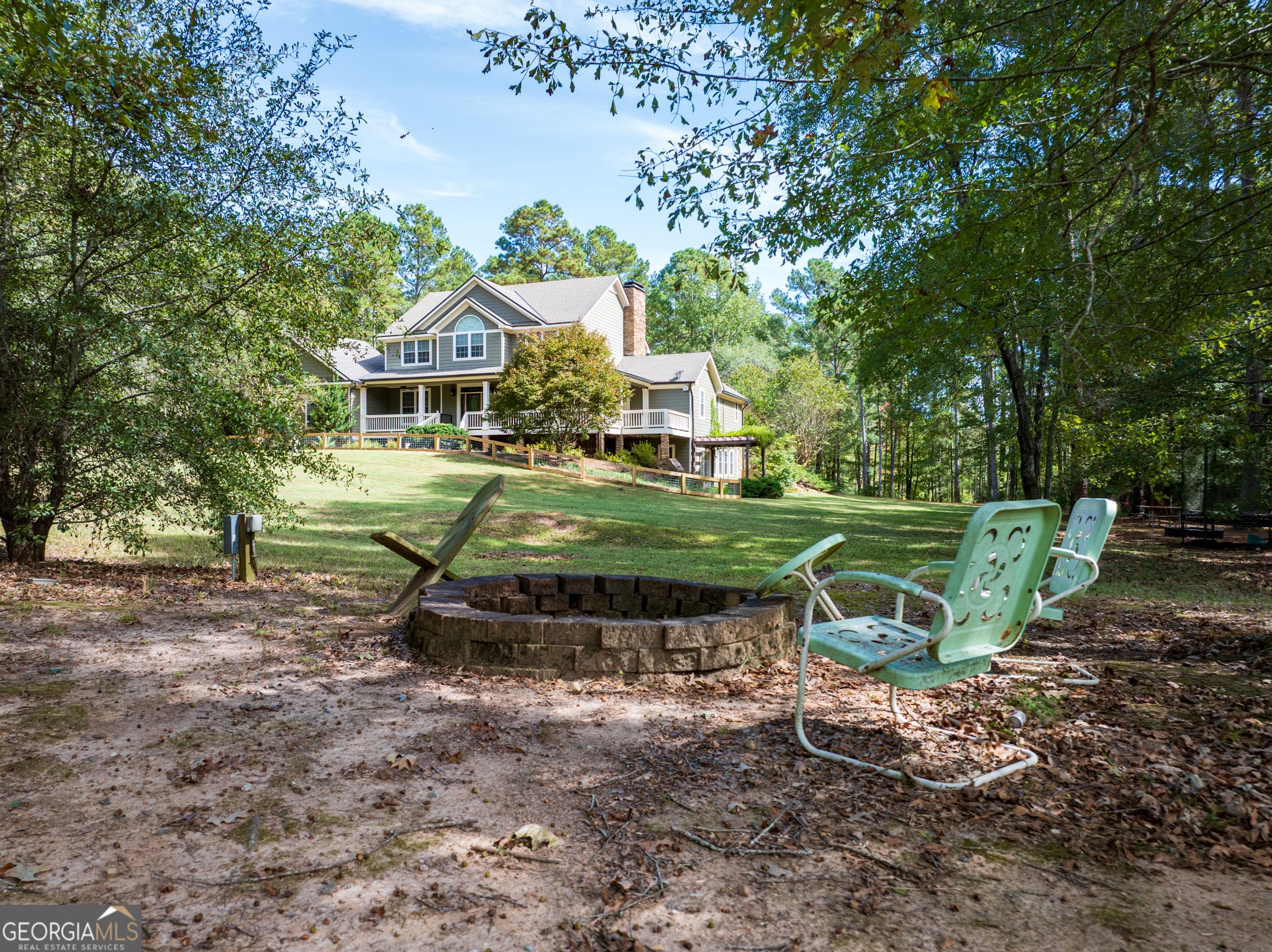 Welcome to The Jordans' Gentlemen's Sustainable Family Compound-an extraordinary 175-acre estate located along Roosevelt Highway in Warm Springs, Meriwether County. Just one hour from Atlanta yet worlds away in tranquility, natural beauty, and refined country living, this exceptional property blends sophistication with private rural retreat. Beyond the gated entrance, a 4-acre pasture to the right and mature woods to the left frame a long, picturesque approach revealing an impressive custom-built residence crafted with exceptional detail. The home features 6 bedrooms, 5 full baths, 5,482 square feet of elegant living space, and a fully finished terrace level designed for both relaxation and entertainment. A gracious wraparound porch overlooks fenced paddocks and a charming play area, while inside, a grand foyer opens to exquisite living spaces adorned with hardwood floors, bespoke millwork, and a stunning great room with a wood-burning fireplace and sweeping views of the gorgeous pool area. The back deck pool area offers sparkling saltwater pool, 8 ft deep for water slide fun; large hot tub, pergola, and expansive grilling terrace. The chef's kitchen is a true showpiece, offering a Viking double range with hood, abundant granite countertops, a generous island, breakfast bar, and seamless flow for entertaining. Behind the kitchen, a large mudroom-ideal for farm life-includes an ample laundry area. The hallway leads to stairs near the side entrance and opens to a large bonus bedroom filled with natural light. At the front of the home, the formal dining room captures breathtaking pasture views. The luxurious main-level owner's suite includes a sitting area with wood burning fireplace, direct access to both the back and side porches, soaring ceilings, intricate woodwork, a large walk-in closet, and a spa-inspired bath with soaking tub, double vanities, and a beautifully designed shower. Upstairs, three serene bedrooms enjoy sweeping views of the pool and pastures, complemented by a secondary living room and two full baths. The terrace level features a cinema lounge, game room, full bath, sauna, steam box, secure gun room, large office, and open spaces. The residence include an entire house propane generator for added convenience and safety. The property's amenities extend well beyond the main residence, including a climate-controlled 6,000-square-foot gymnasium with a basketball court, kitchenette, fitness zone, rock-climbing wall, and full bath. Several outbuildings, Barn #1 30'x40'x10', Barn #2- 68'x40' with lean-to, Barn #3- 40'x38' with electricity and water; a 63' x 40' covered RV shelter; fenced outdoor pavilion with a wood-burning fireplace, water & electricity, and large fenced in garden area with access to water. There are 3 wells on the property; 1- house- 2- near Riding Arena and 3- near barns. Equestrians will appreciate the 33,000 SF riding arena with outdoor lighting, well-designed horse barn with 3 stalls, feed and tack rooms, fans, lighting, feed storage and an attached paddock that leads to expansive 8 paddocks- equipped with shelters, electricity, and automatic waterers. Plus, a separate gated farm entrance opens up to 1.9 acre fenced crop growing area with water and completing the landscape is a fully irrigated and fenced 3/4-acre blueberry field bursting with seasonal harvests. Beyond the paddocks, pond with aerator, over 2,000 feet of the year-round Warm Springs Branch- and approximately 75 acres of mature woods for a private hunting experience creating an opportunity to own one of the region's most comprehensive and distinctive legacy compounds. INTERACTIVE MAP AVAILABLE UPON REQUEST. Travel Times: 10 minutes to Roosevelt Memorial airport~ 45 minutes to Newnan & Peachtree City~1 hr to Hartsfield ATL Int. Airport ~ 35 minutes to LaGrange~ 50 min. to Columbus~ Florida Friends: 4 hrs Panhandle~ 6.5 hrs Tampa, & 9 hrs Boca Raton. Alabama Neighbors: 1 hr to Auburn *~Talladega~ 2.45 hrs to Birmingham.