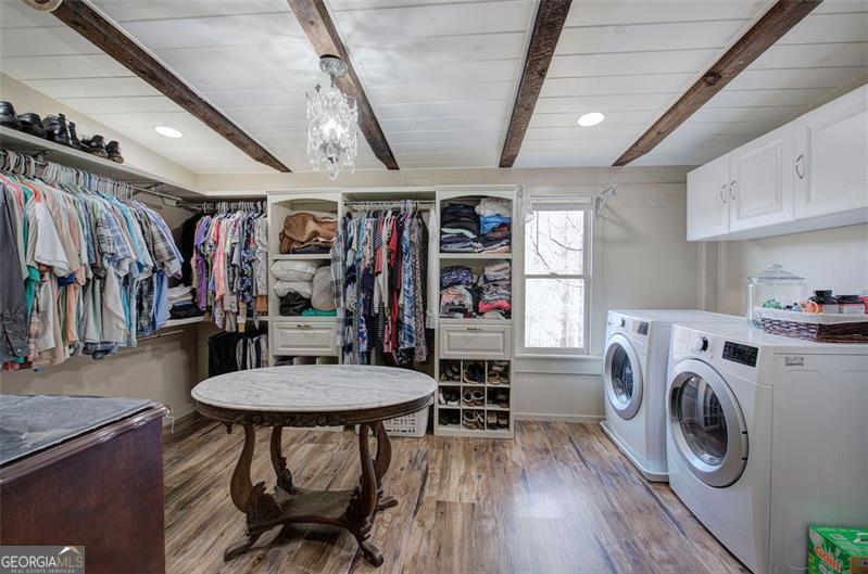 - Interior FeaturesHigh Ceilings, Double Vanity, Beamed Ceilings, Soaking Tub, Separate Shower, Walk-In Closet(s)